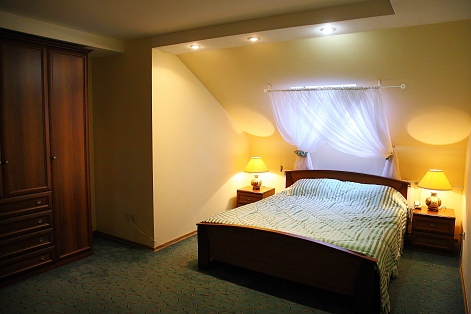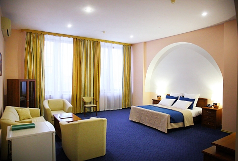 В номере: зеркало, кровать двуспальная, набор мягкой мебели, прикроватные тумбочки, стол, столик журнальный, столик туалетный, стул, шкаф, мини-холодильник, телевизор ЖК, телефон