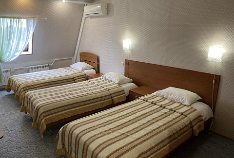 В номере: зеркало, кровати односпальные /одна двуспальная кровать, прикроватные тумбочки, стол, стулья, шкаф, телевизор, телефон, холодильник