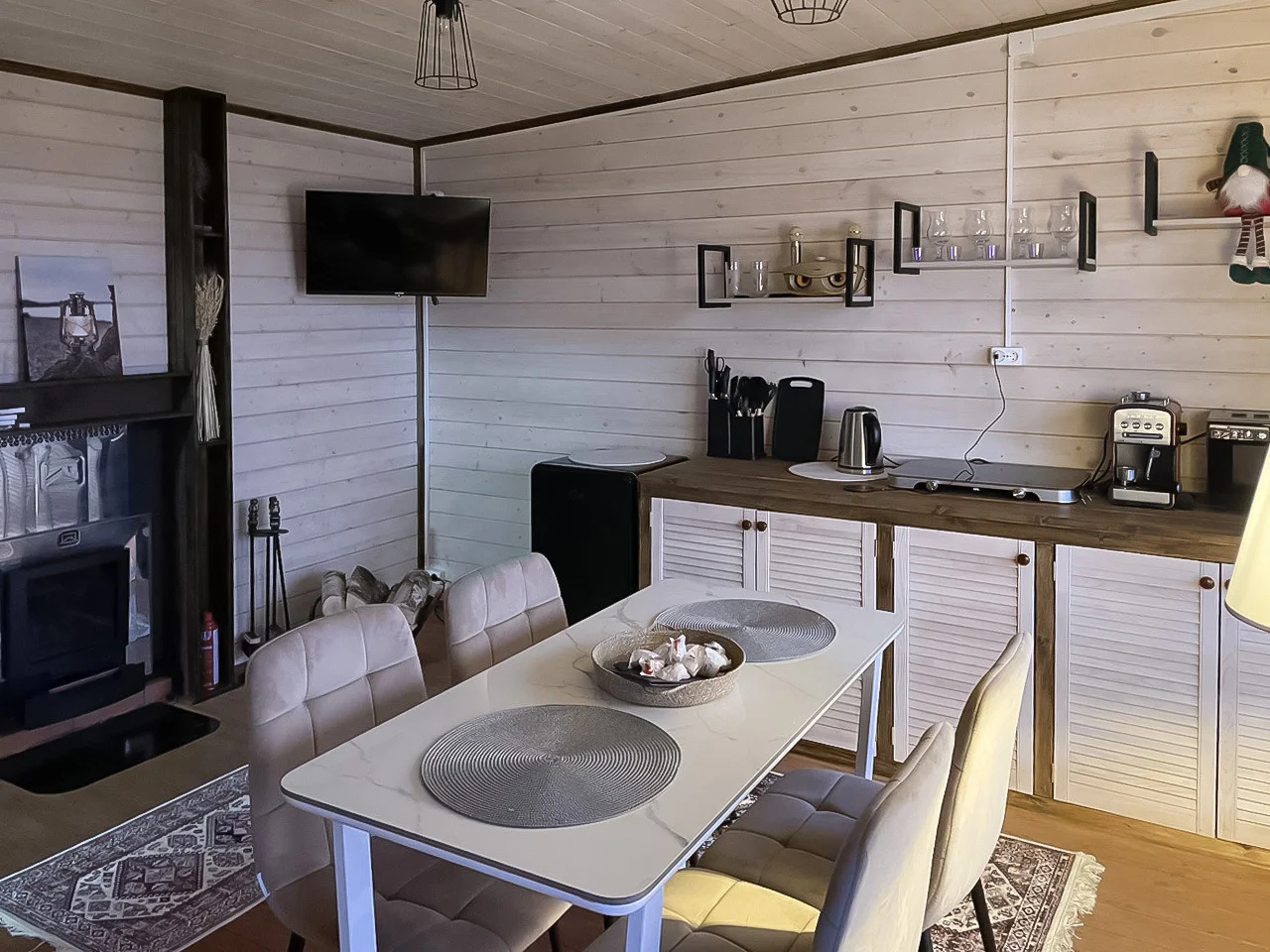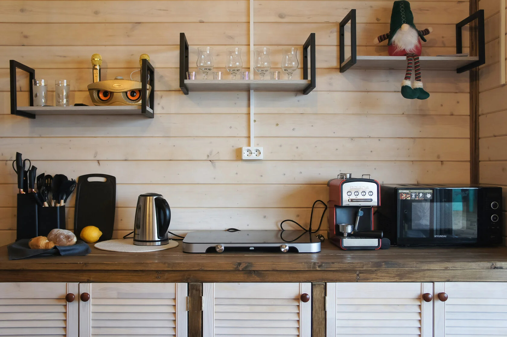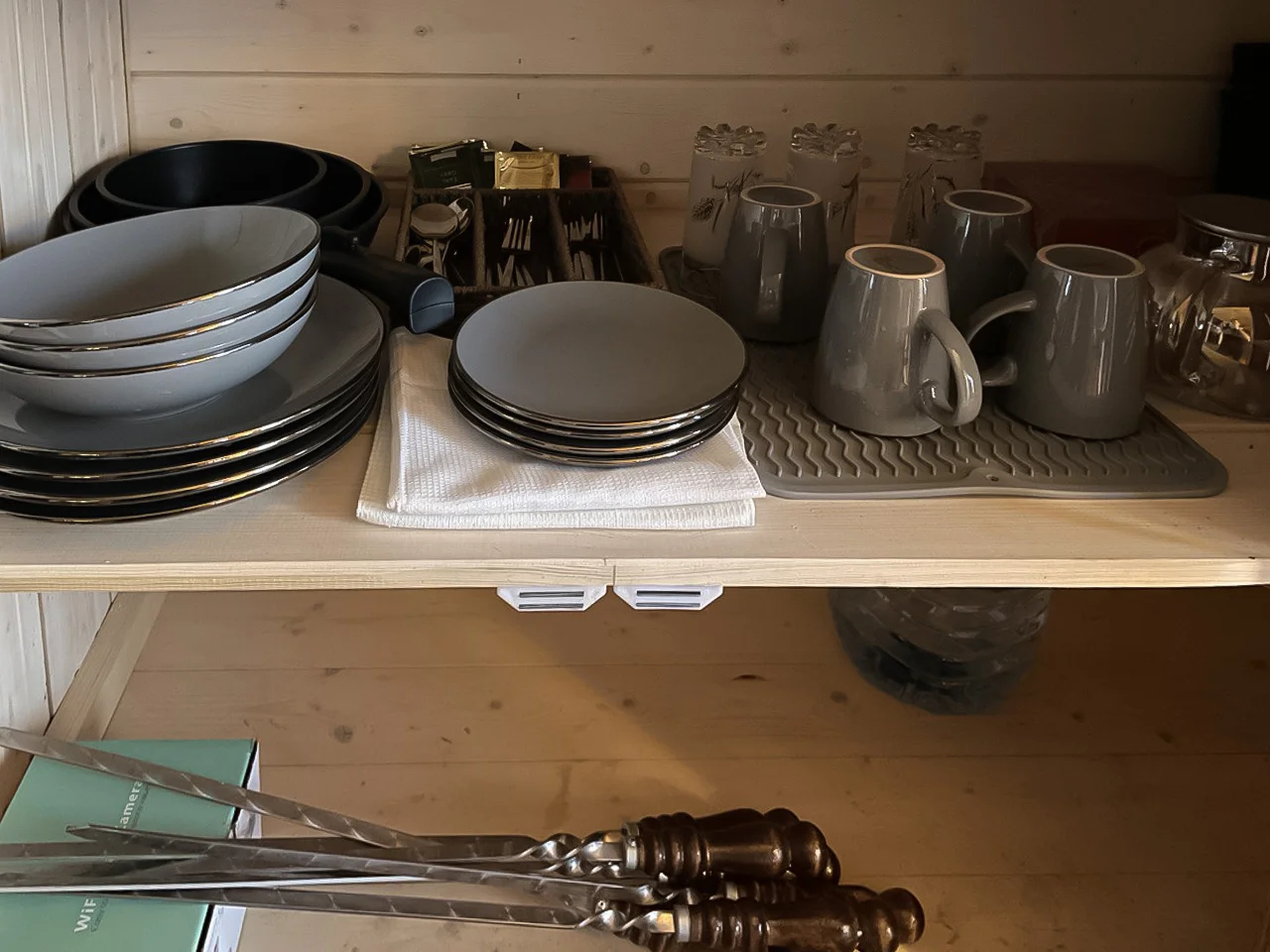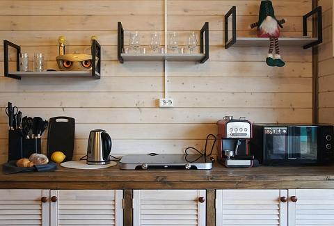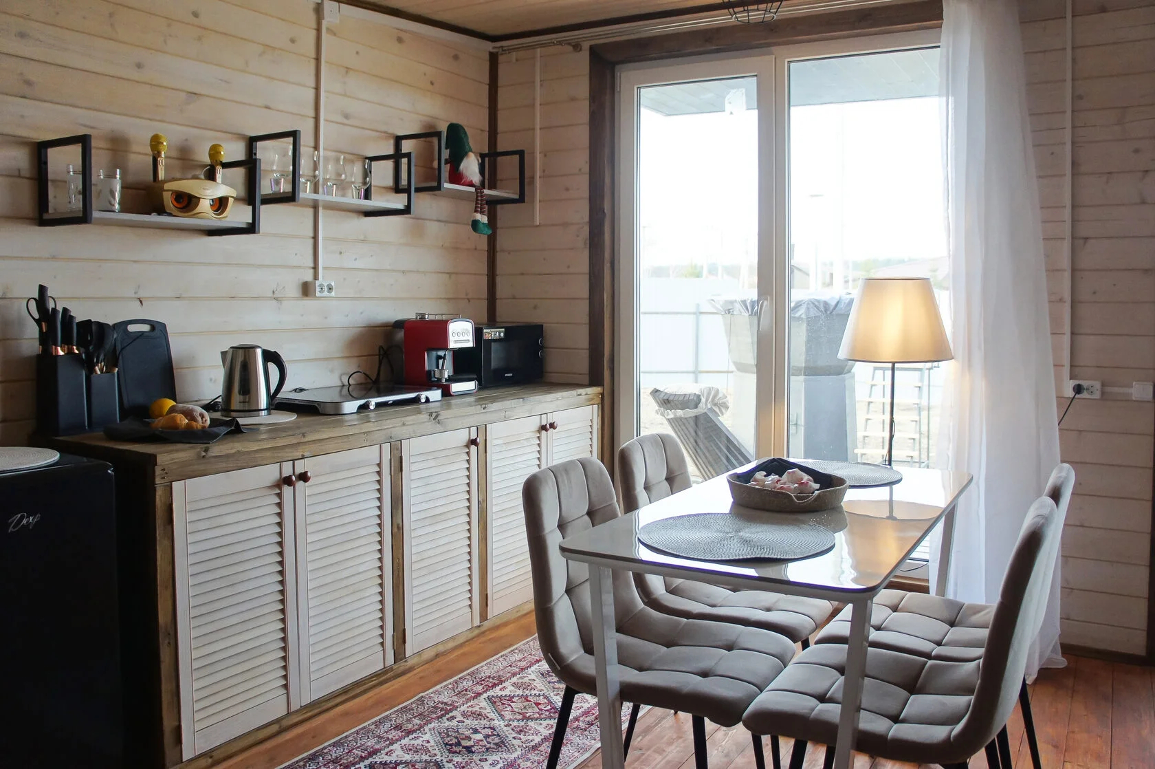 В номере: диван, зеркало, кровать двуспальная, прикроватные тумбочки, стол, стулья, шкаф, микроволновая печь, набор посуды, плита электрическая, телевизор ЖК, холодильник, чайный набор посуды, электрочайник