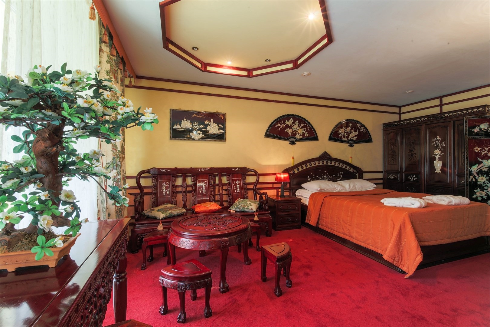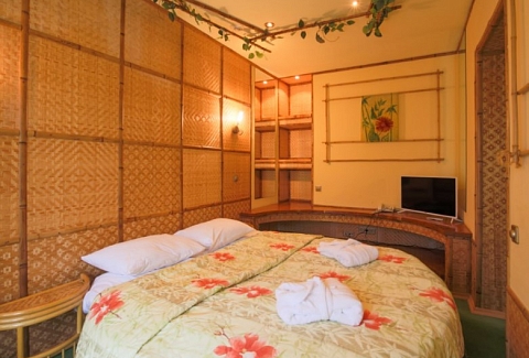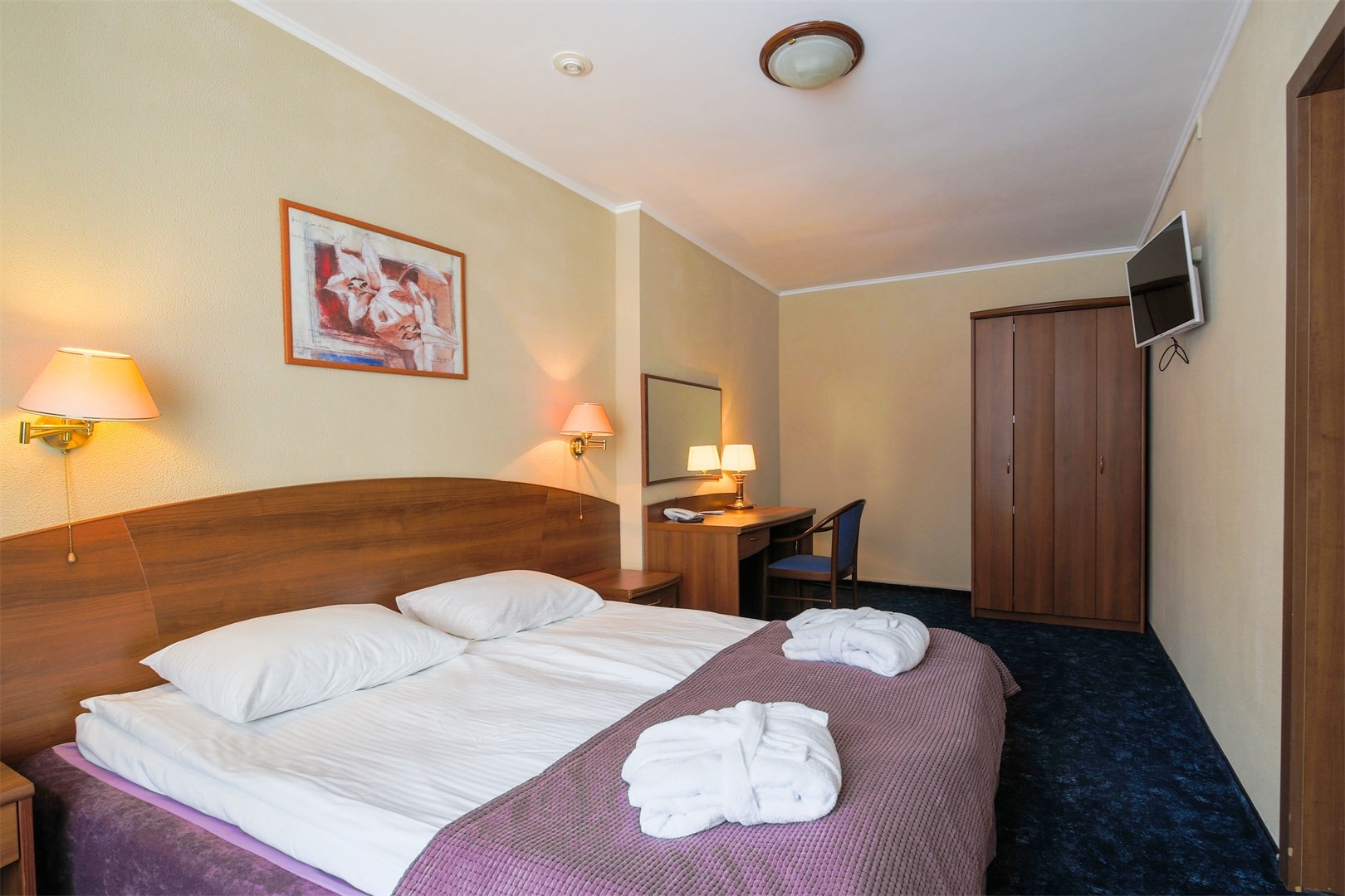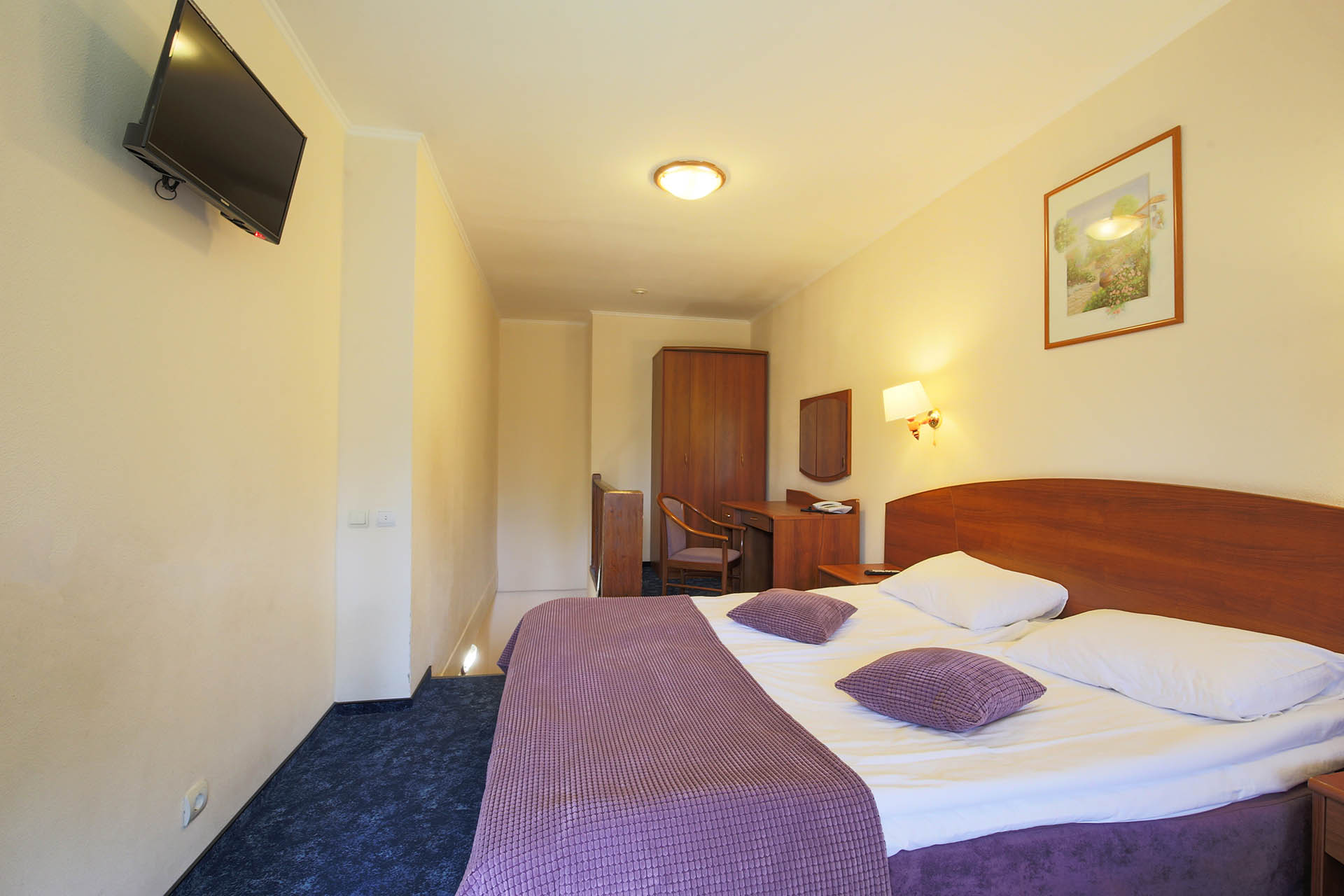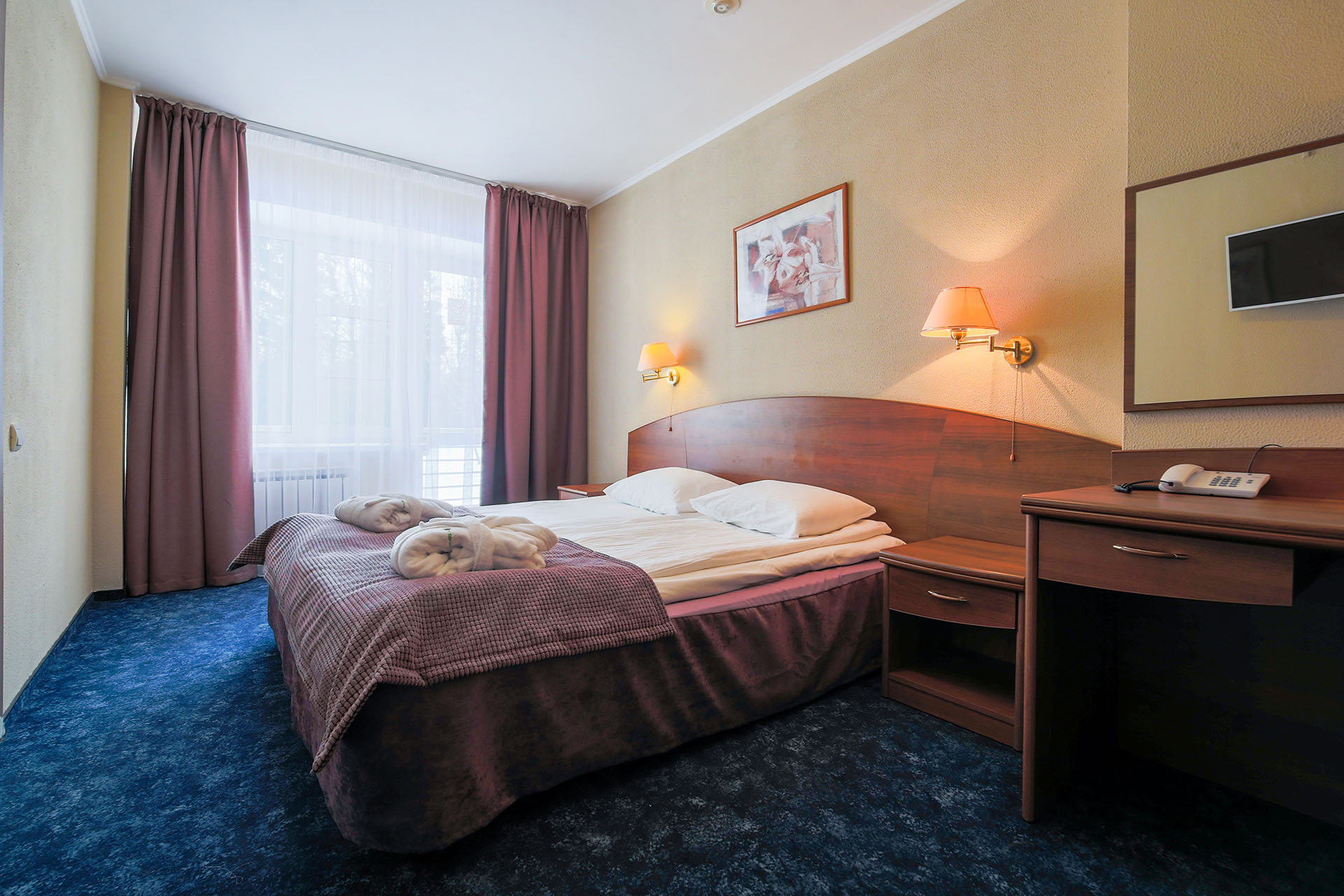 В номере: вешалка, зеркало, кровать двуспальная, прикроватные тумбочки, столик туалетный, шкаф, мини-холодильник, телевизор ЖК, телефон, чайный набор посуды, электрочайник