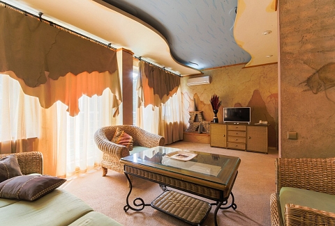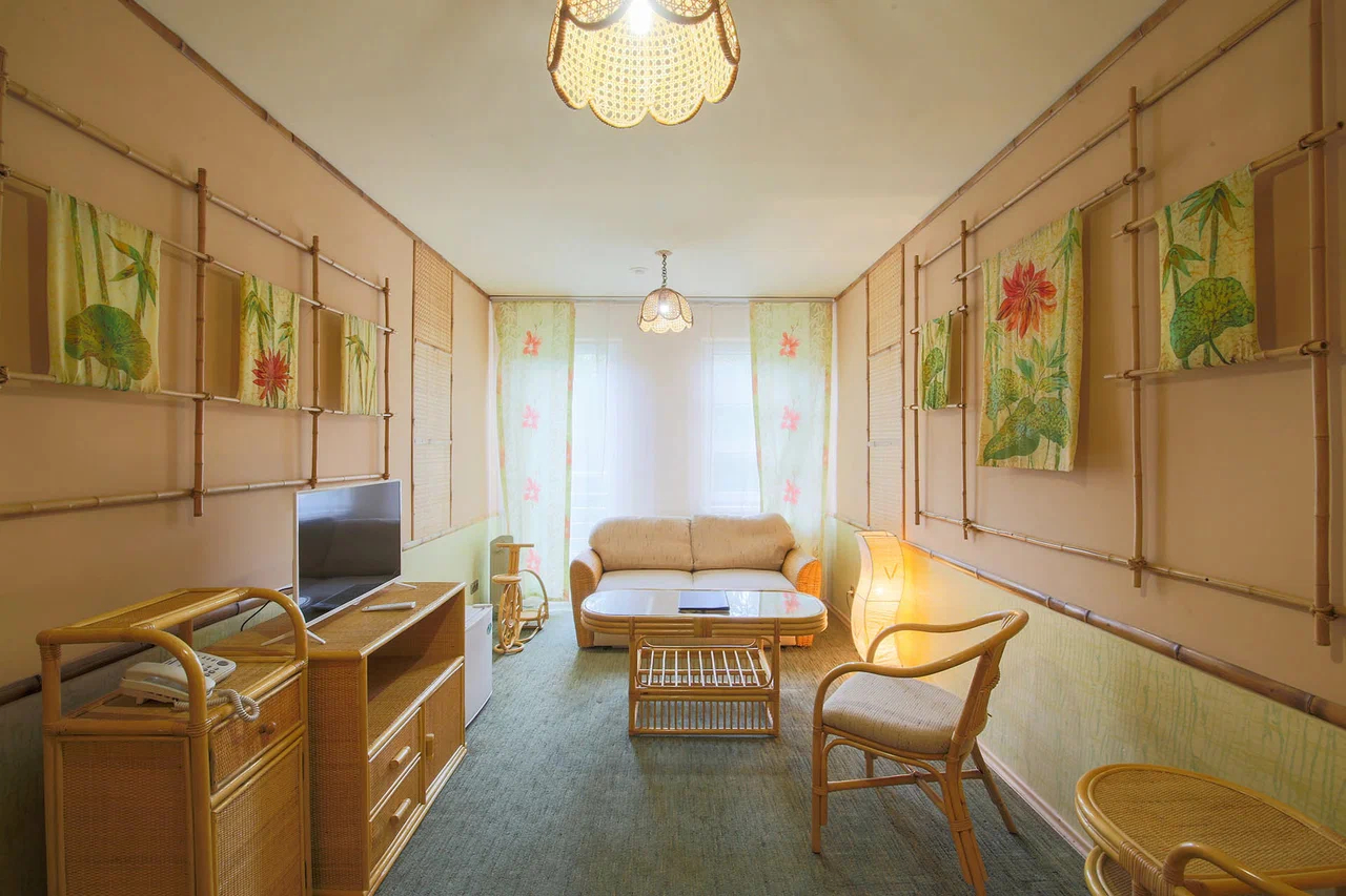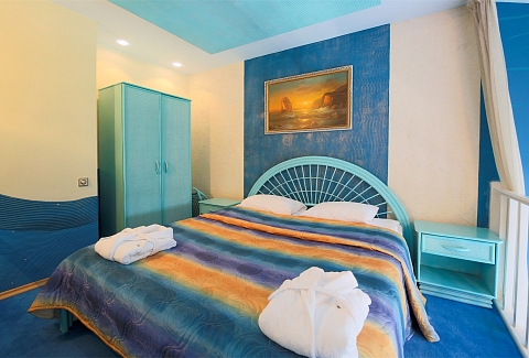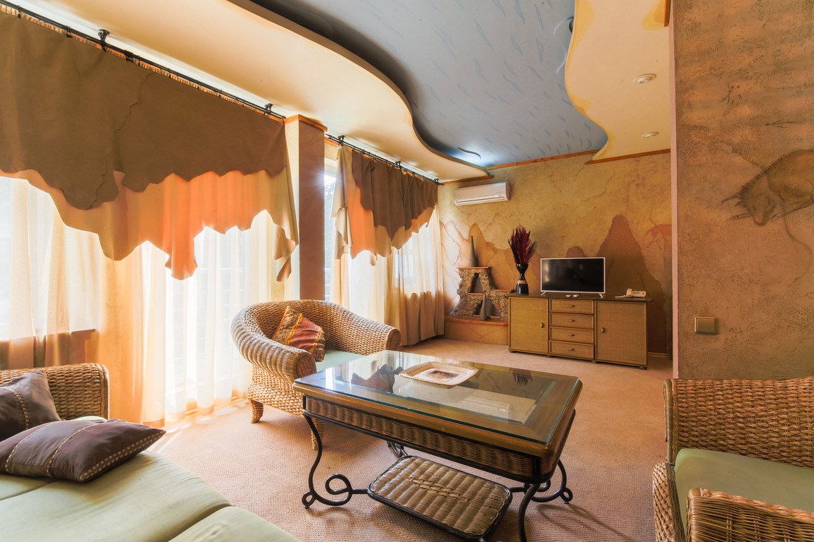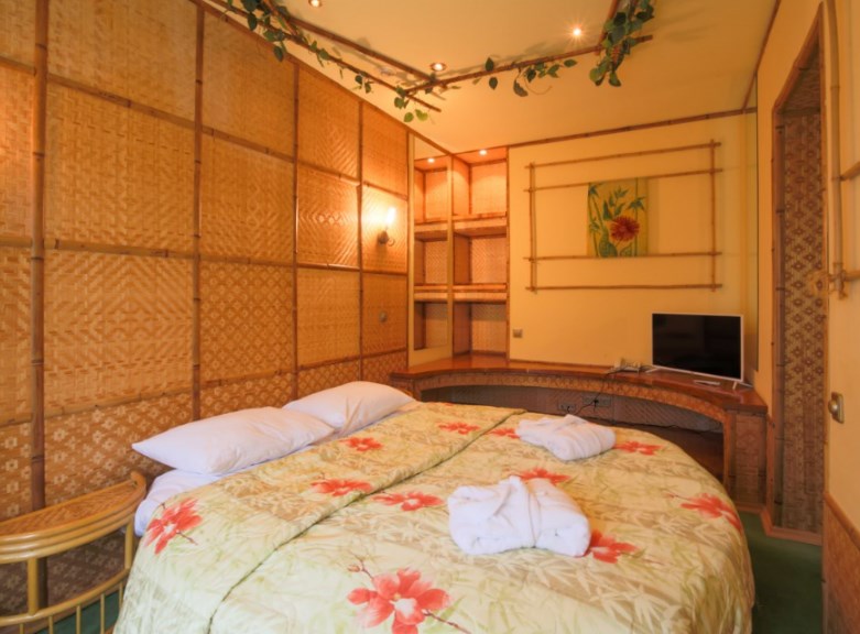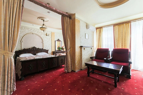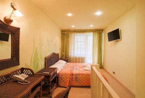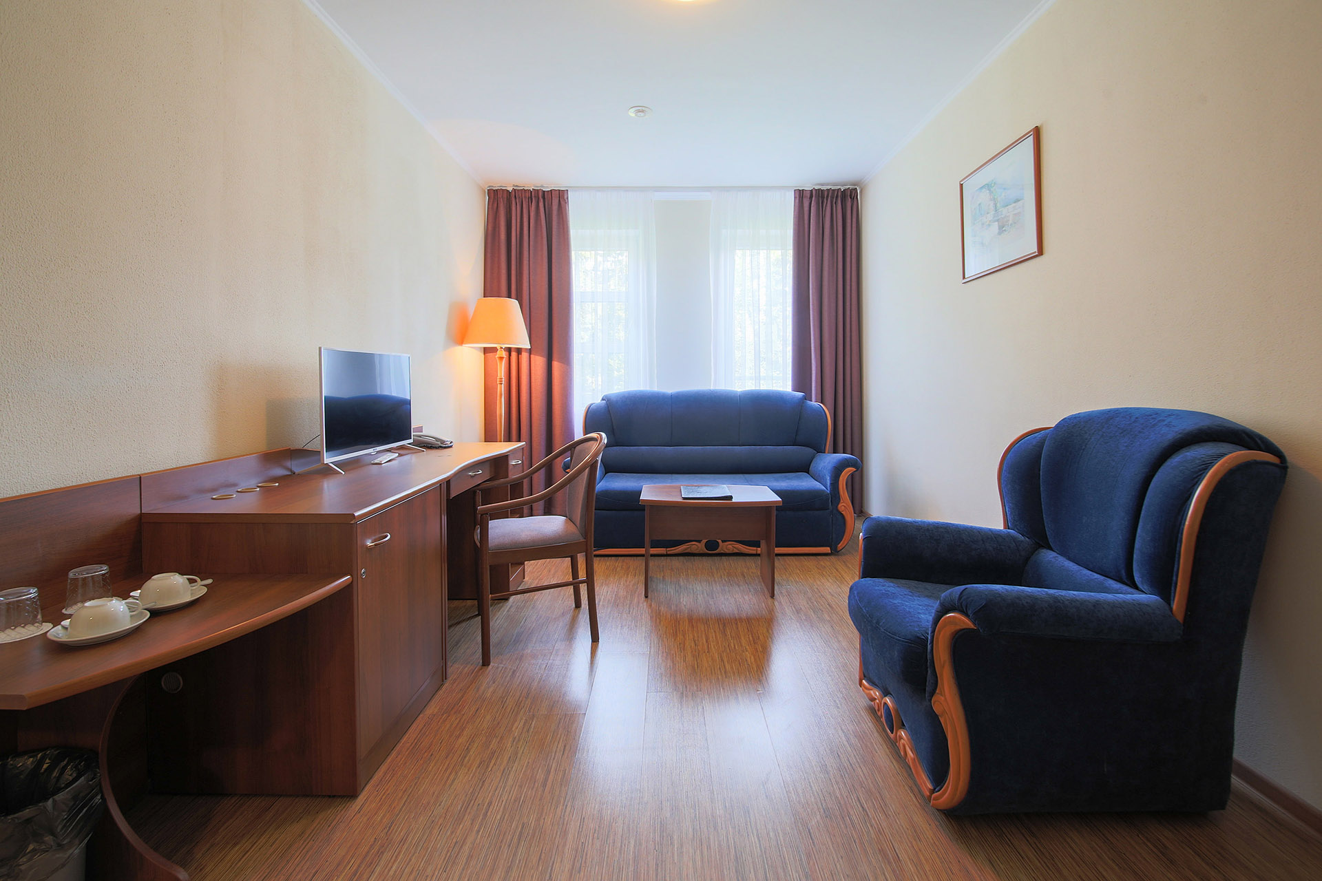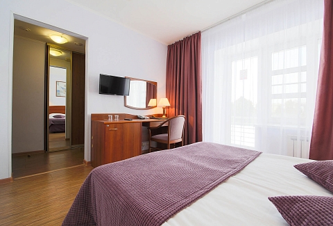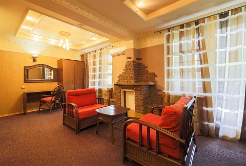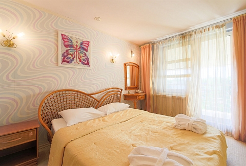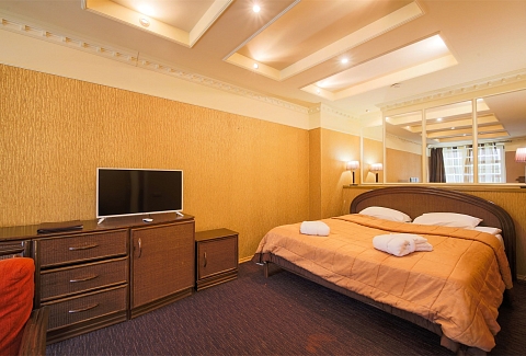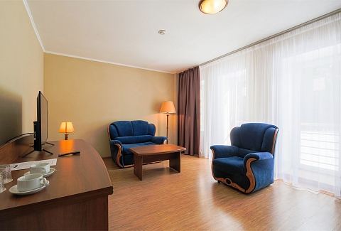 В номере: вешалка, диван, зеркало, кровать двуспальная, набор мягкой мебели, прикроватные тумбочки, стол, стулья, шкаф, мини-холодильник, телевизор ЖК, телефон, чайный набор посуды, электрочайник