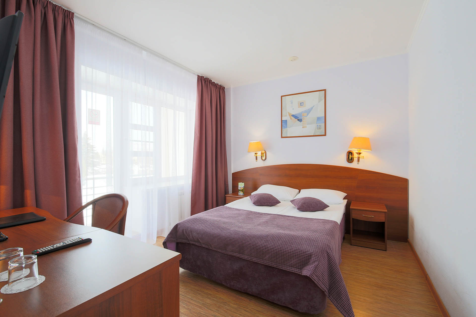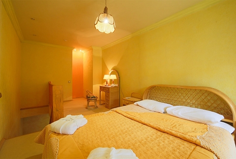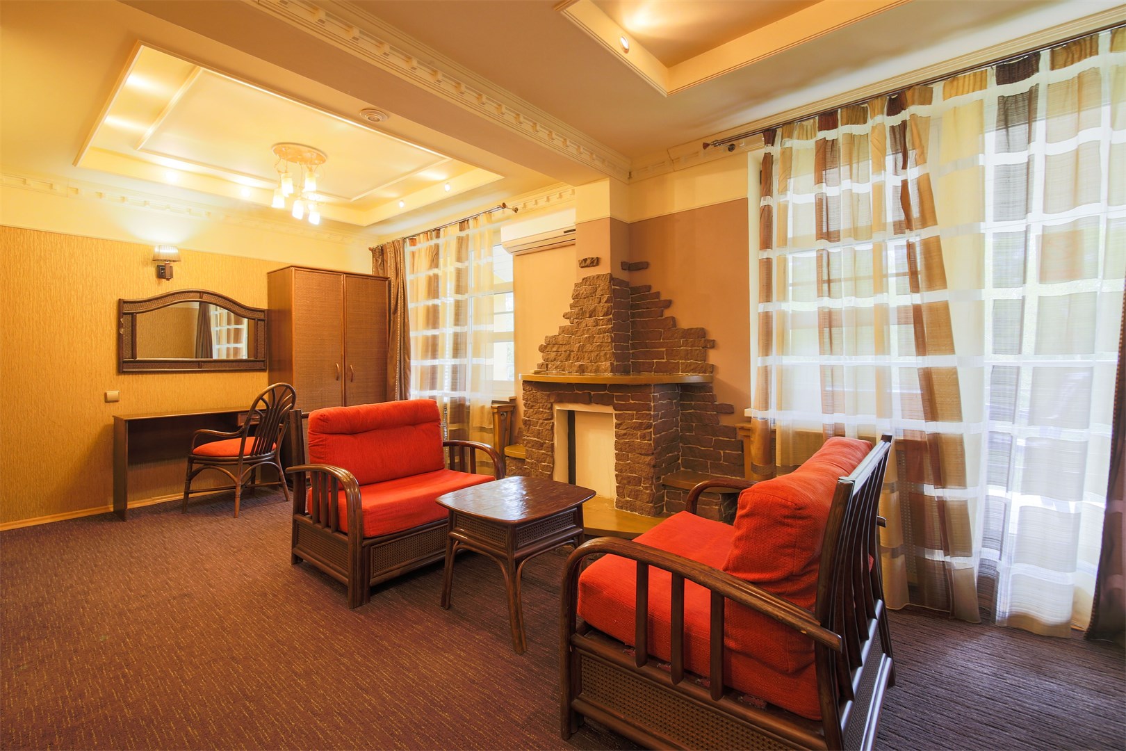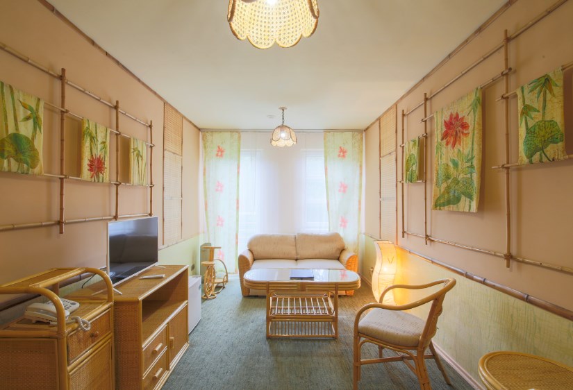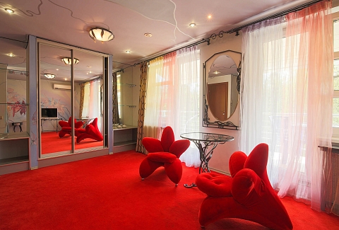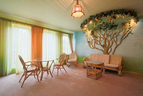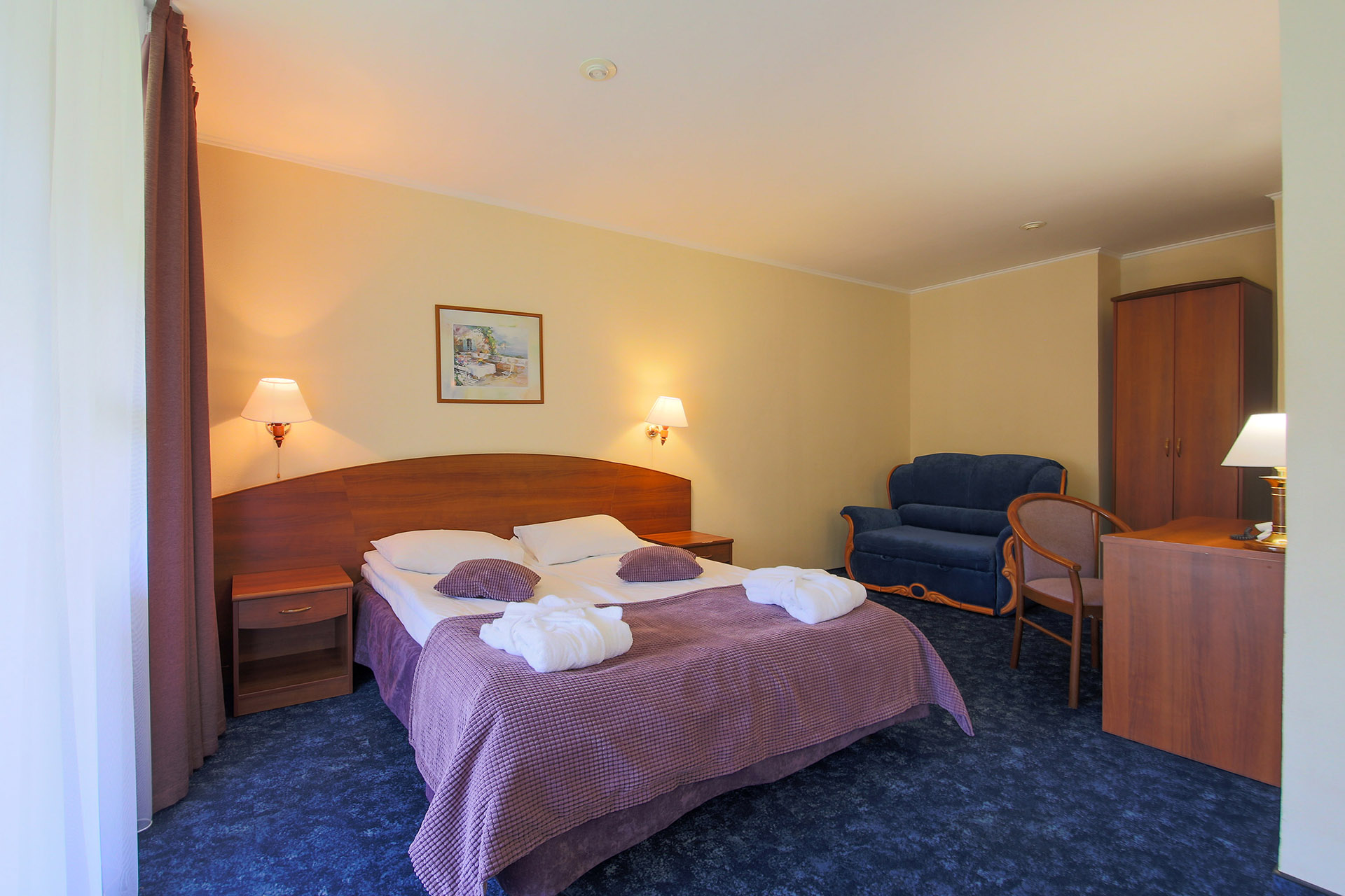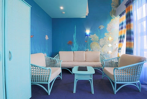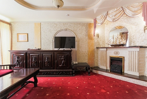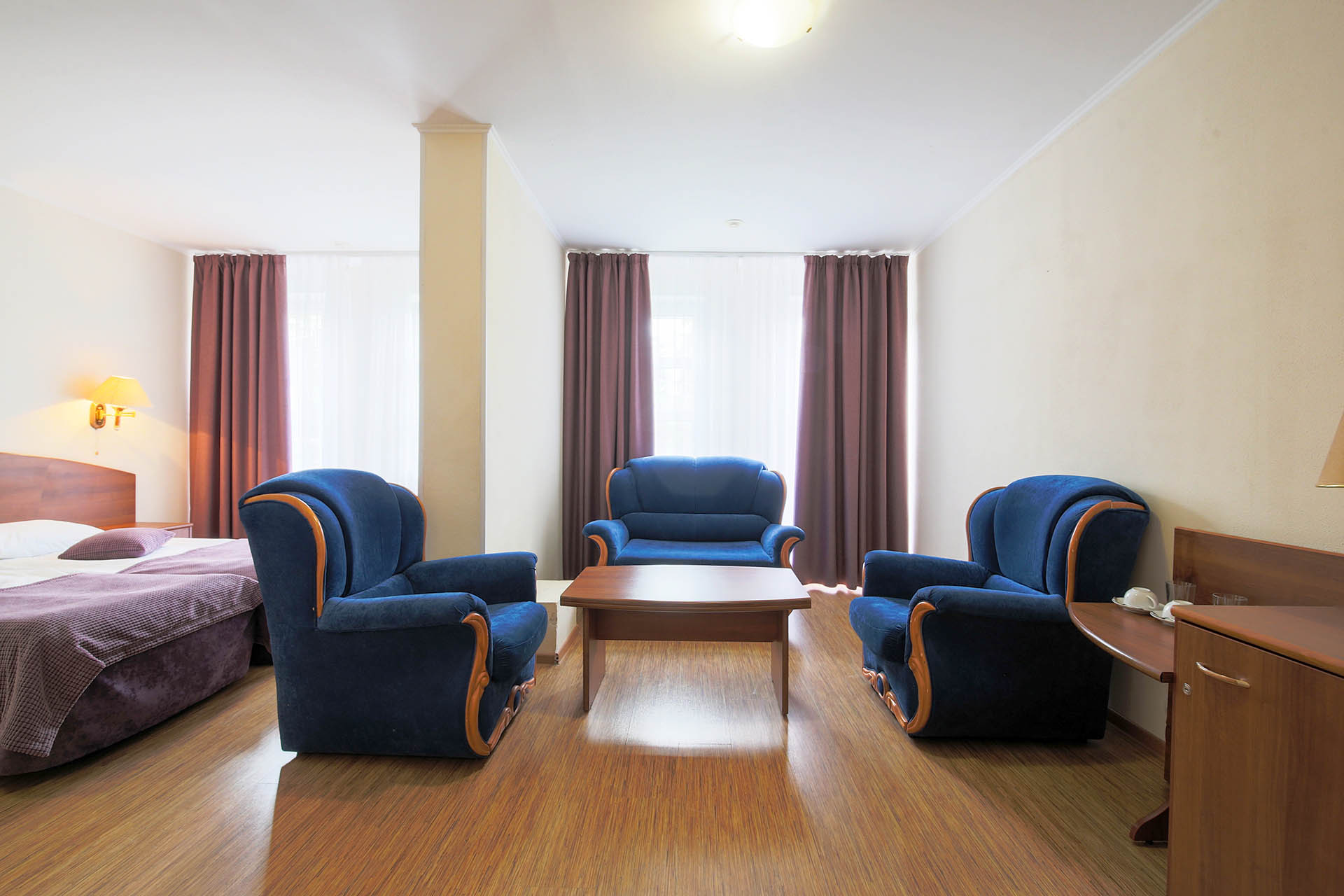 В номере: вешалка, диван, зеркало, кровать двуспальная, набор мягкой мебели, прикроватные тумбочки, стол, стулья, шкаф, мини-холодильник, телевизор ЖК, телефон, чайный набор посуды, электрочайник