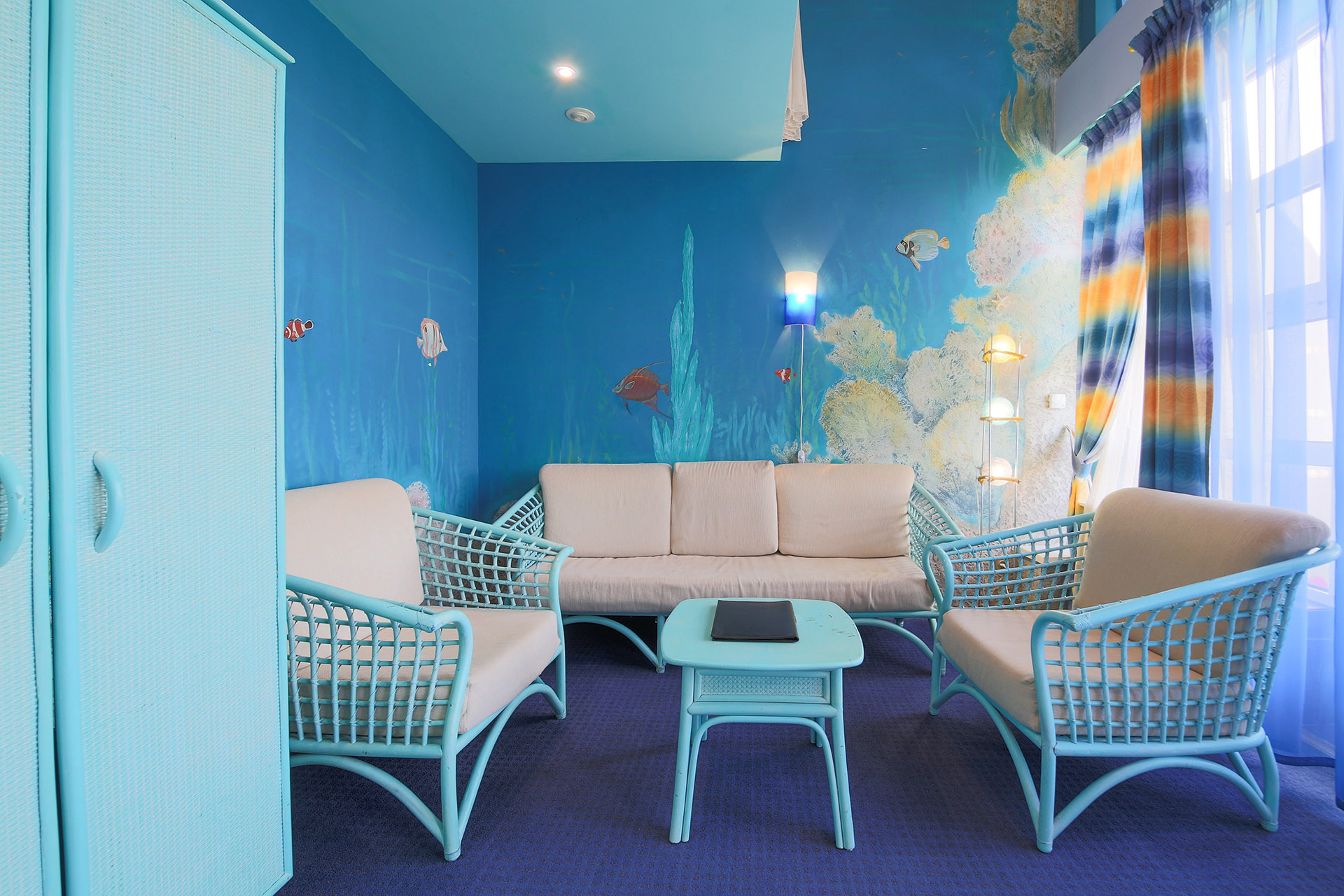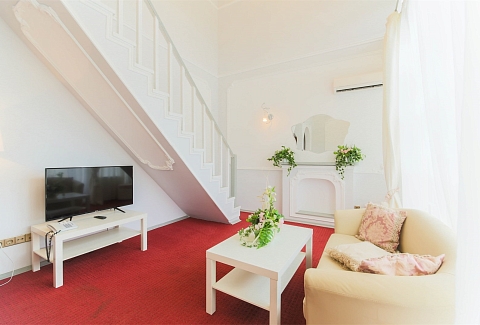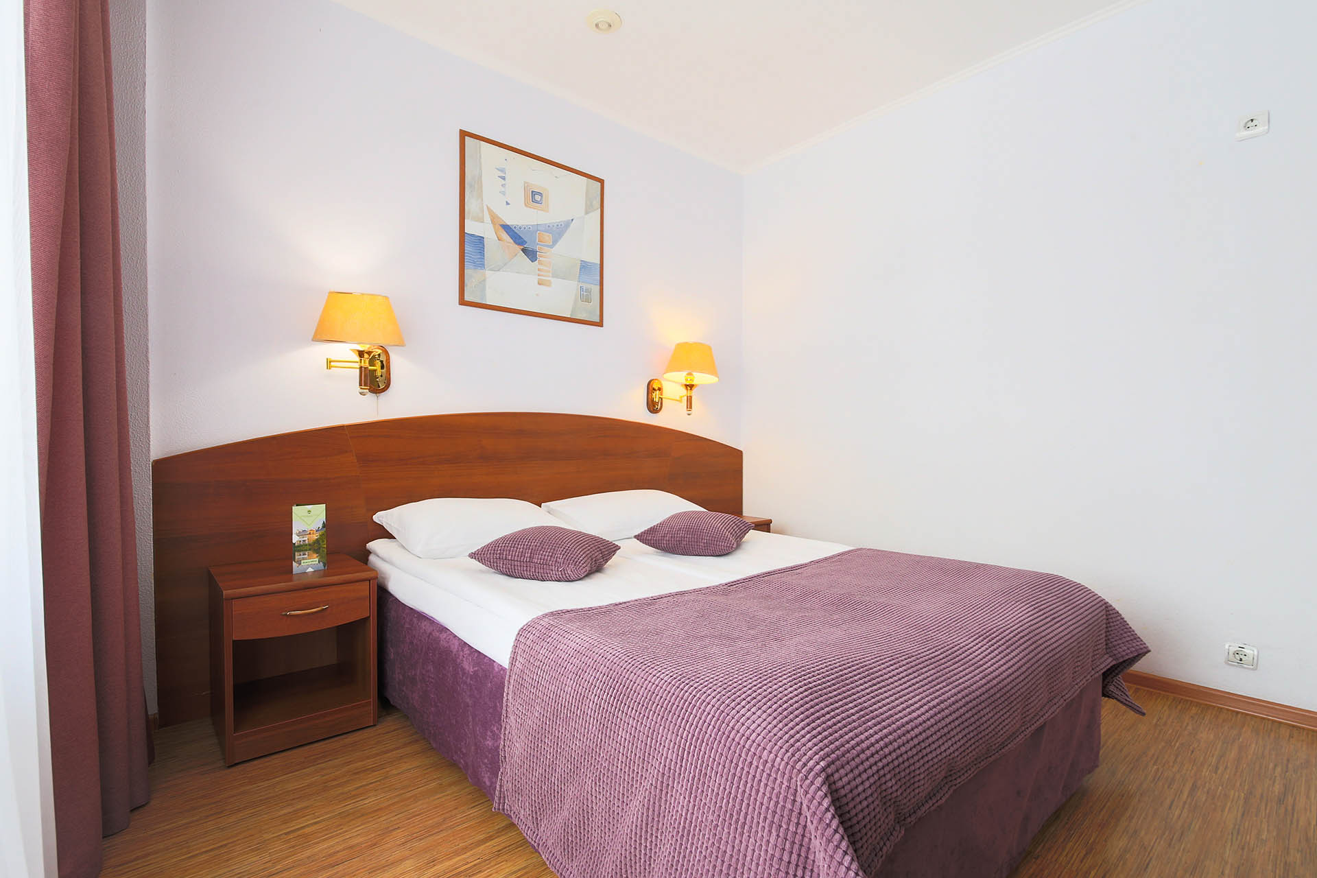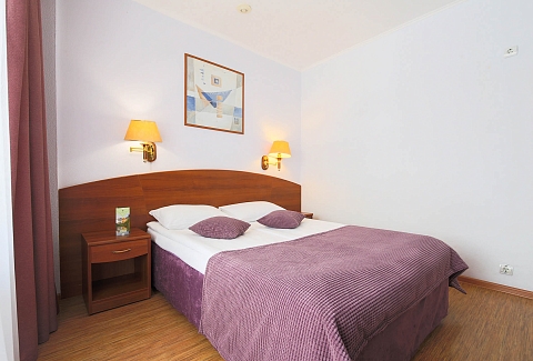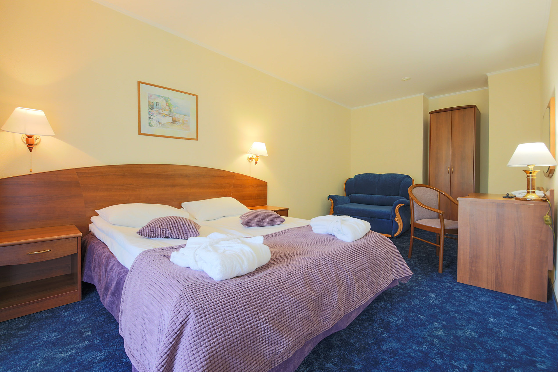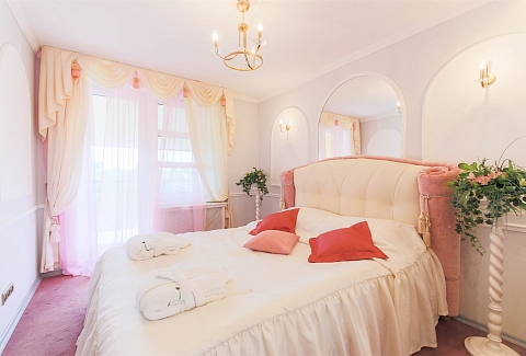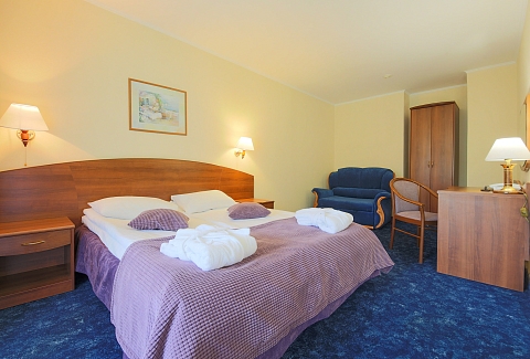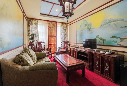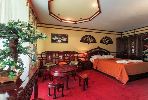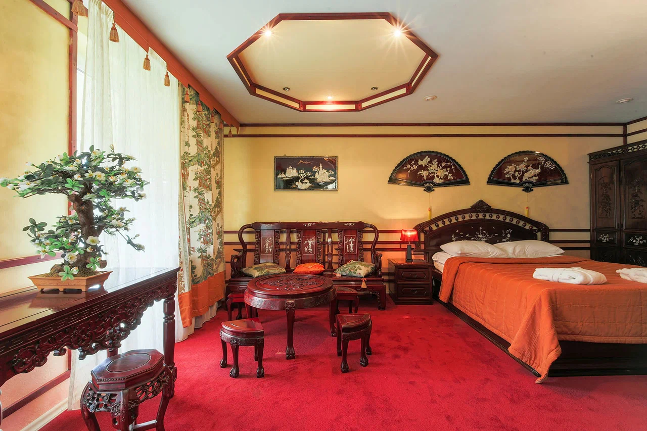 В номере: вешалка, диван, зеркало, кровать двуспальная, набор мягкой мебели, прикроватные тумбочки, стол, стулья, шкаф, мини-холодильник, телевизор ЖК, телефон, чайный набор посуды, электрочайник