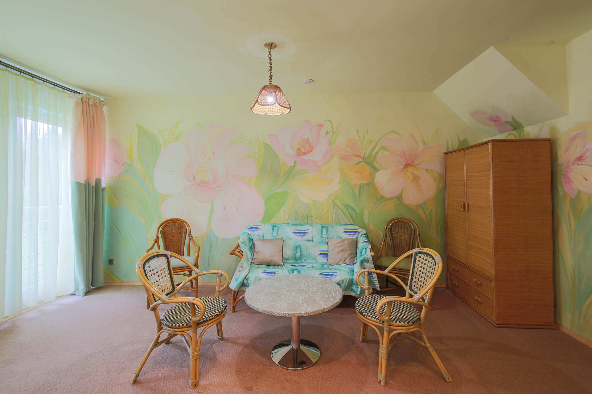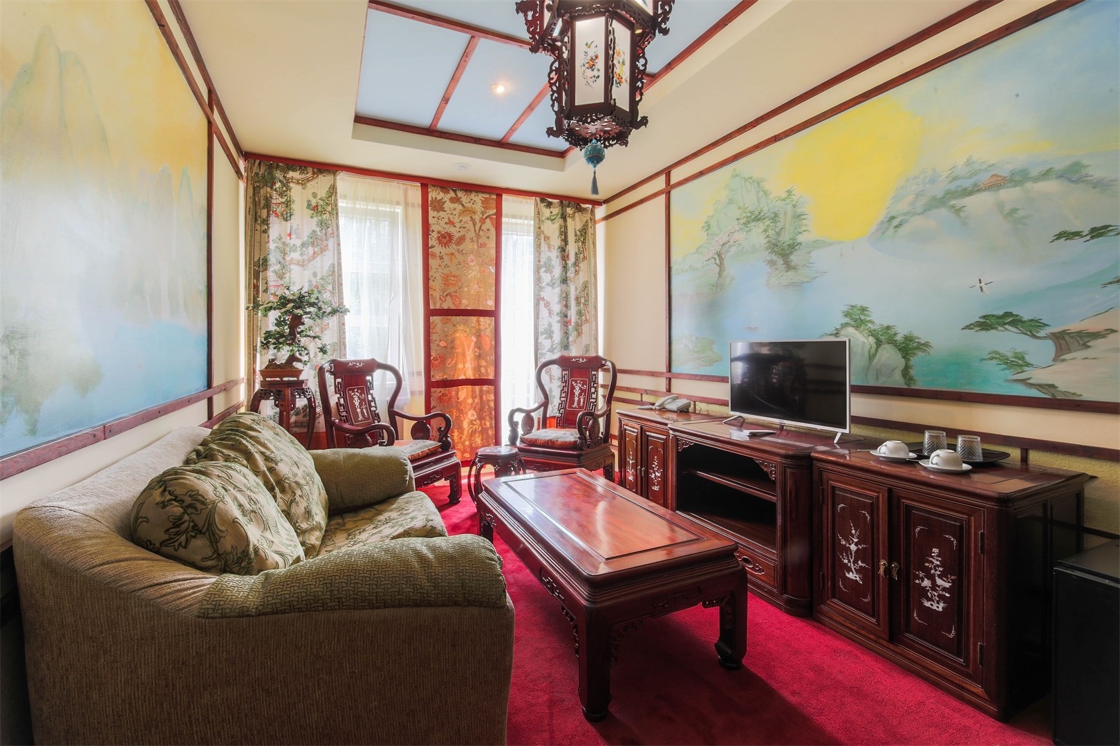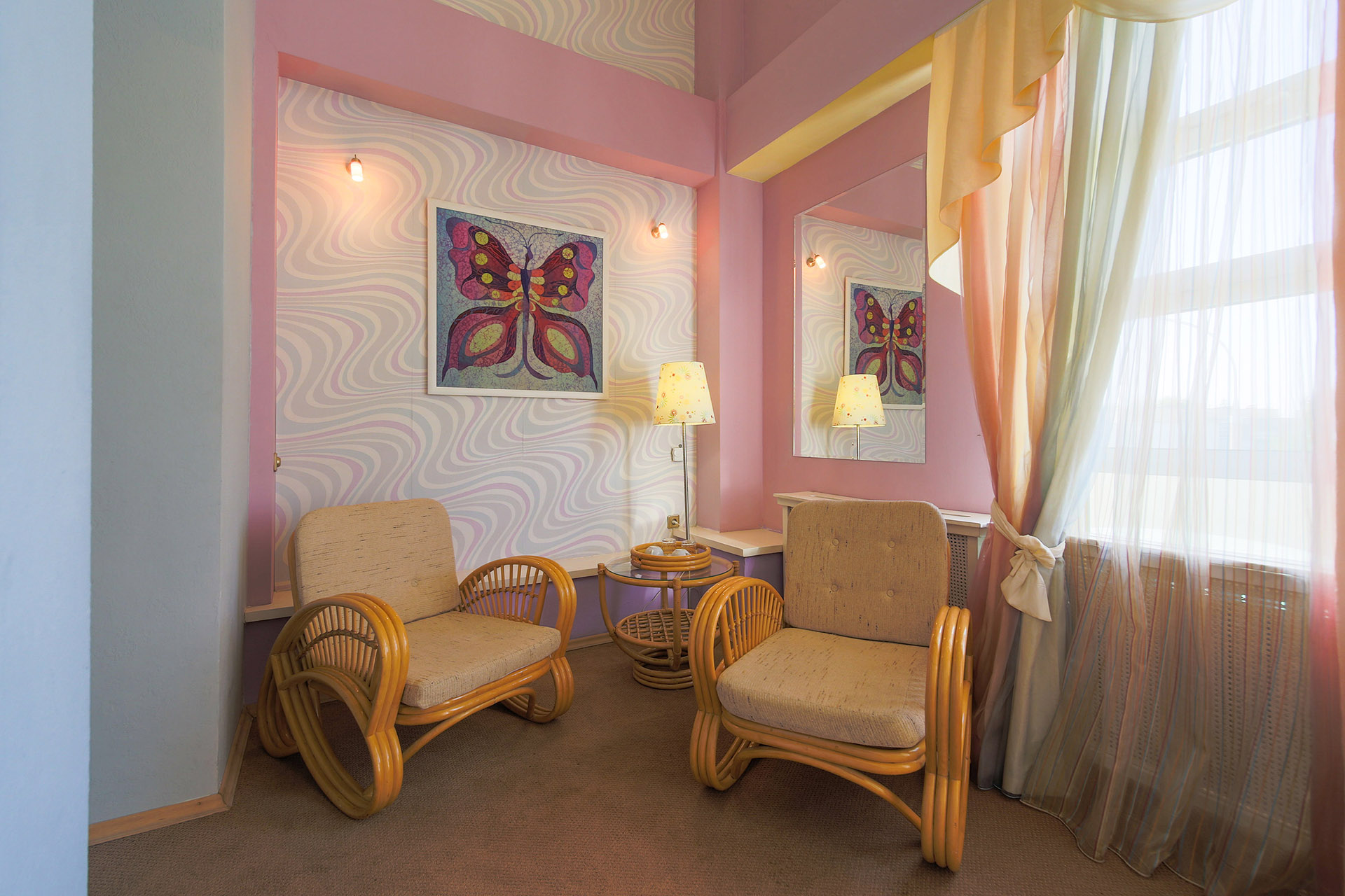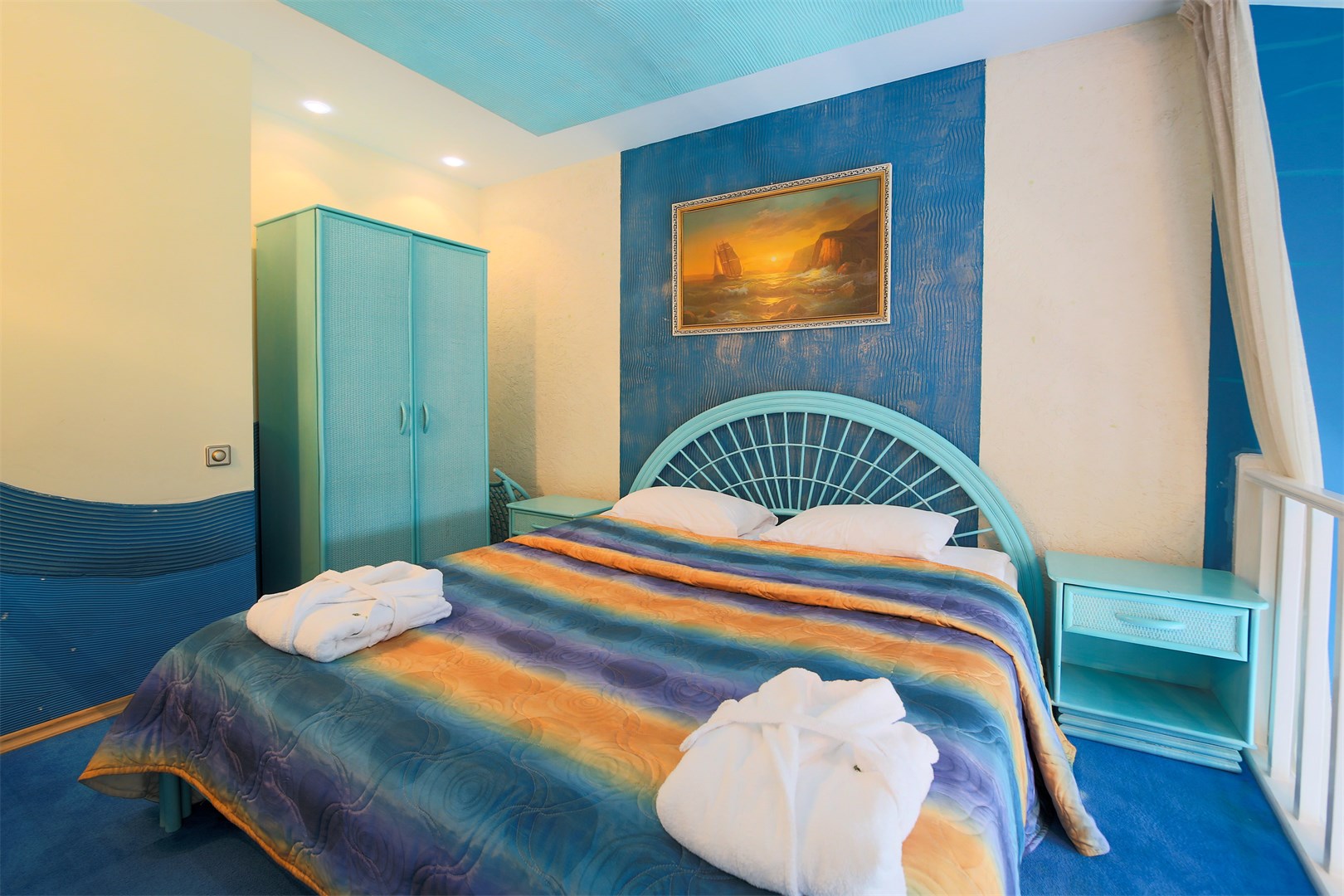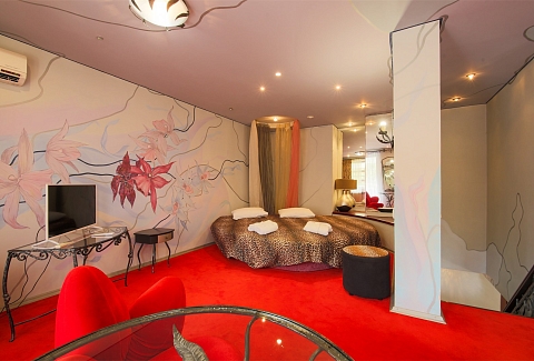 В номере: вешалка, диван, зеркало, кровать двуспальная, набор мягкой мебели, прикроватные тумбочки, стол, стулья, шкаф, мини-холодильник, телевизор ЖК, телефон, чайный набор посуды, электрочайник