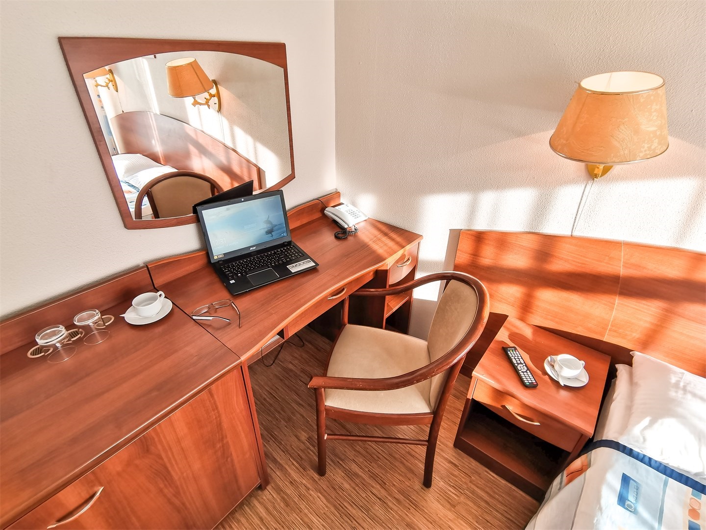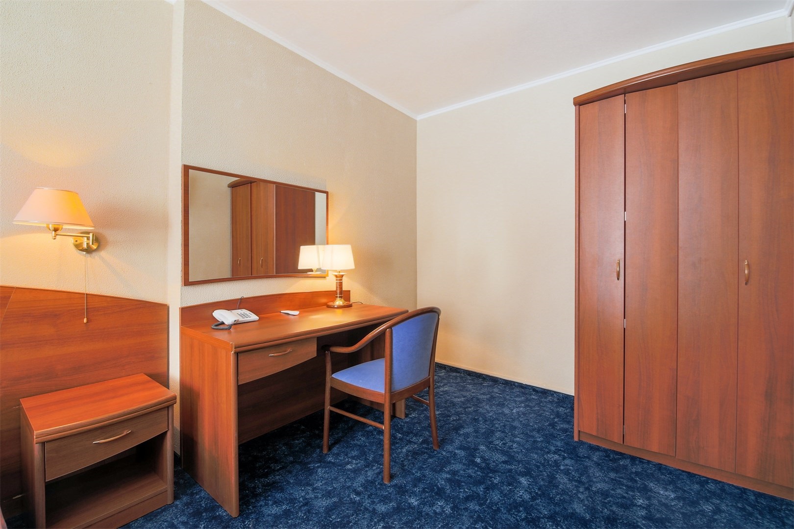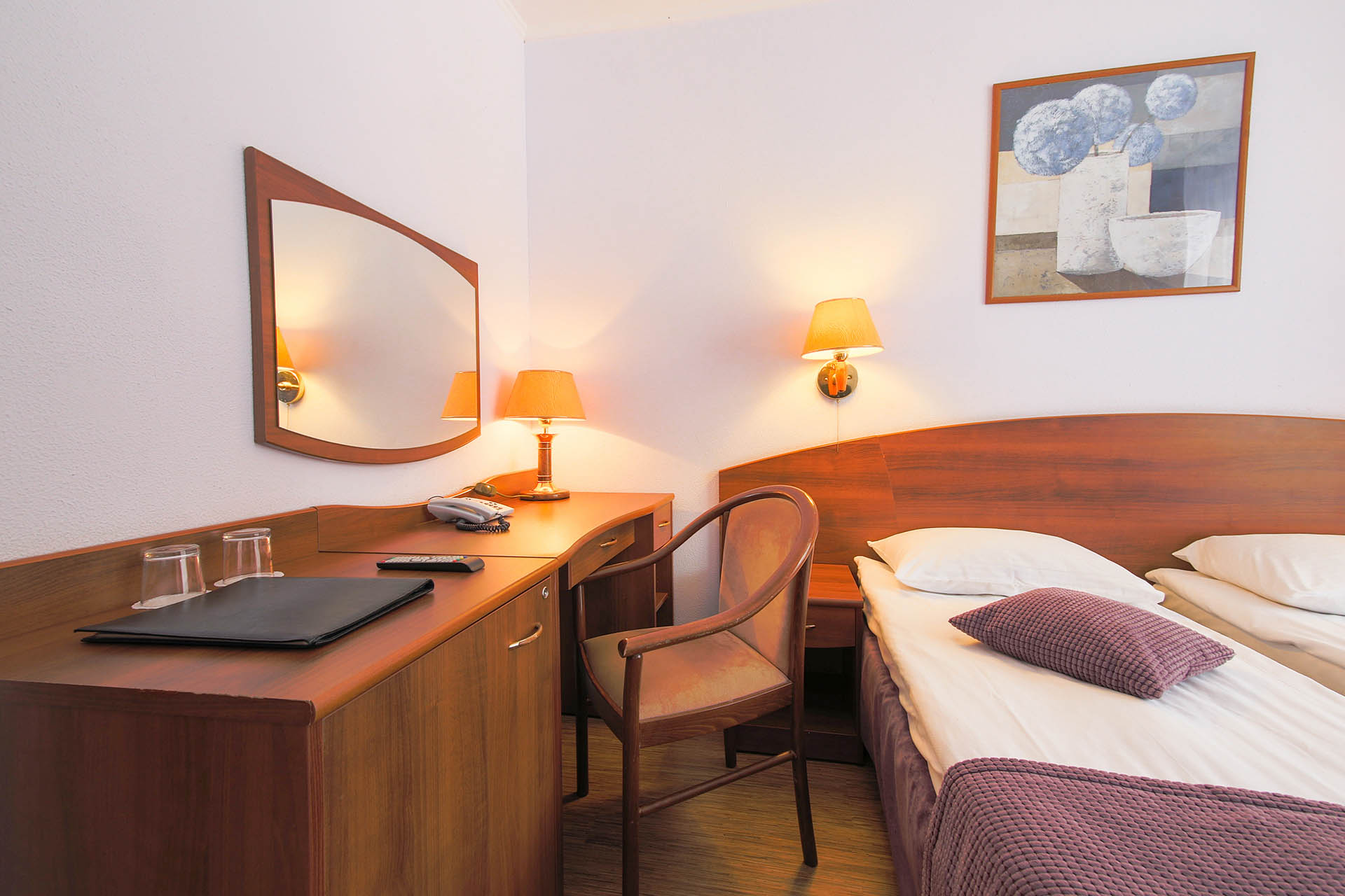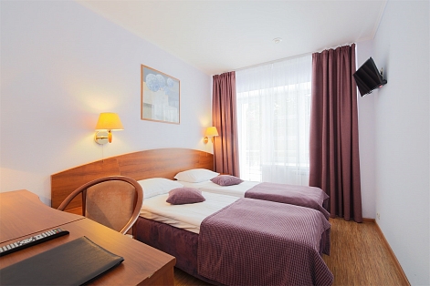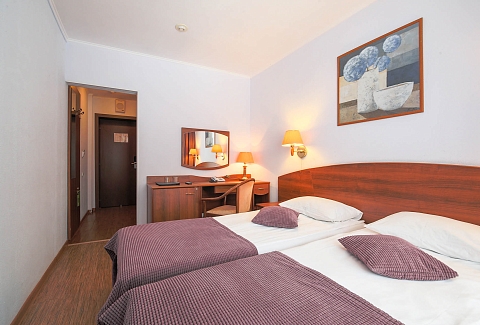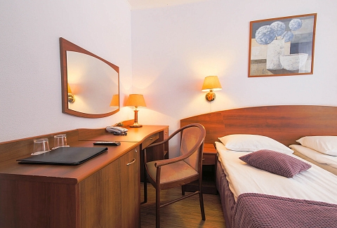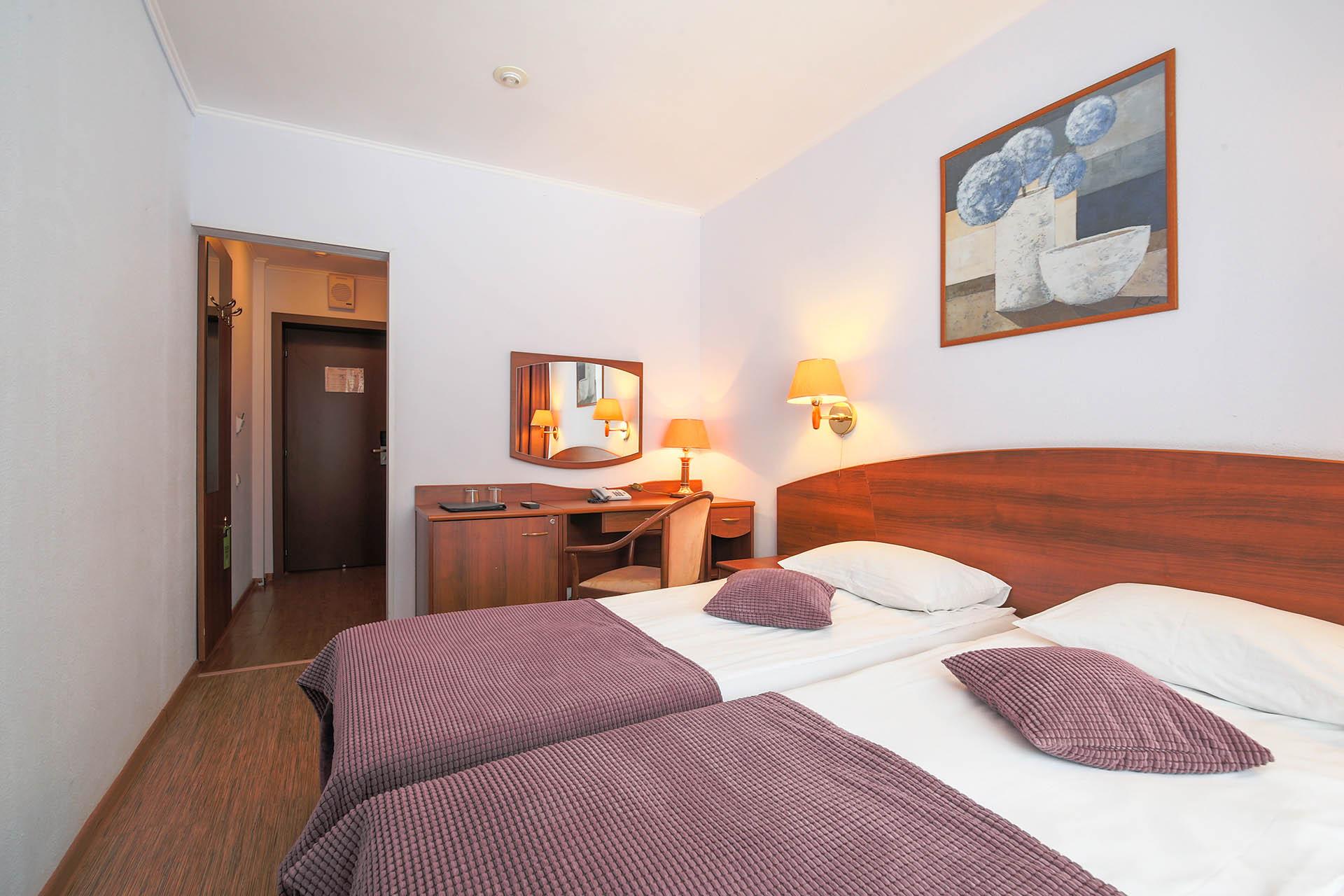 В номере: вешалка, зеркало, кровати односпальные, прикроватные тумбочки, столик туалетный, шкаф, телевизор, телефон, холодильник
