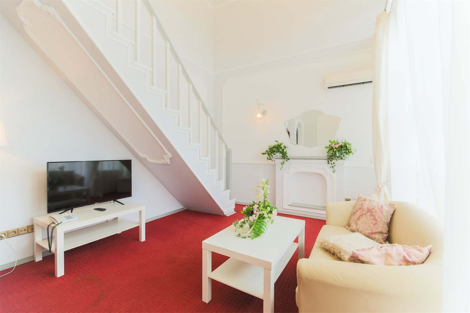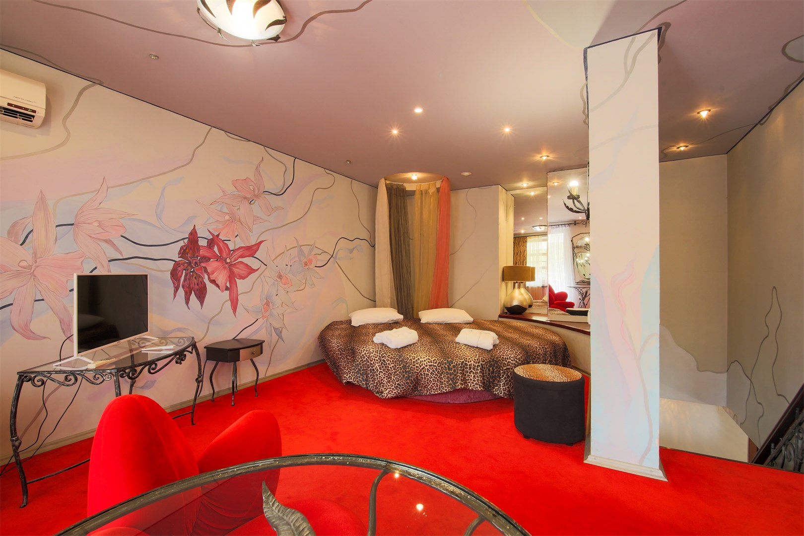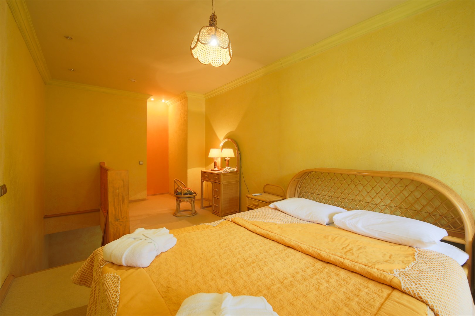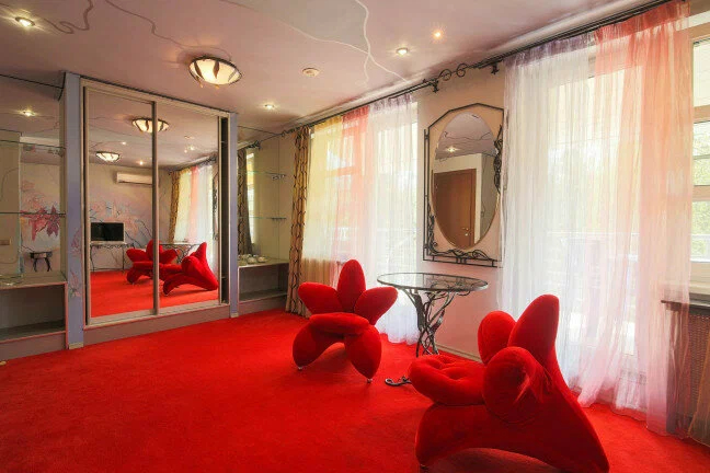 В номере: вешалка, диван, зеркало, кровать двуспальная, набор мягкой мебели, прикроватные тумбочки, стол, столик туалетный, стулья, шкаф, мини-холодильник, телевизор, телефон