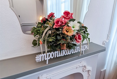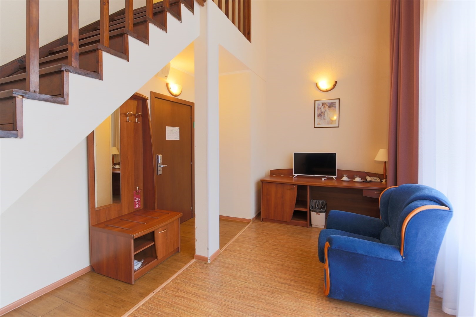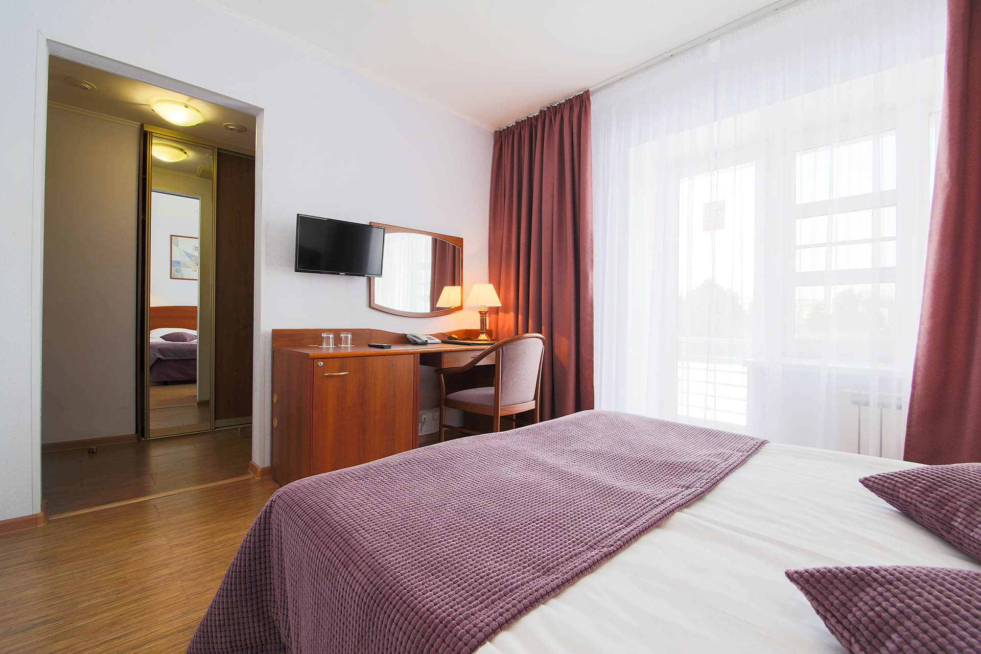 В номере: вешалка, зеркало, кровать двуспальная, прикроватные тумбочки, столик туалетный, стул, шкаф, мини-холодильник, телевизор ЖК, телефон, чайный набор посуды, электрочайник