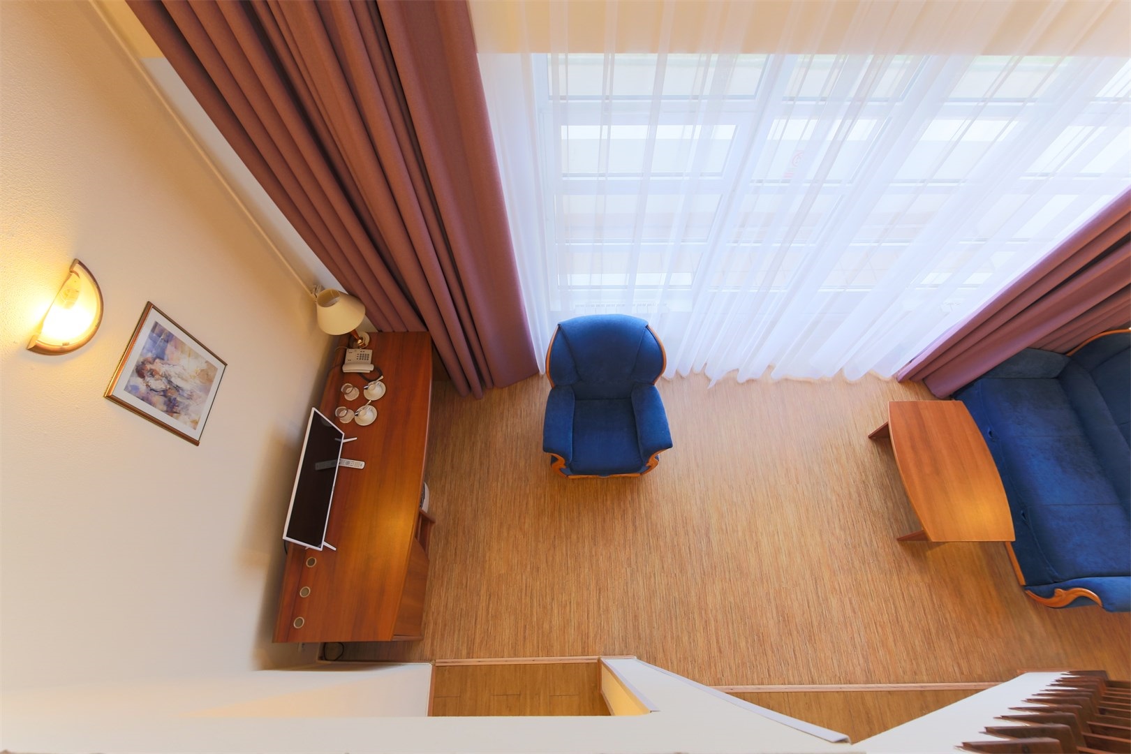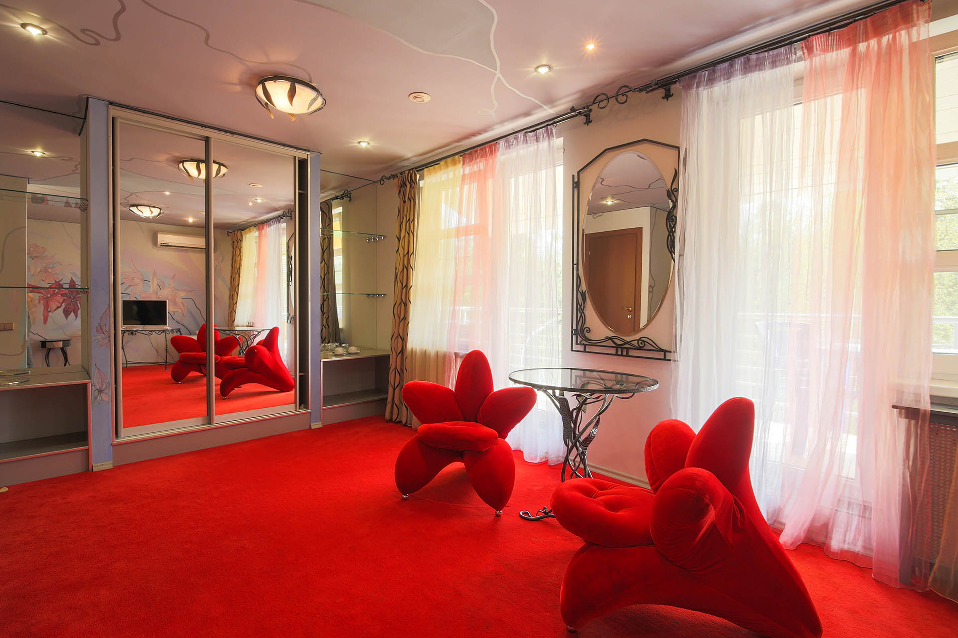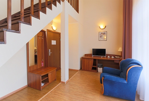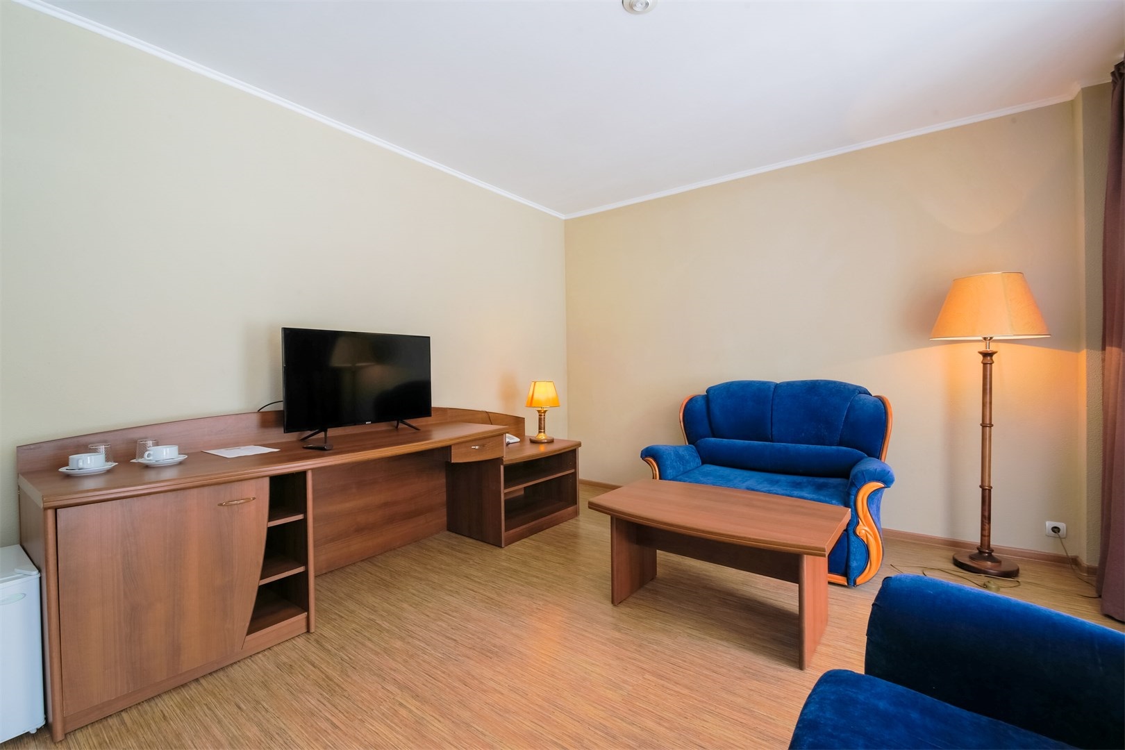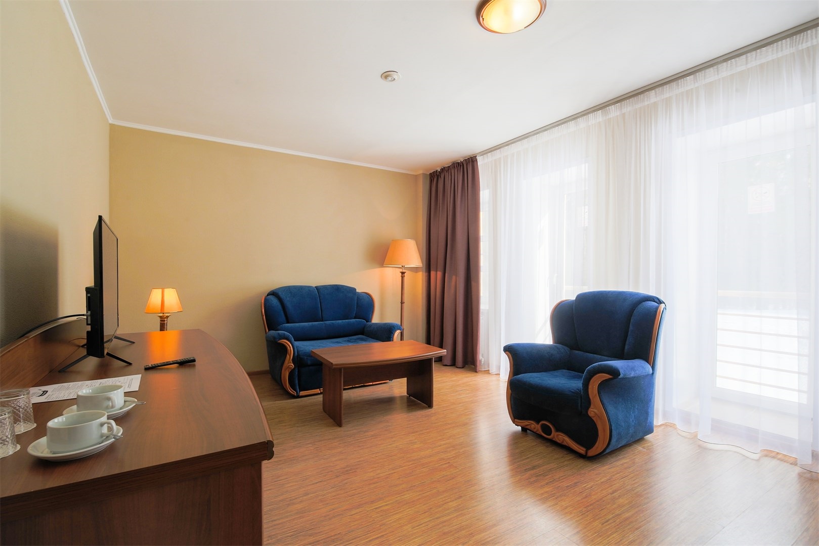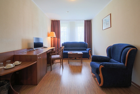 В номере: вешалка, диван, зеркало, кровать двуспальная/ две полутороспальные кровати, набор мягкой мебели, прикроватные тумбочки, стол, столик журнальный, столик туалетный, стулья, шкаф, мини-холодильник, телевизор ЖК, телефон, чайный набор посуды, электрочайник