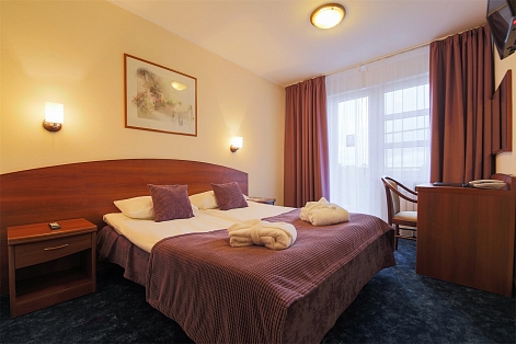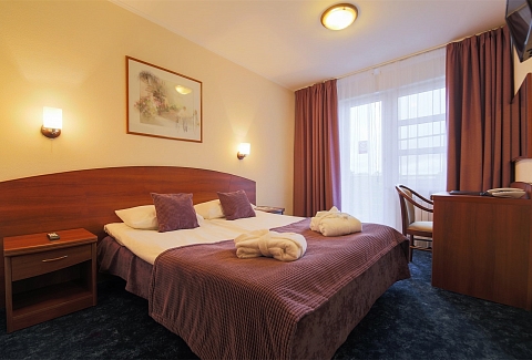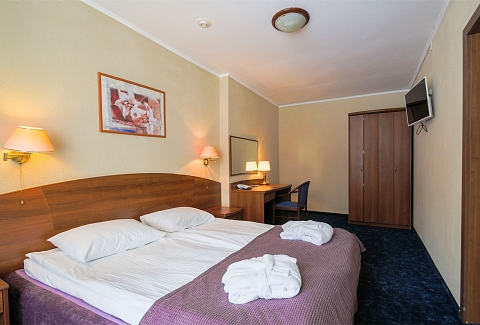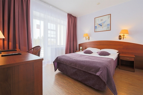 В номере: вешалка, зеркало, кровать двуспальная, прикроватные тумбочки, стол, стулья, шкаф, мини-холодильник, телевизор, телефон