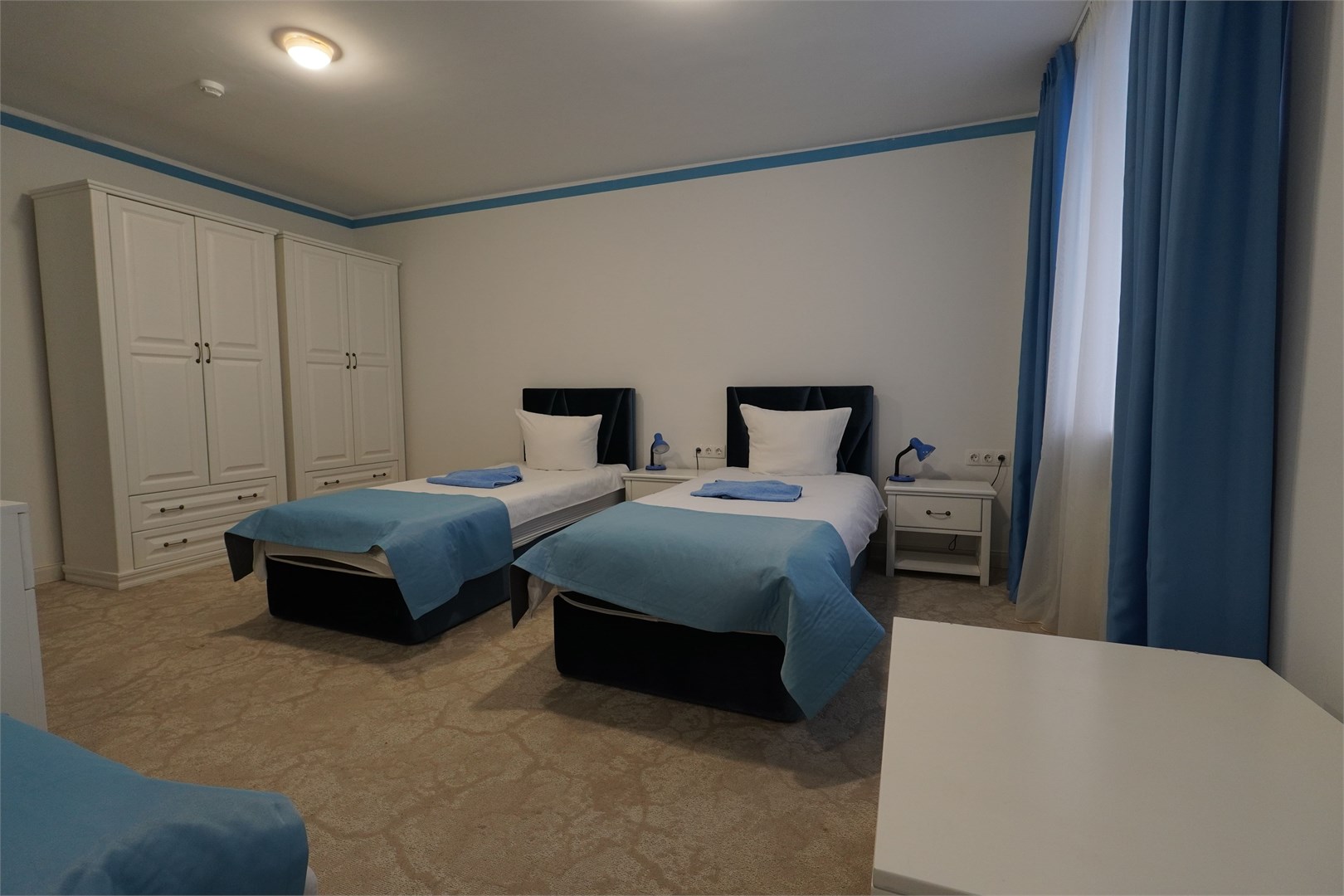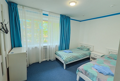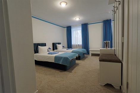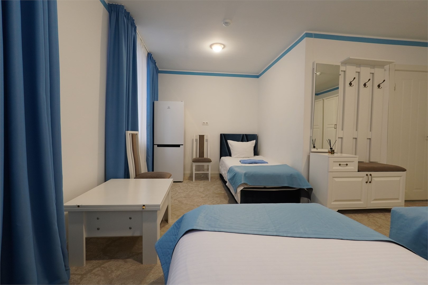 В номере: вешалка, зеркало, комод, кровати односпальные, прикроватные тумбочки, столик журнальный, стулья, шкаф, мини-холодильник, чайный набор посуды, электрочайник