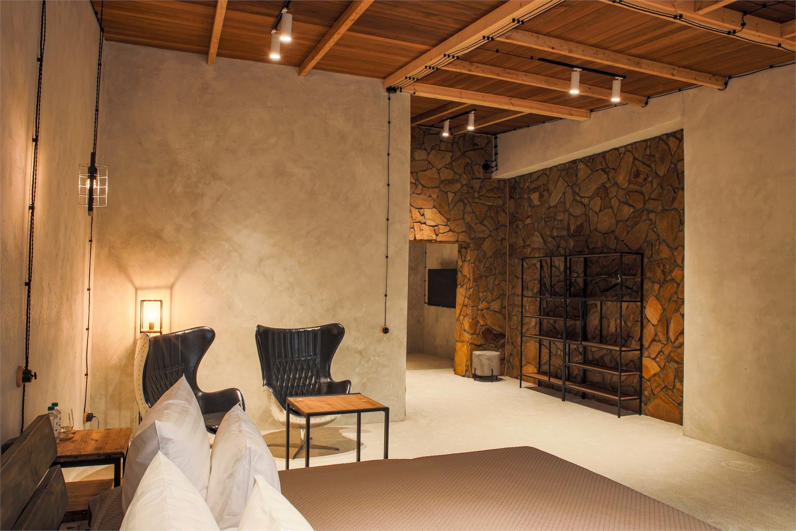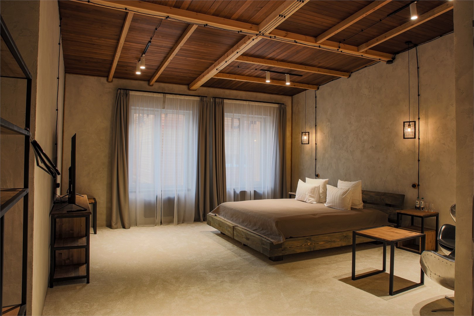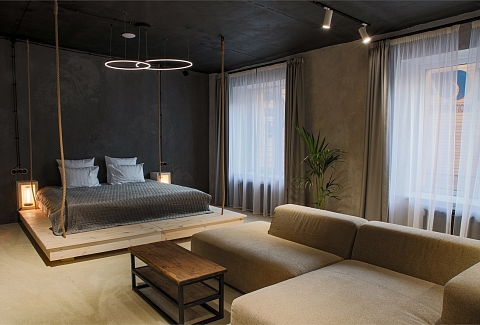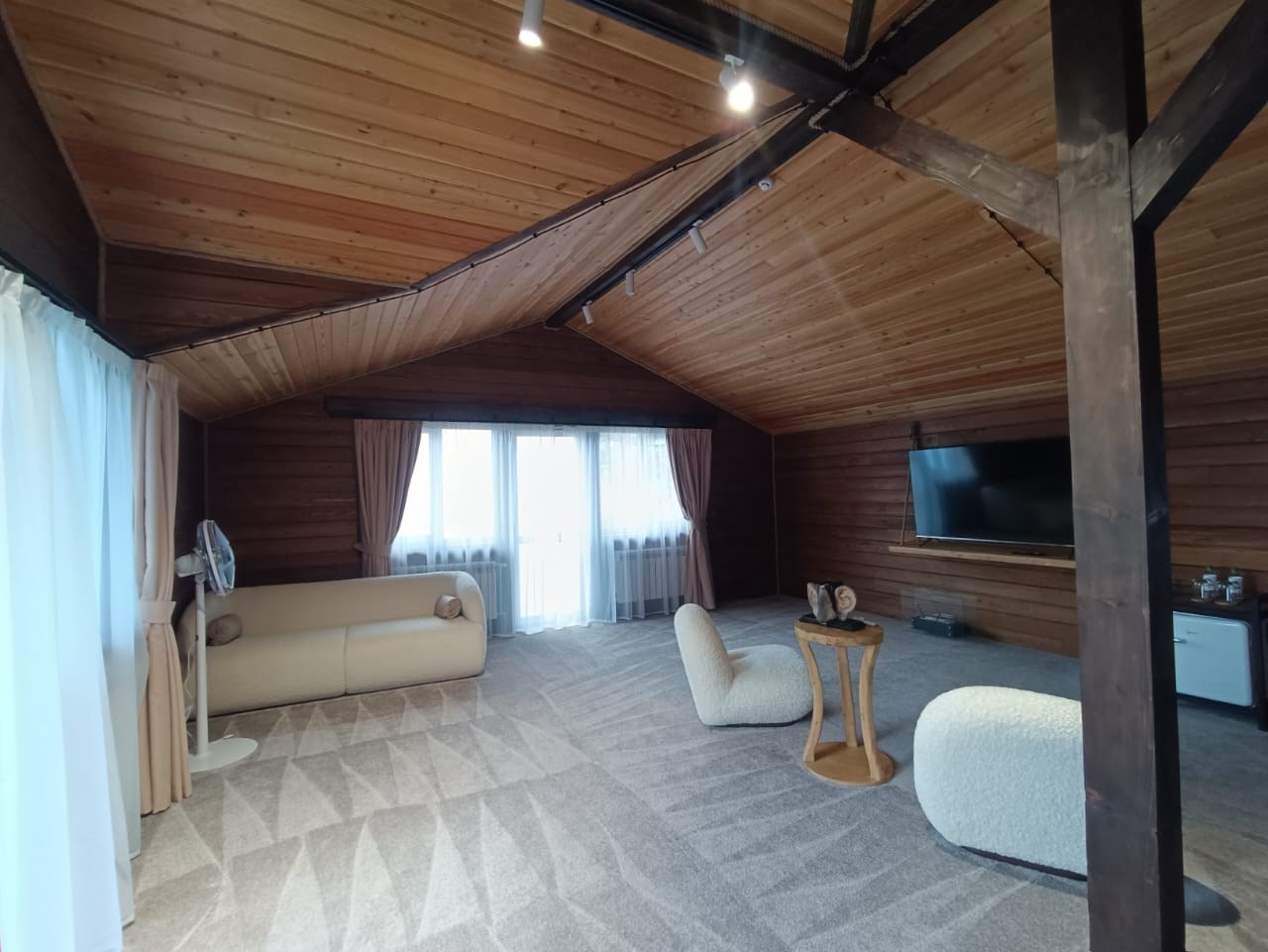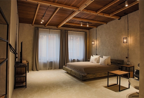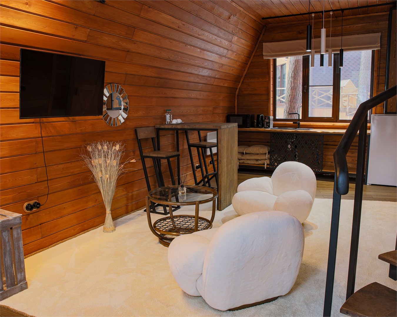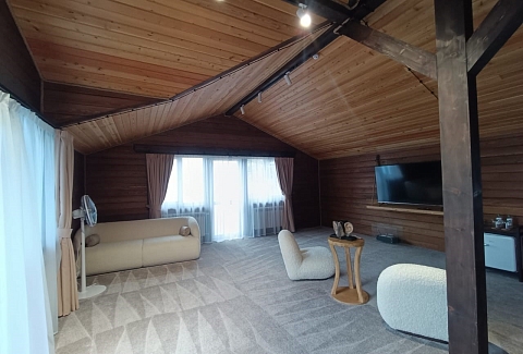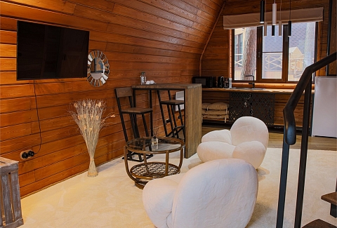 В номере: диван раскладной, зеркало, кровать двуспальная, стол, стулья, шкаф, камин, микроволновая печь, мини-холодильник, набор посуды, телевизор ЖК, чайный набор посуды, электрочайник