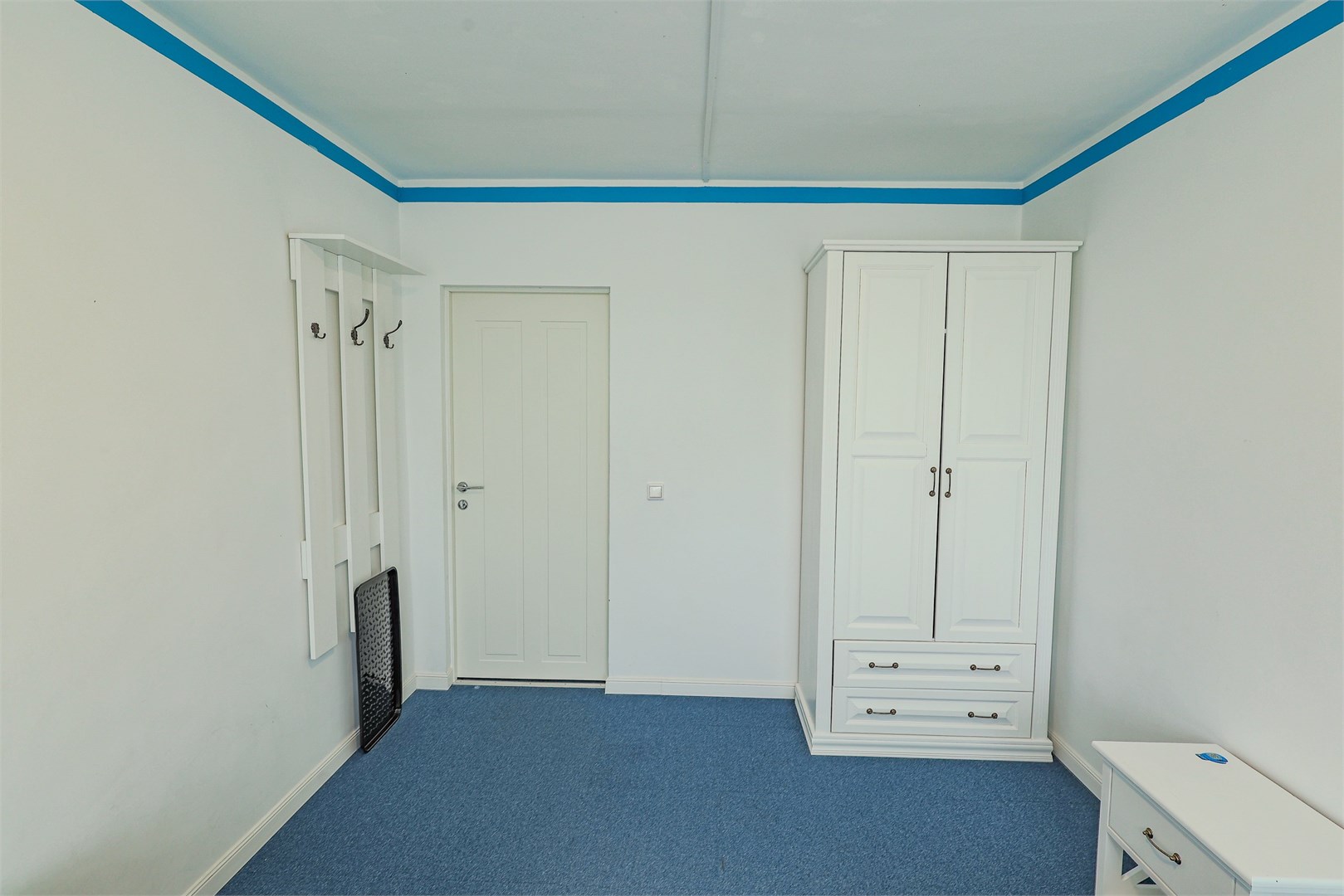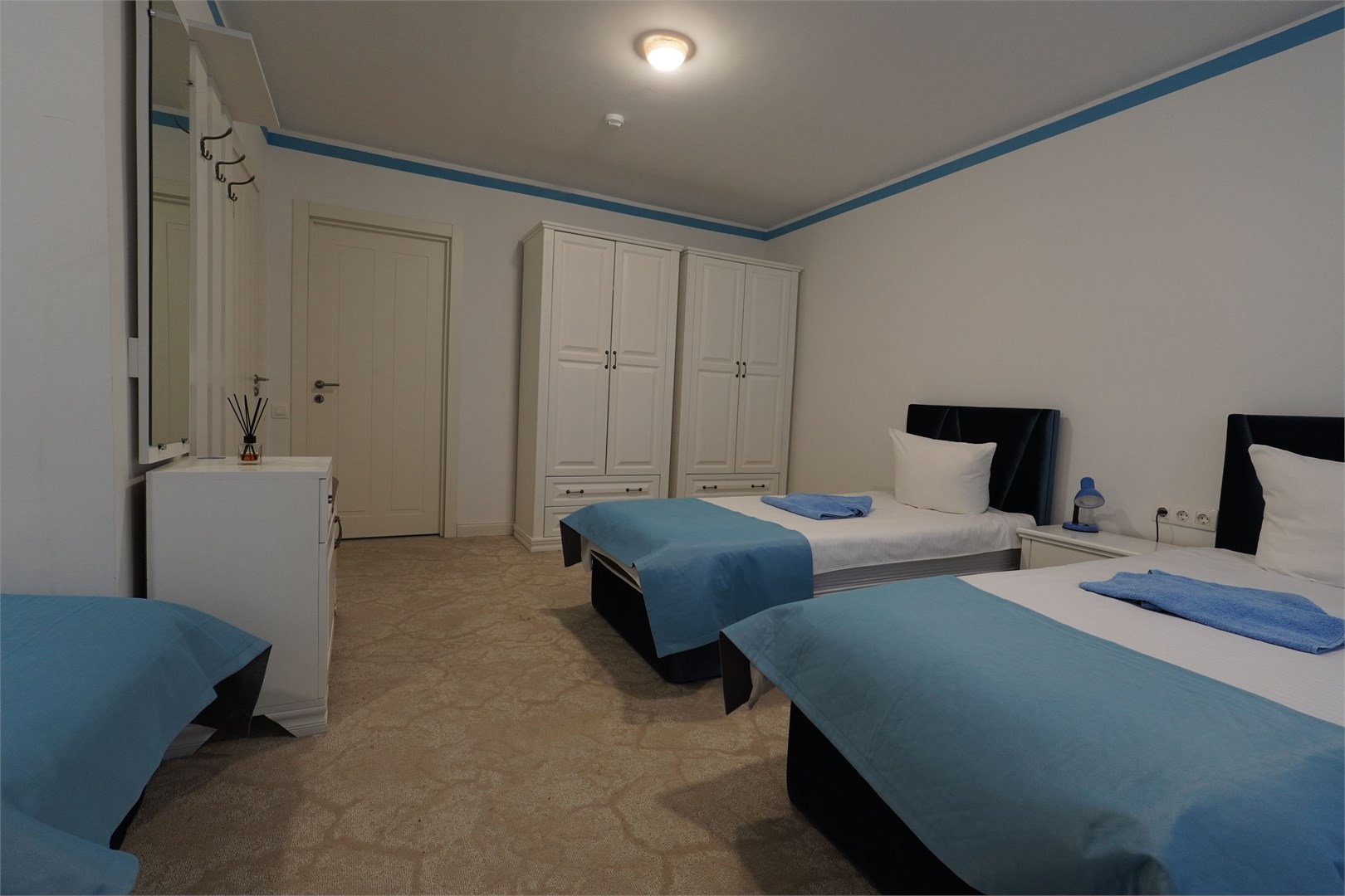 В номере: вешалка, зеркало, комод, кровати односпальные, прикроватная тумбочка, шкаф,