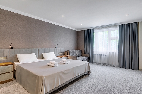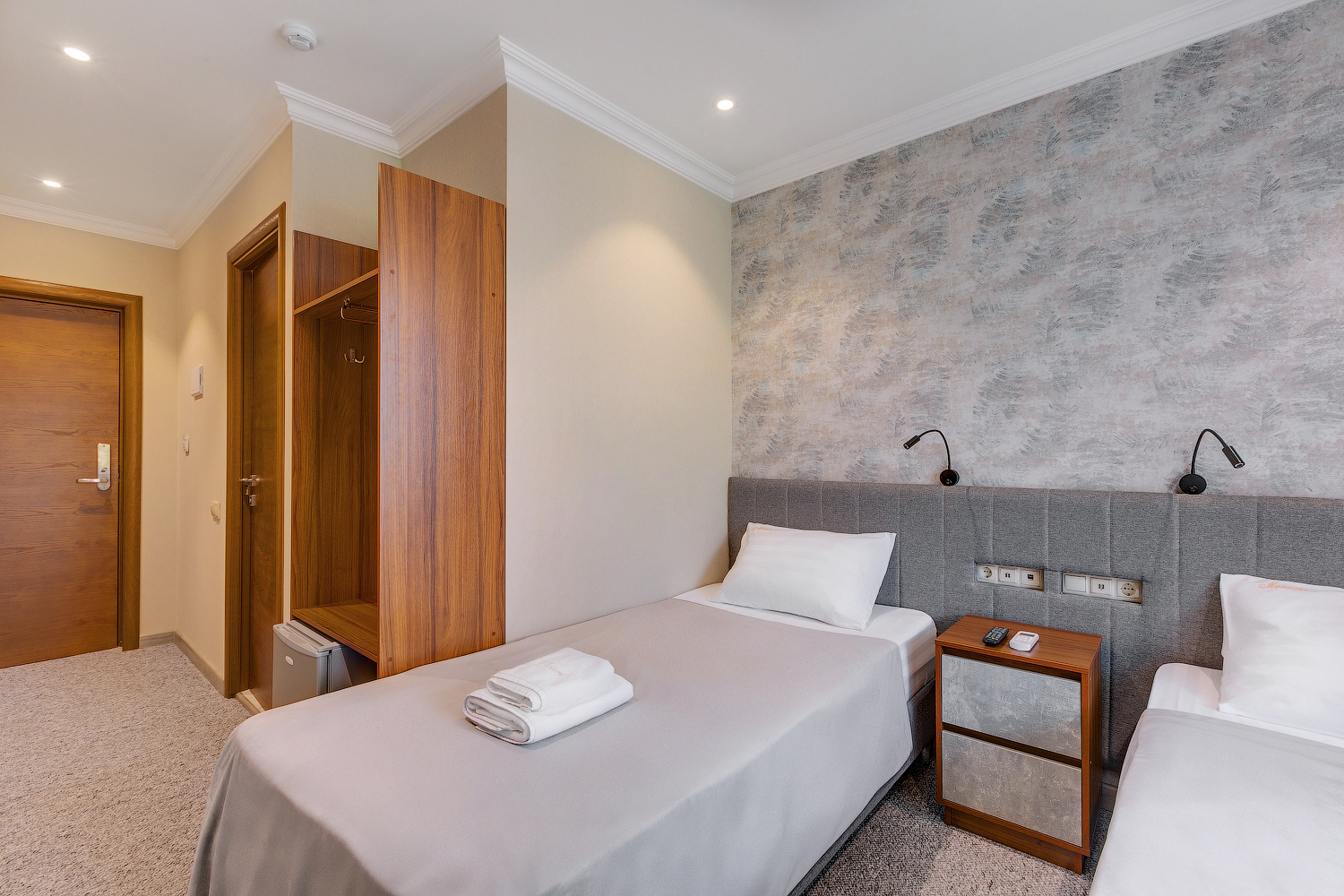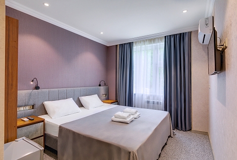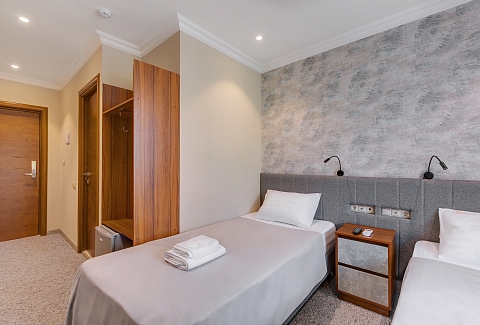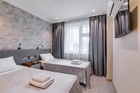 В номере: вешалка, гардеробная, зеркало, кровати односпальные, прикроватные тумбочки, стол, стулья, кондиционер, мини-холодильник, телевизор