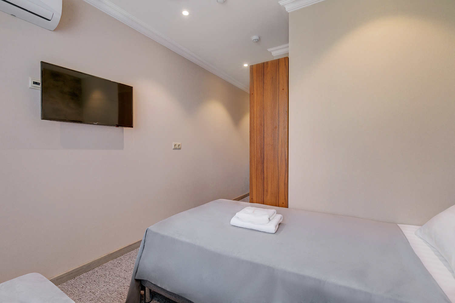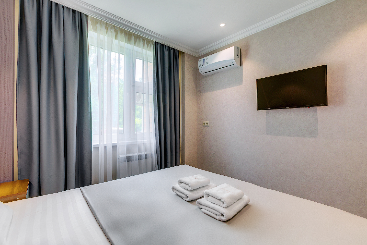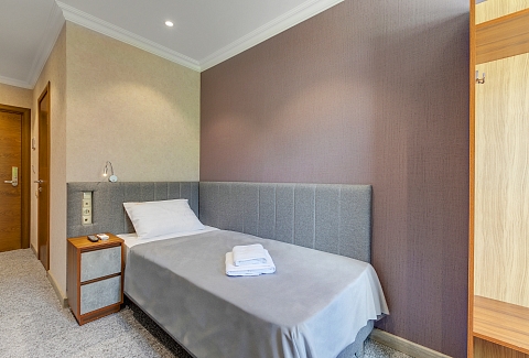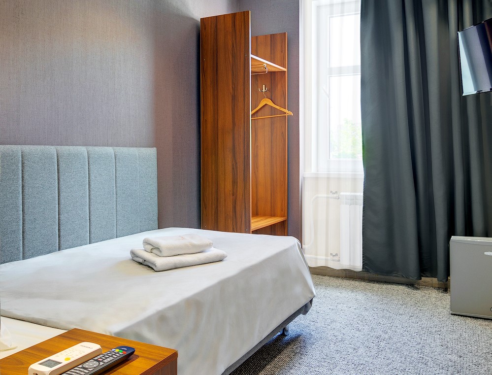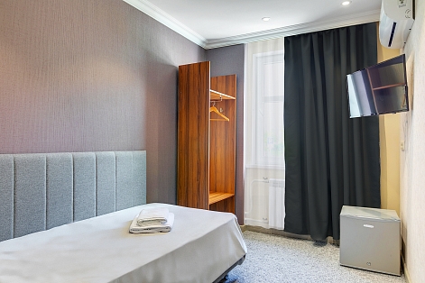 В номере: вешалка, кровать односпальная, прикроватная тумбочка, кондиционер, телевизор, холодильник