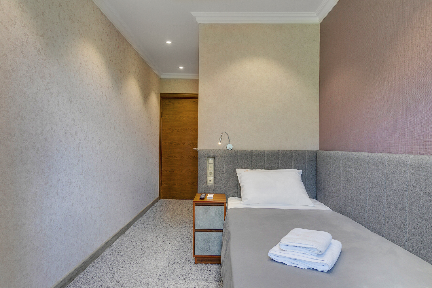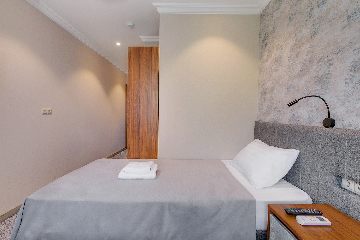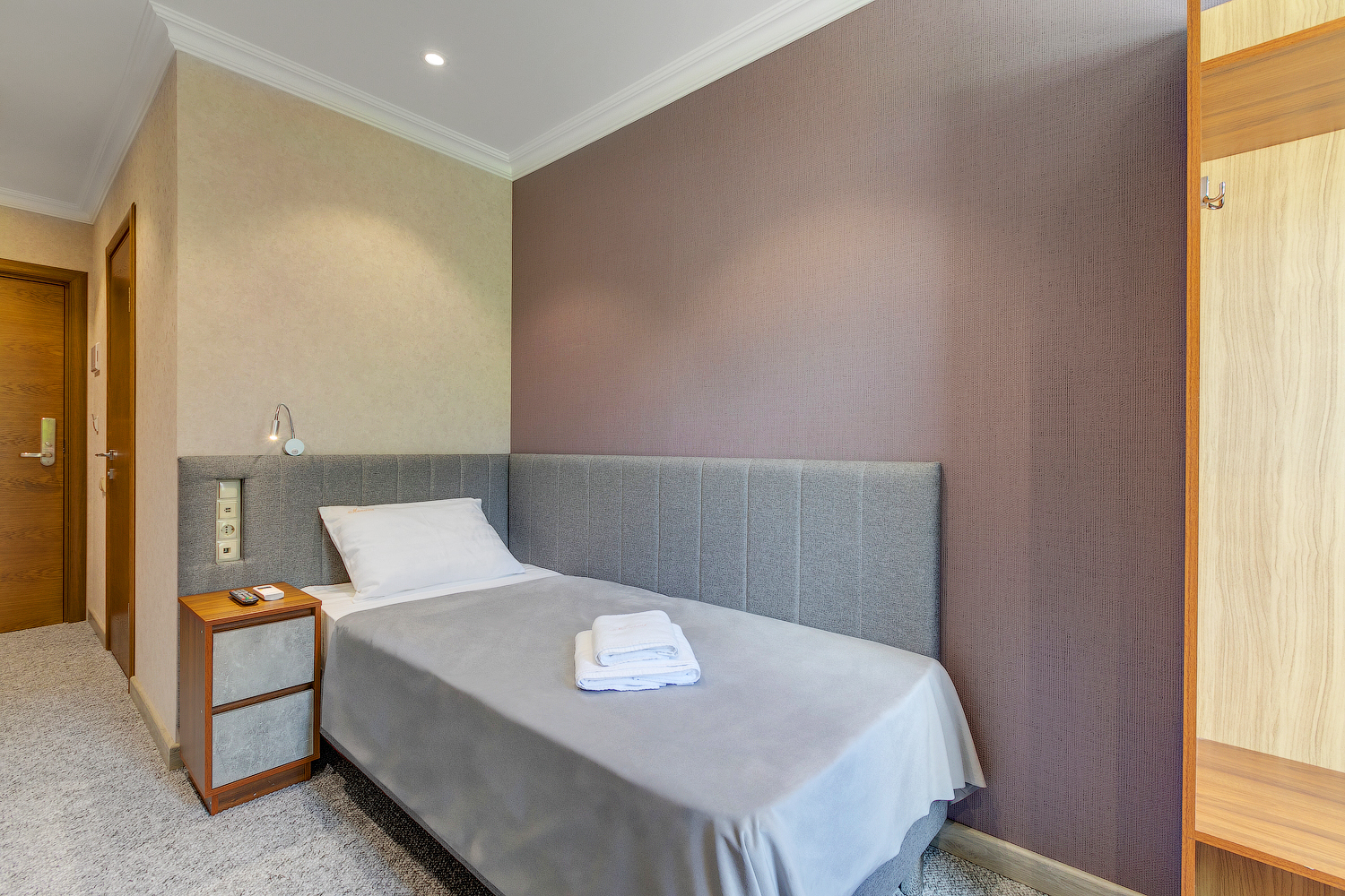 В номере: вешалка, кровать односпальная, прикроватная тумбочка, кондиционер, телевизор, холодильник