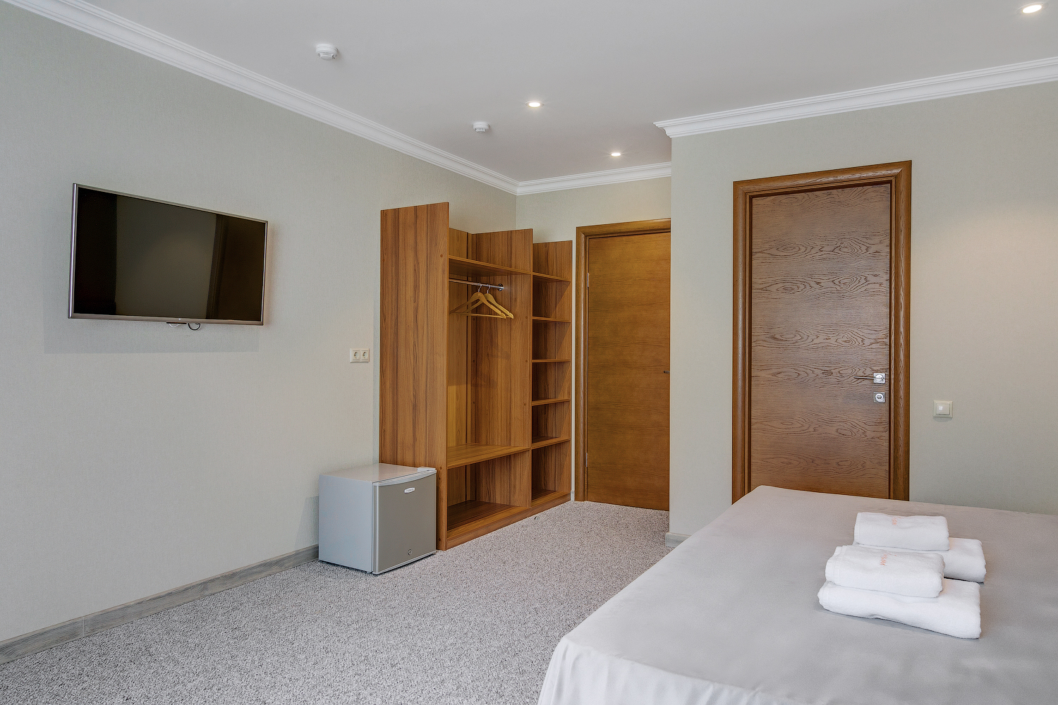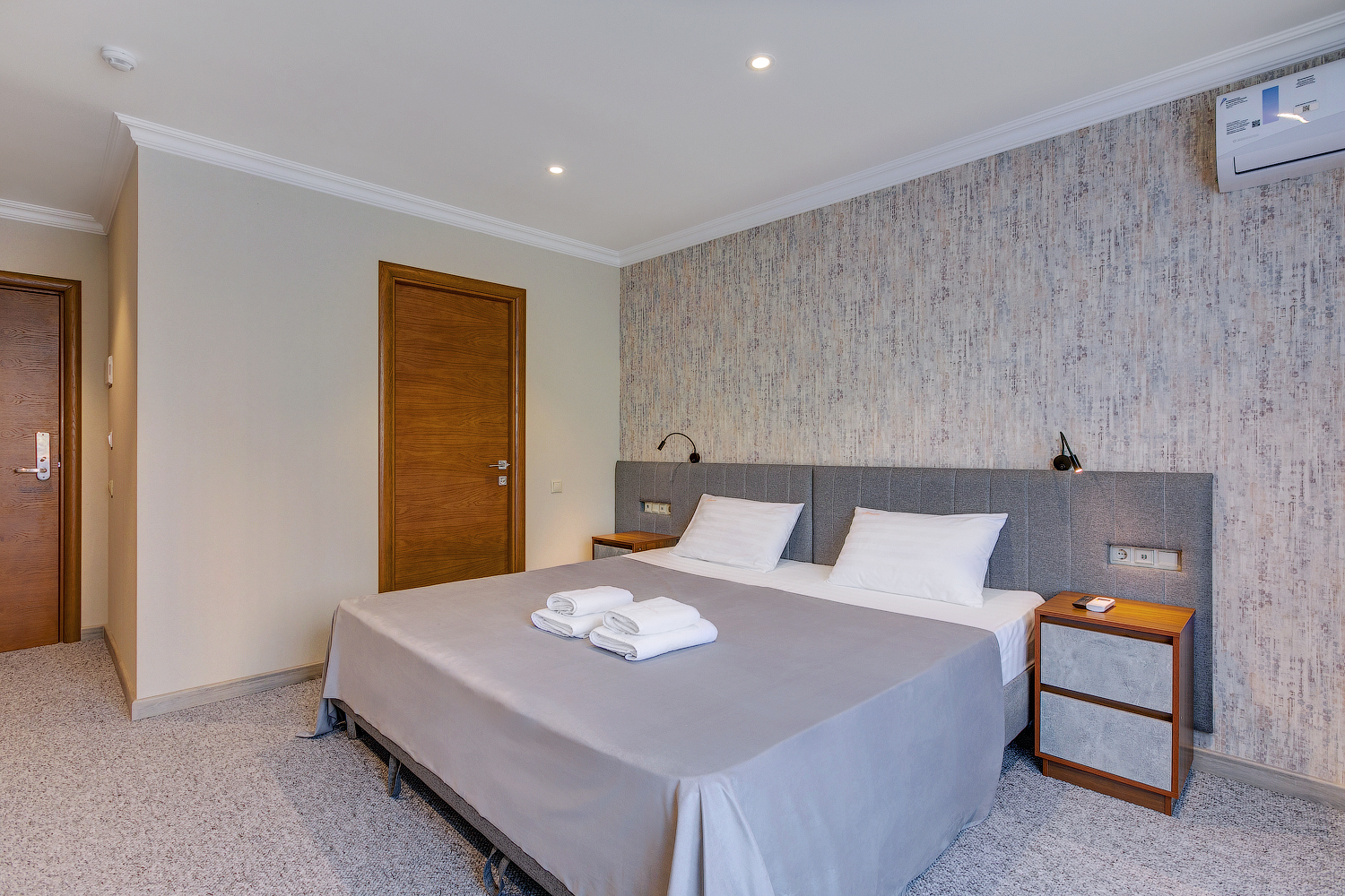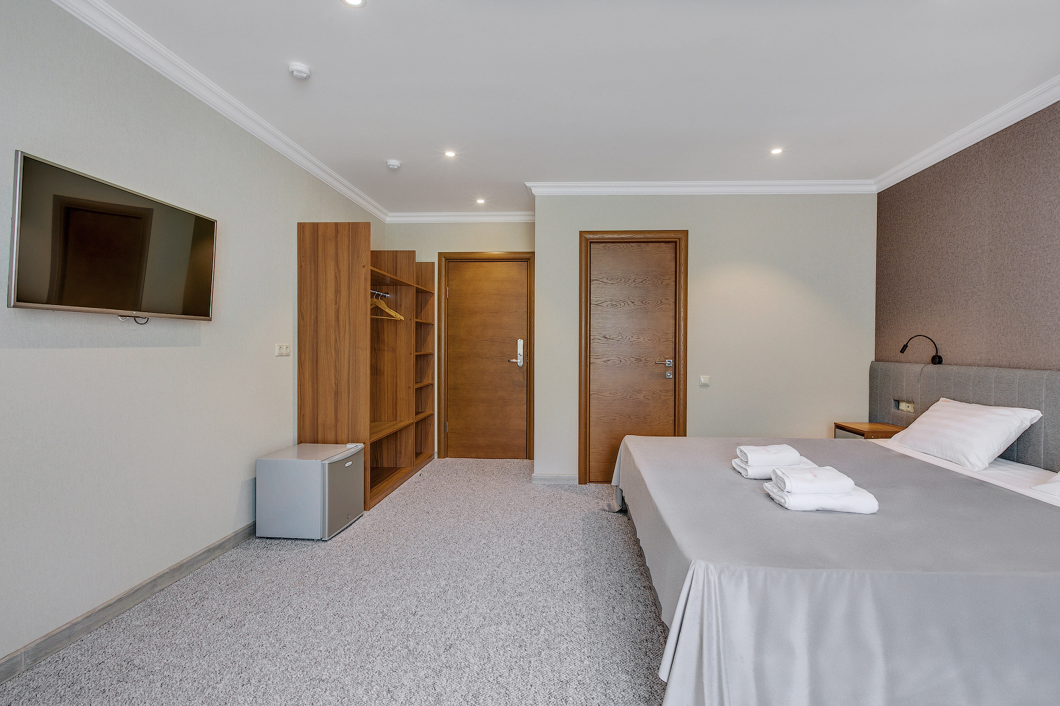 В номере: вешалка, гардеробная, зеркало, кровать двуспальная, прикроватные тумбочки, шкаф, кондиционер, мини-холодильник, телевизор
