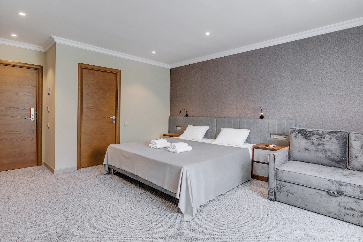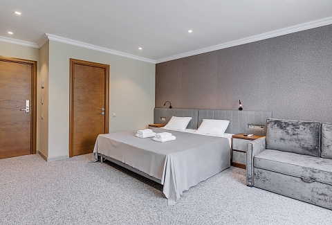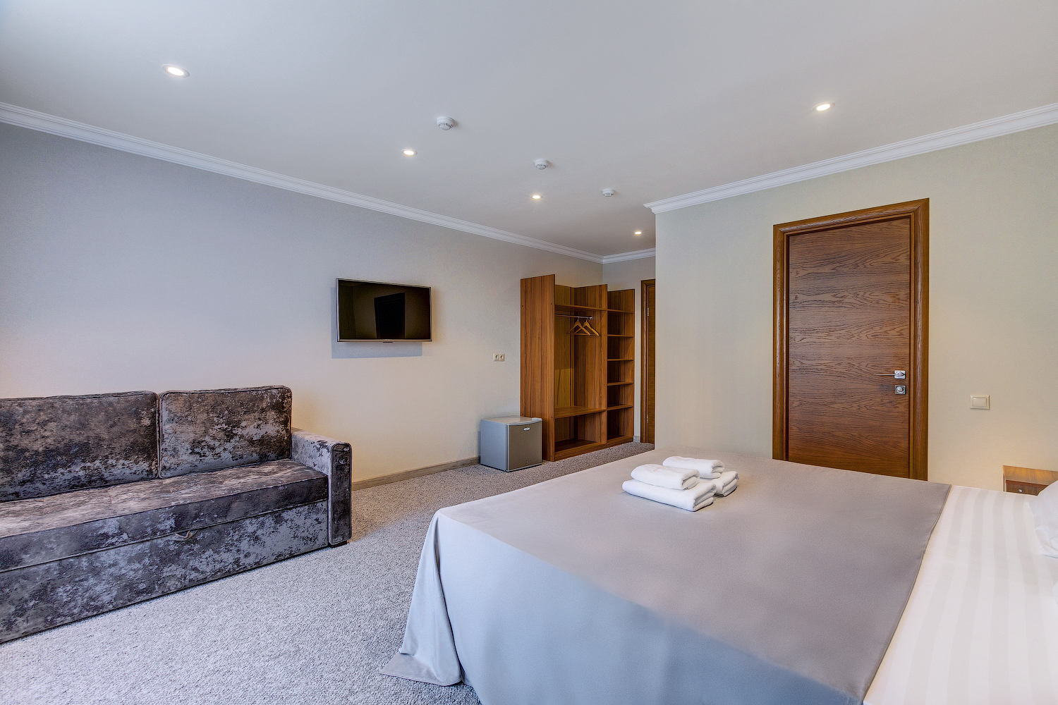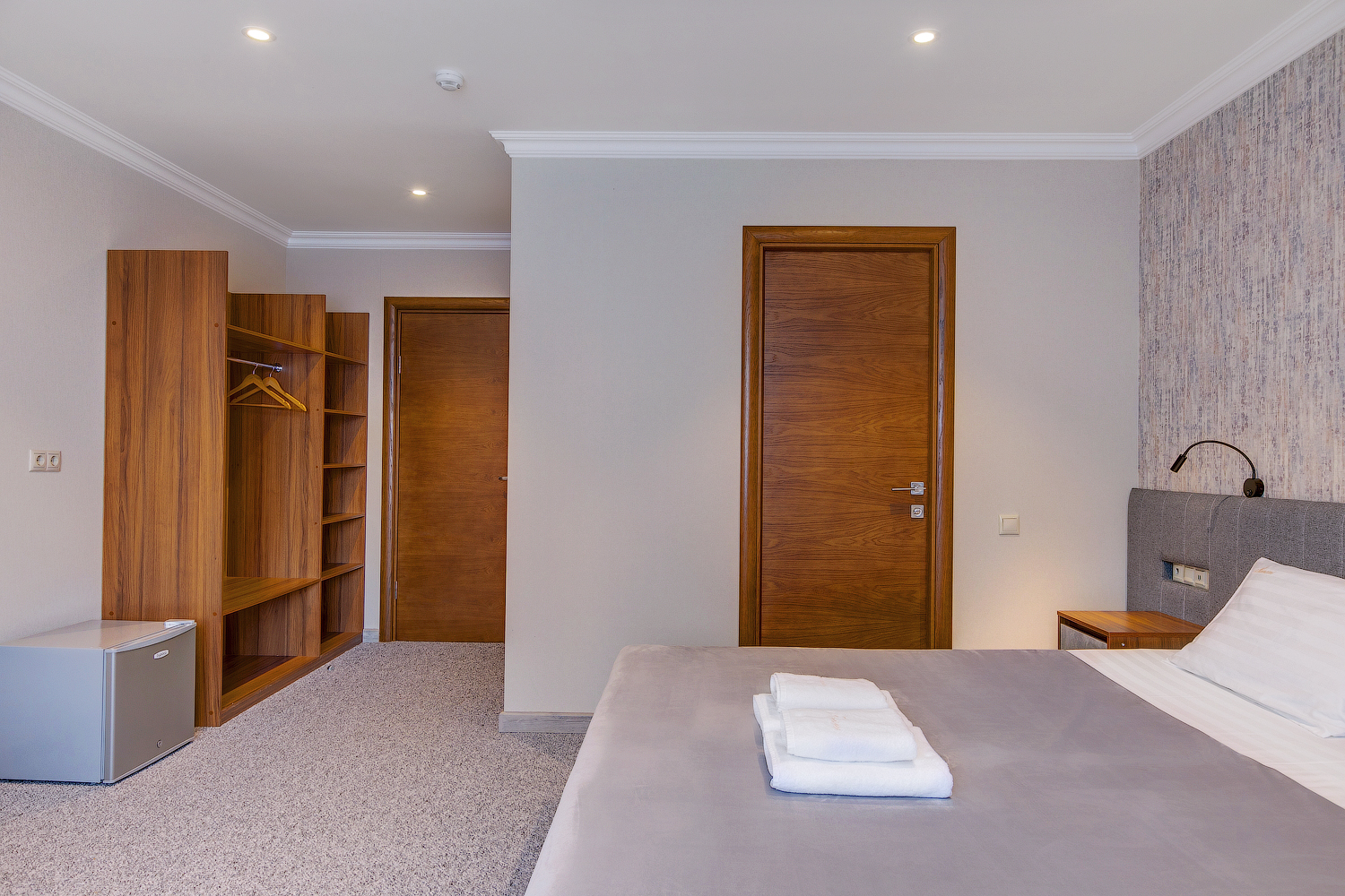 В номере: вешалка, гардеробная, зеркало, кровать двуспальная, прикроватные тумбочки, шкаф, кондиционер, мини-холодильник, телевизор