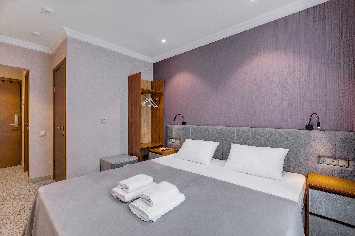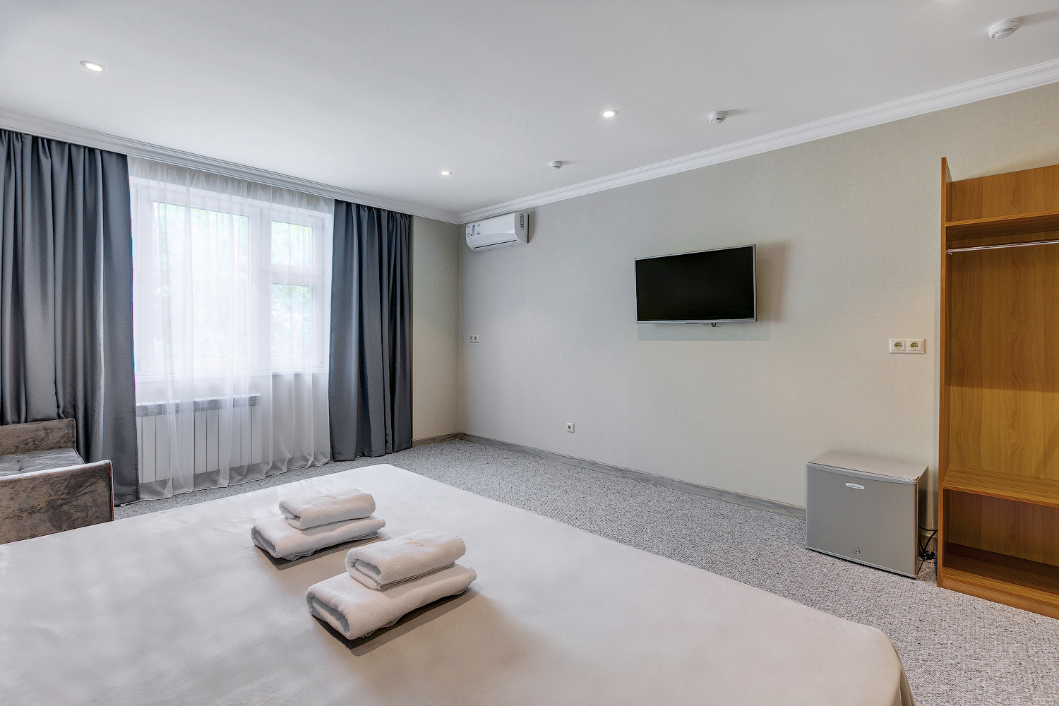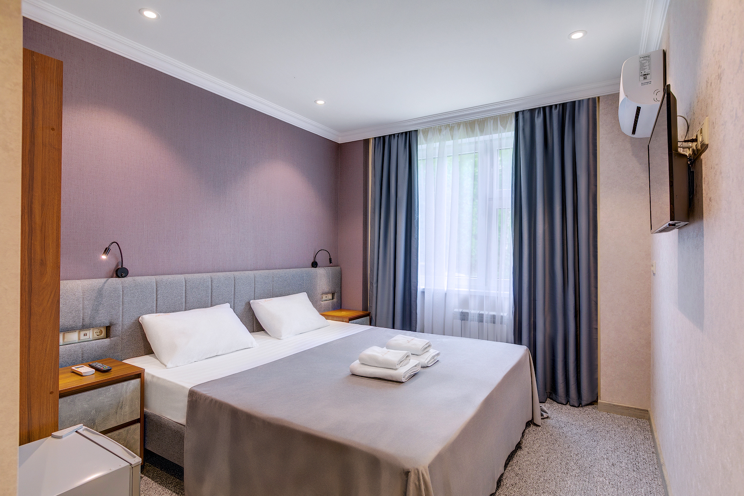 В номере: вешалка, гардеробная, кровать двуспальная, прикроватные тумбочки, кондиционер, телевизор, холодильник