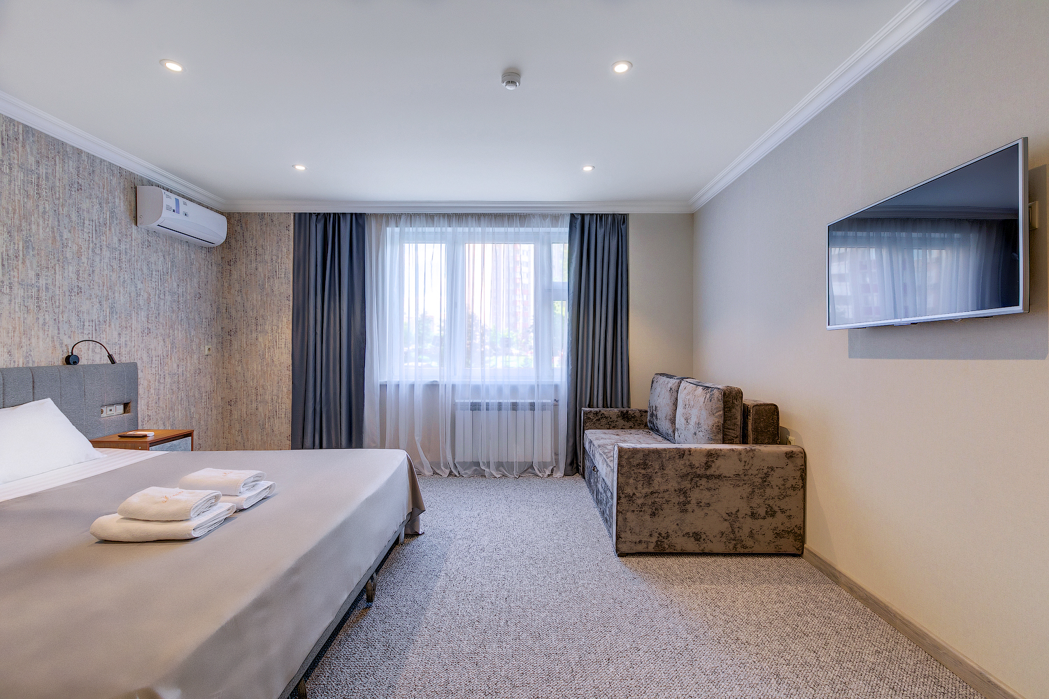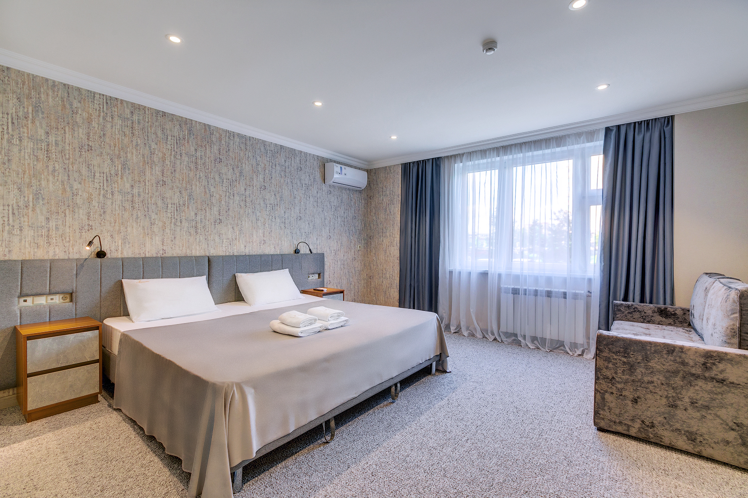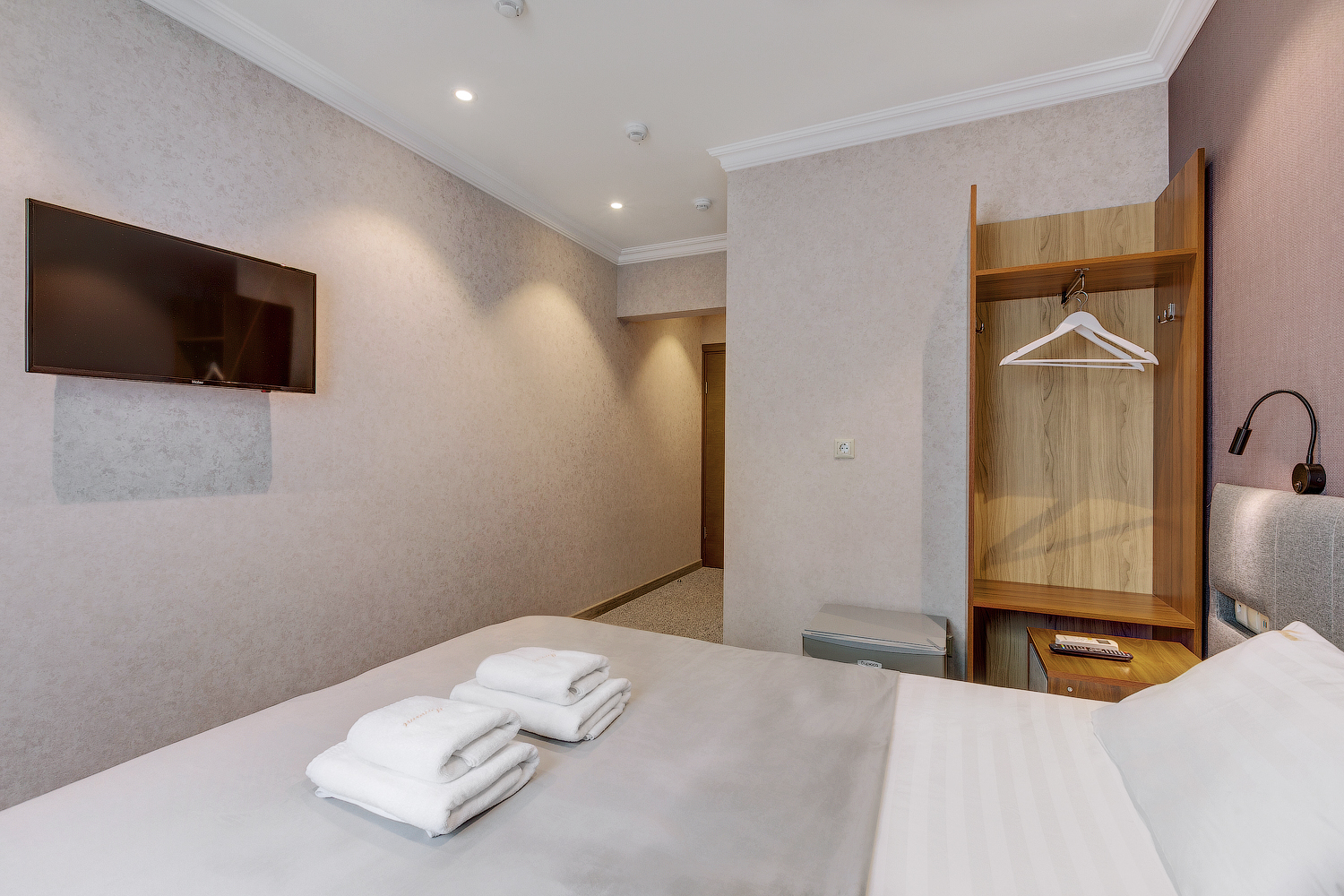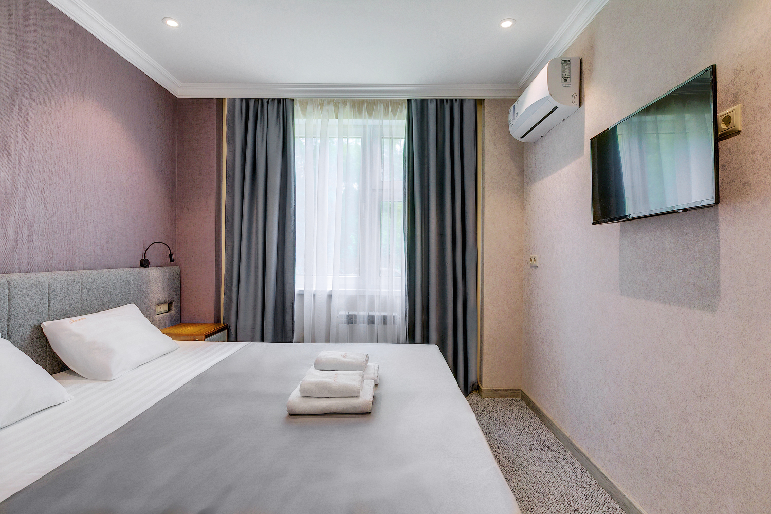 В номере: вешалка, гардеробная, кровать двуспальная, прикроватные тумбочки, кондиционер, телевизор, холодильник