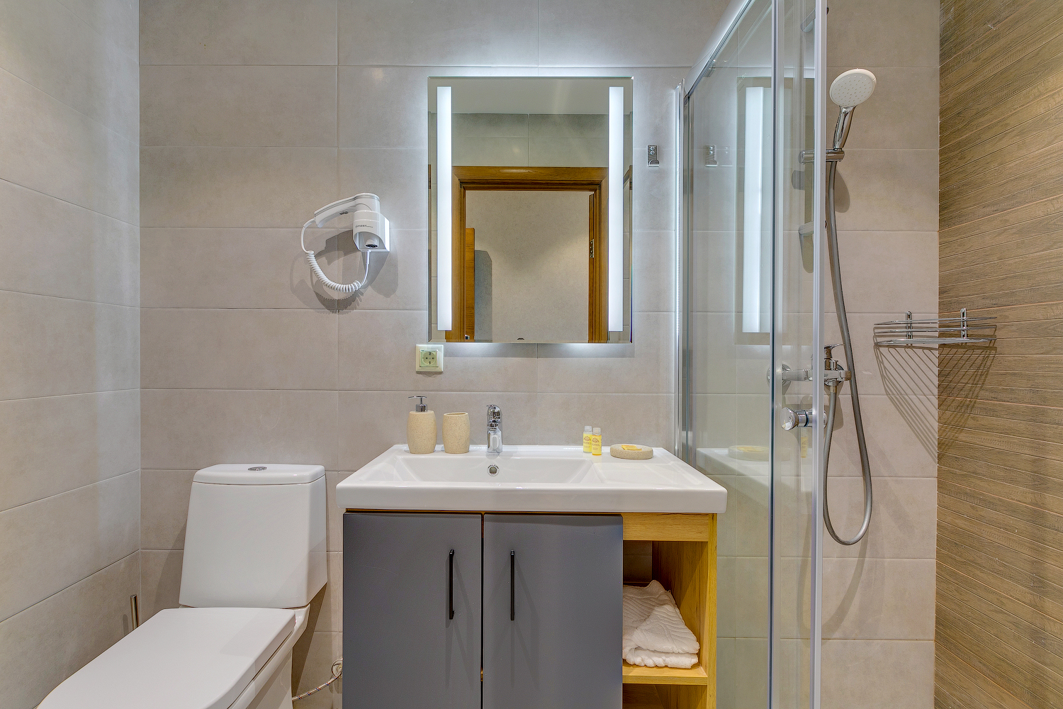 Санузел: с душевой кабиной, туалетные принадлежности, фен