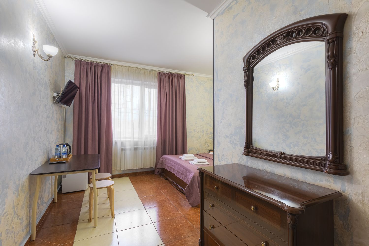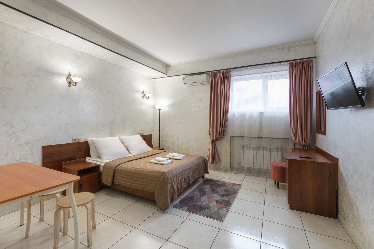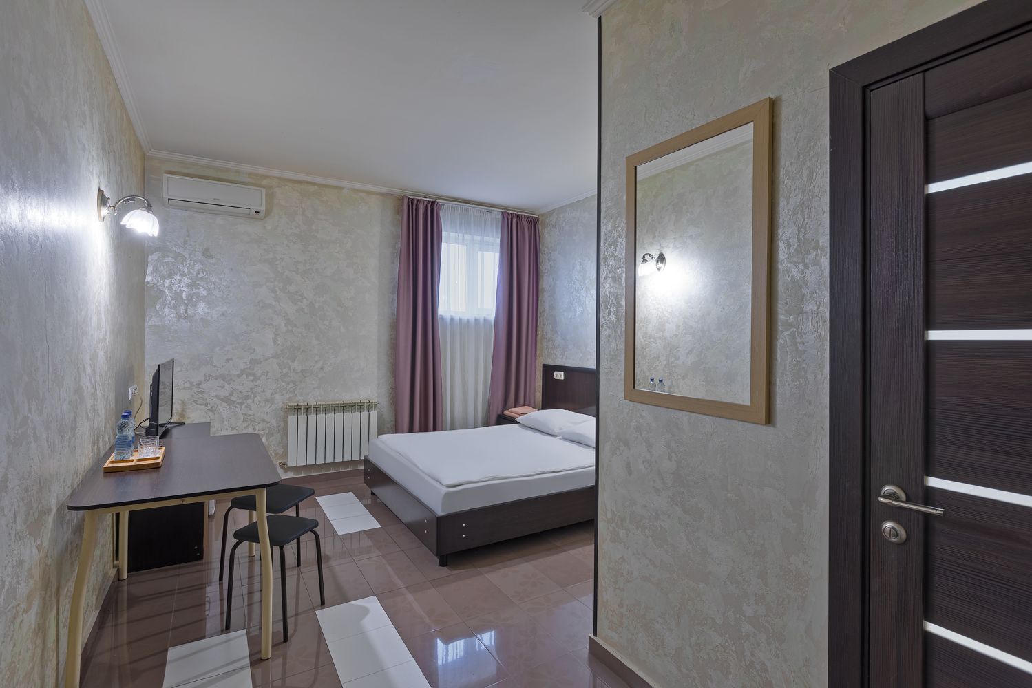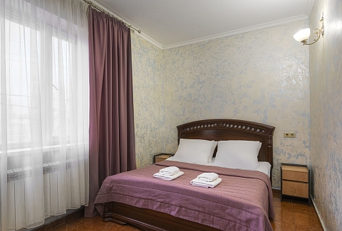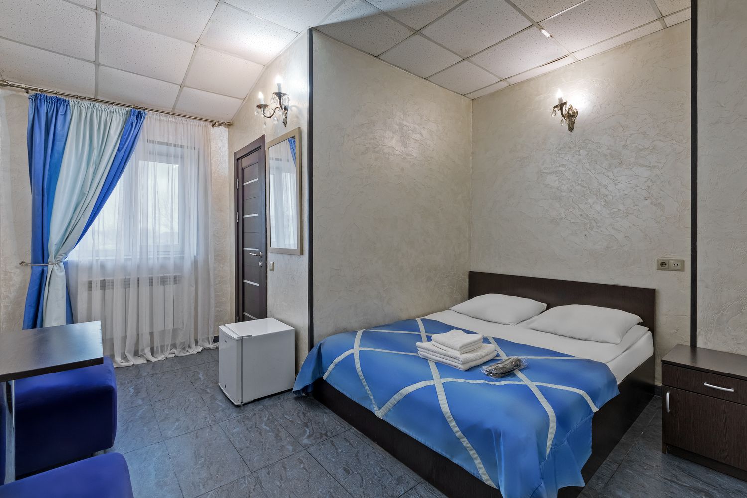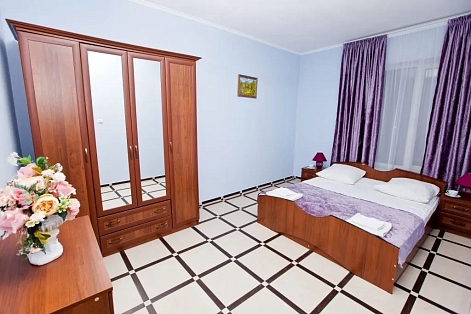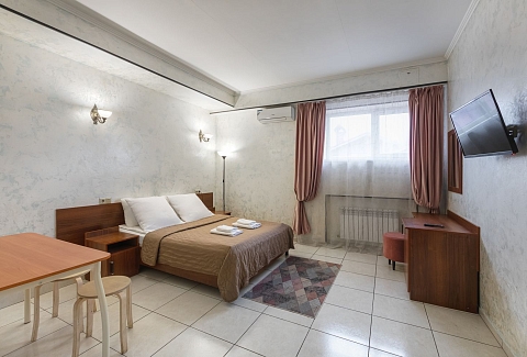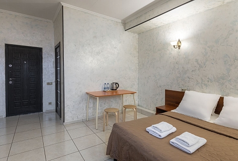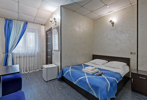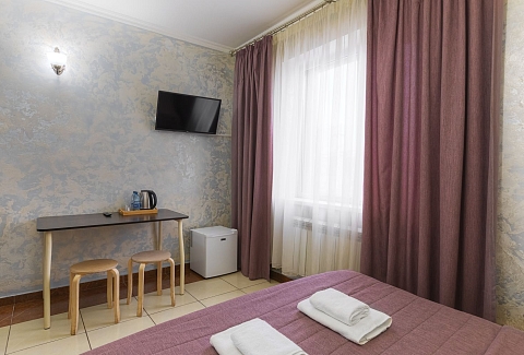 В номере: зеркало, кровать двуспальная, прикроватные тумбочки, стол, стул, шкаф, кондиционер, мини-холодильник, телевизор ЖК, электрочайник