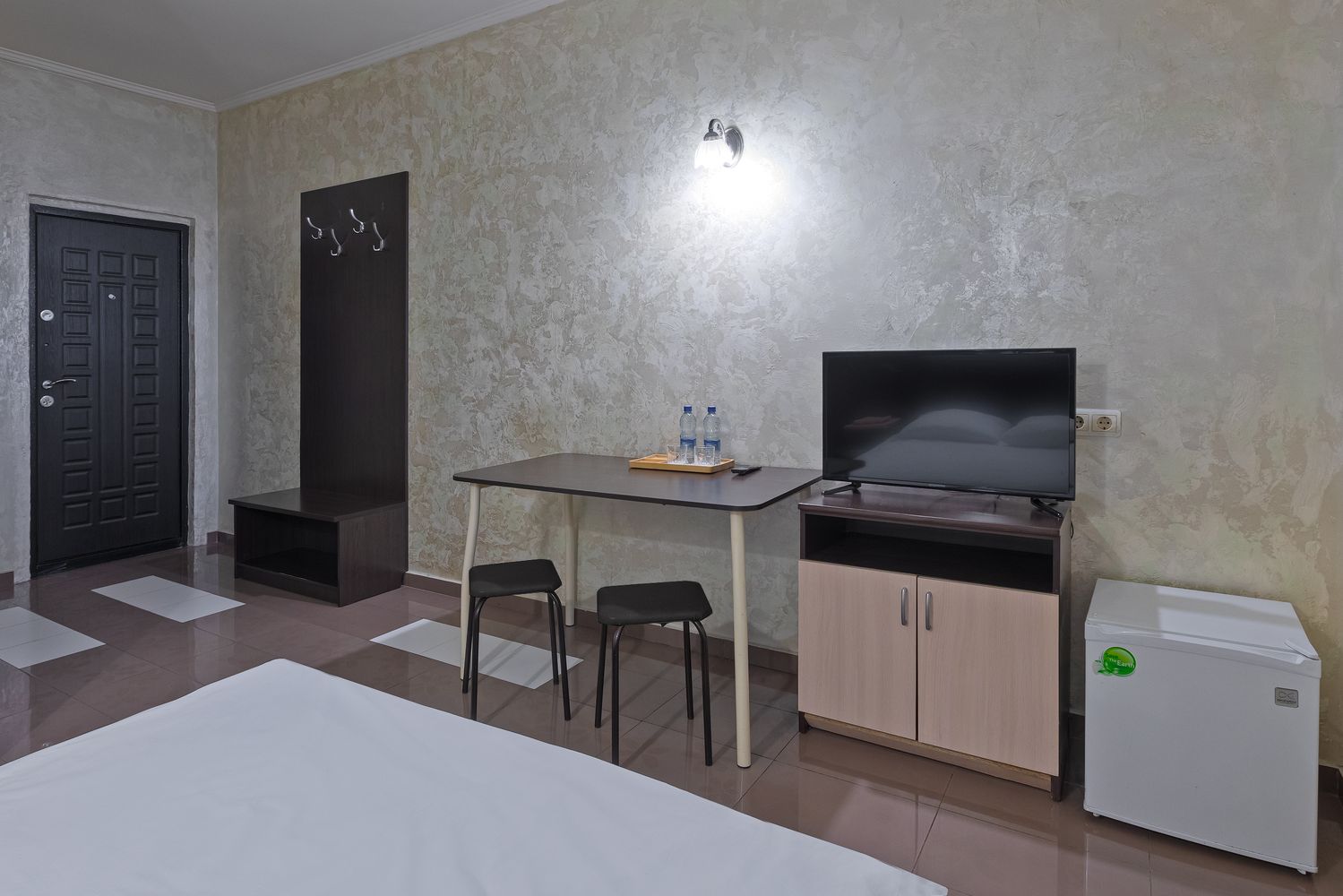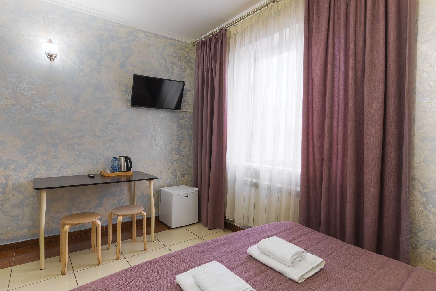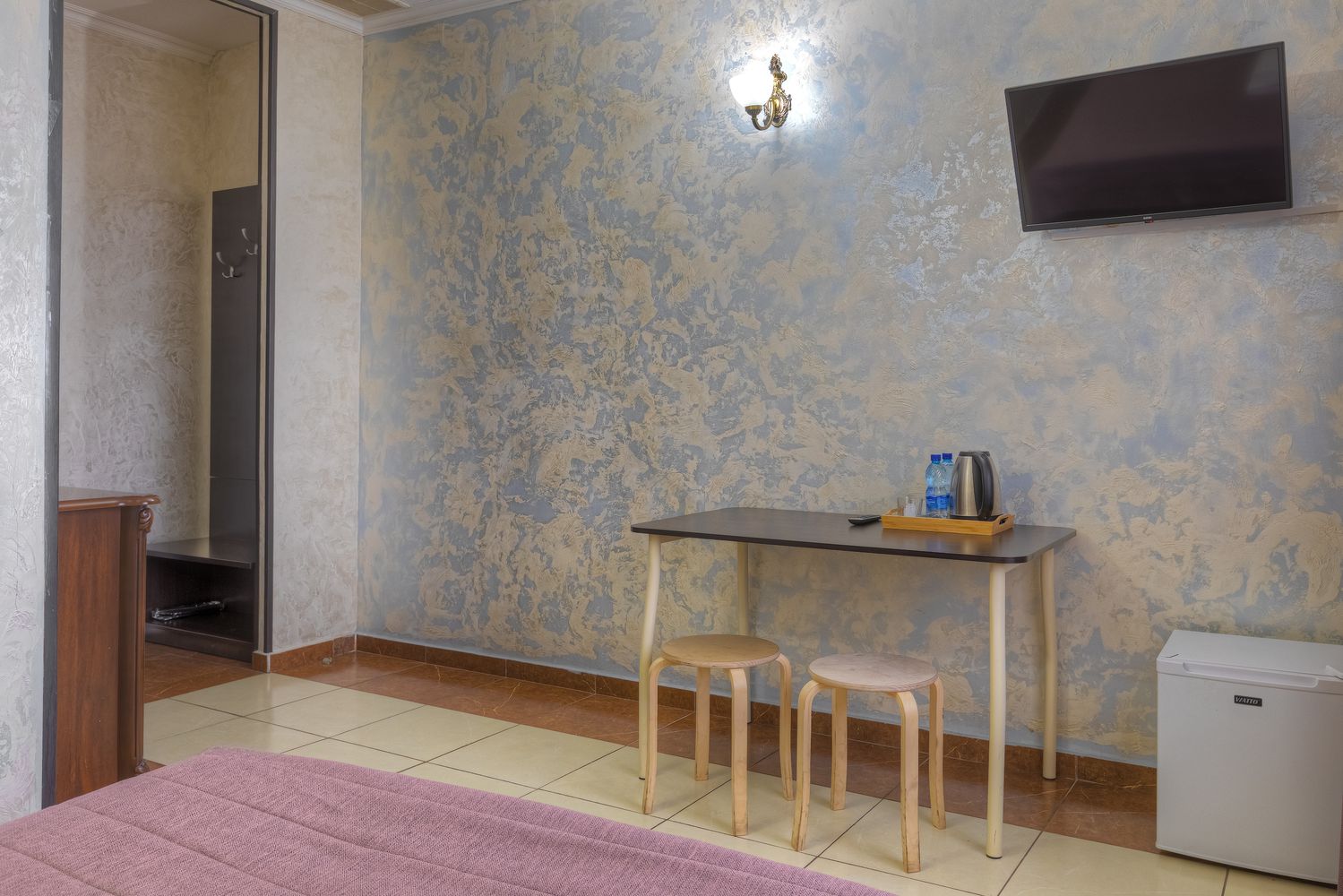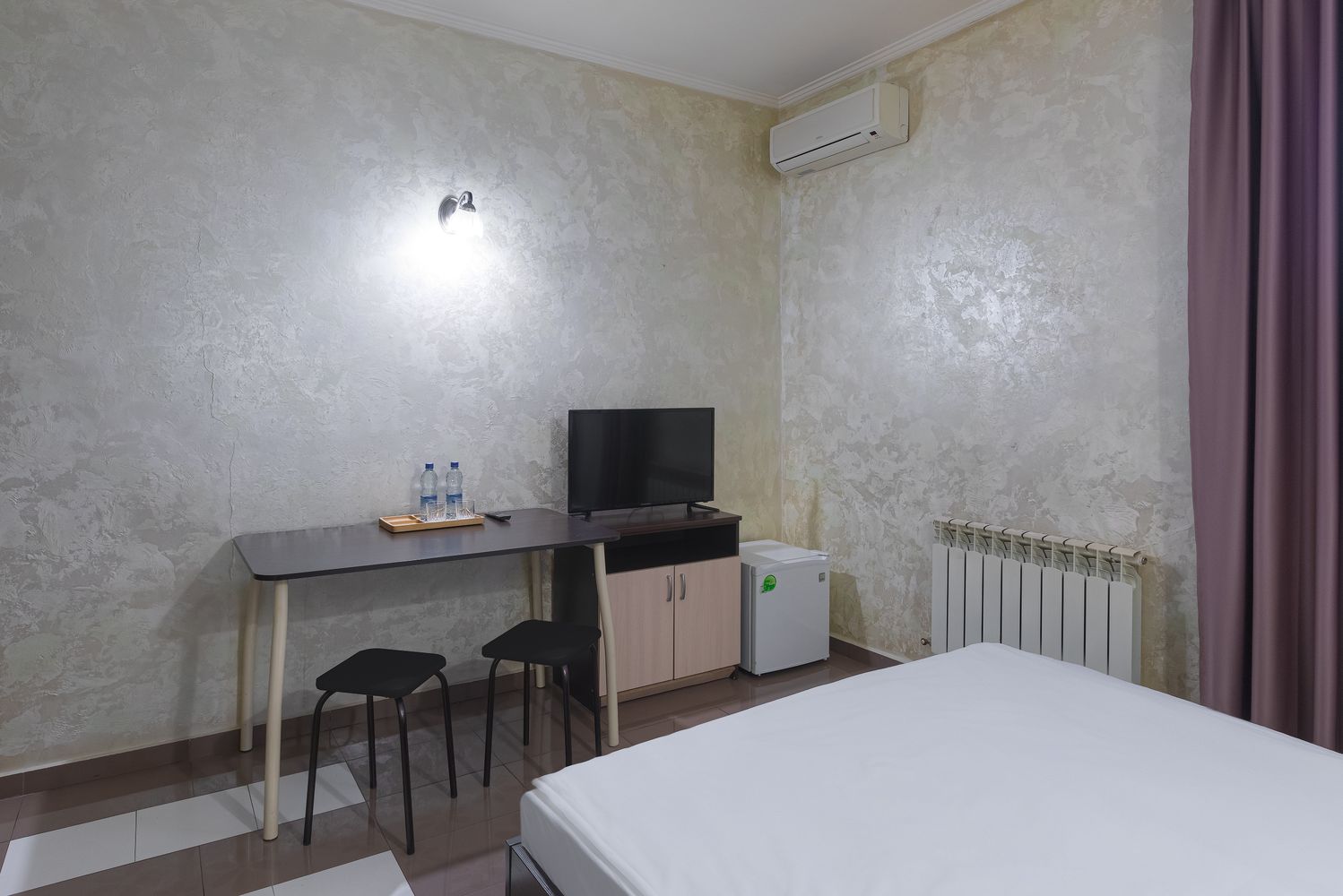 В номере: зеркало, кровать двуспальная, прикроватные тумбочки, стол, стул, шкаф, кондиционер, мини-холодильник, телевизор ЖК, электрочайник