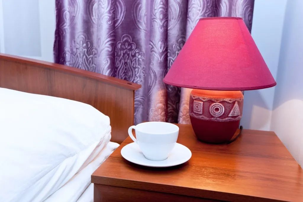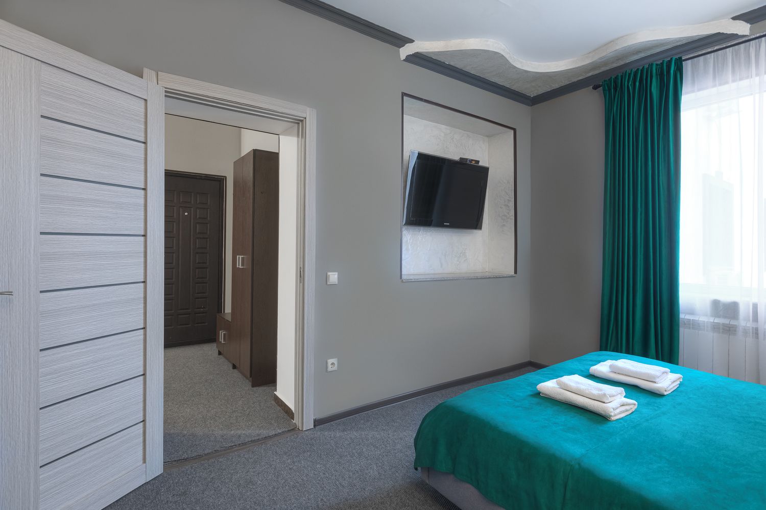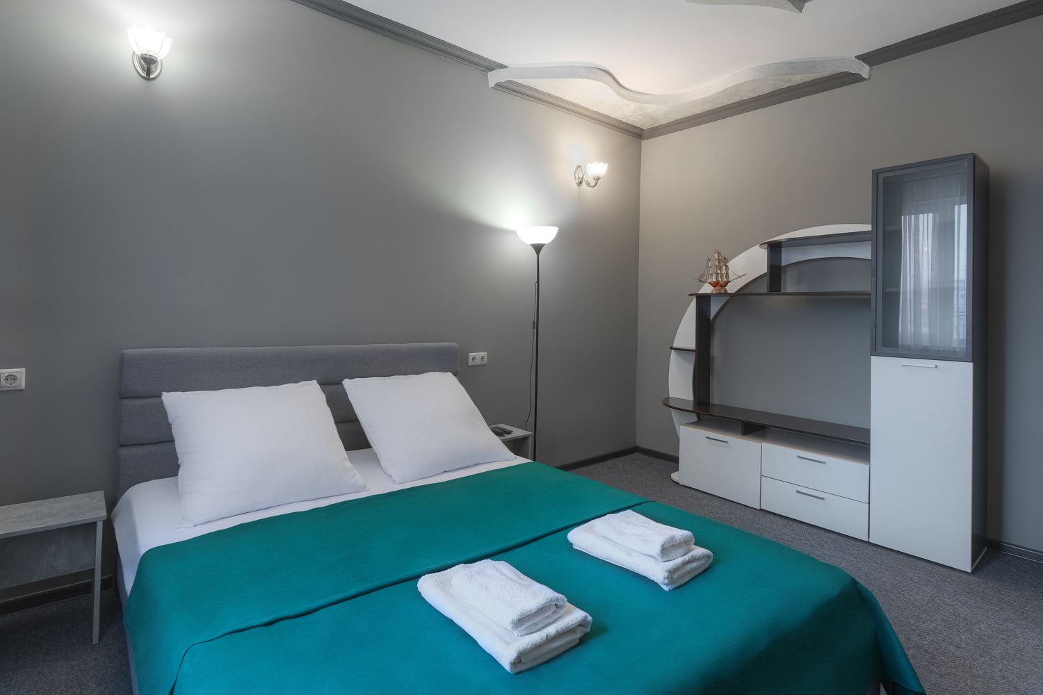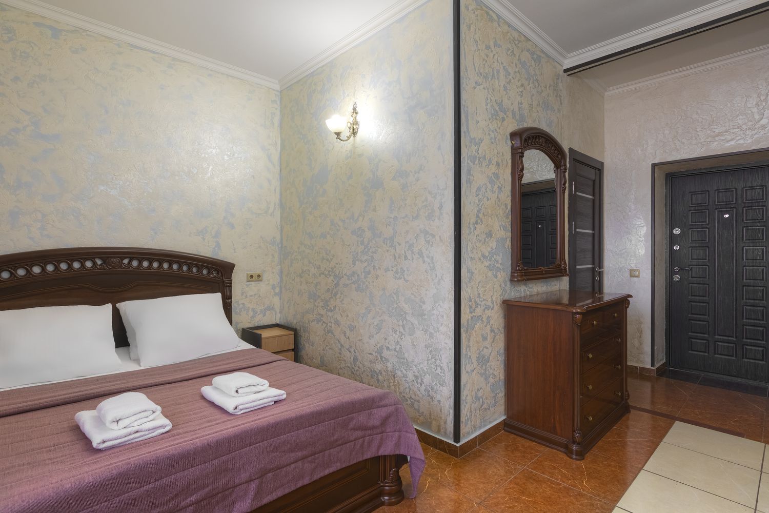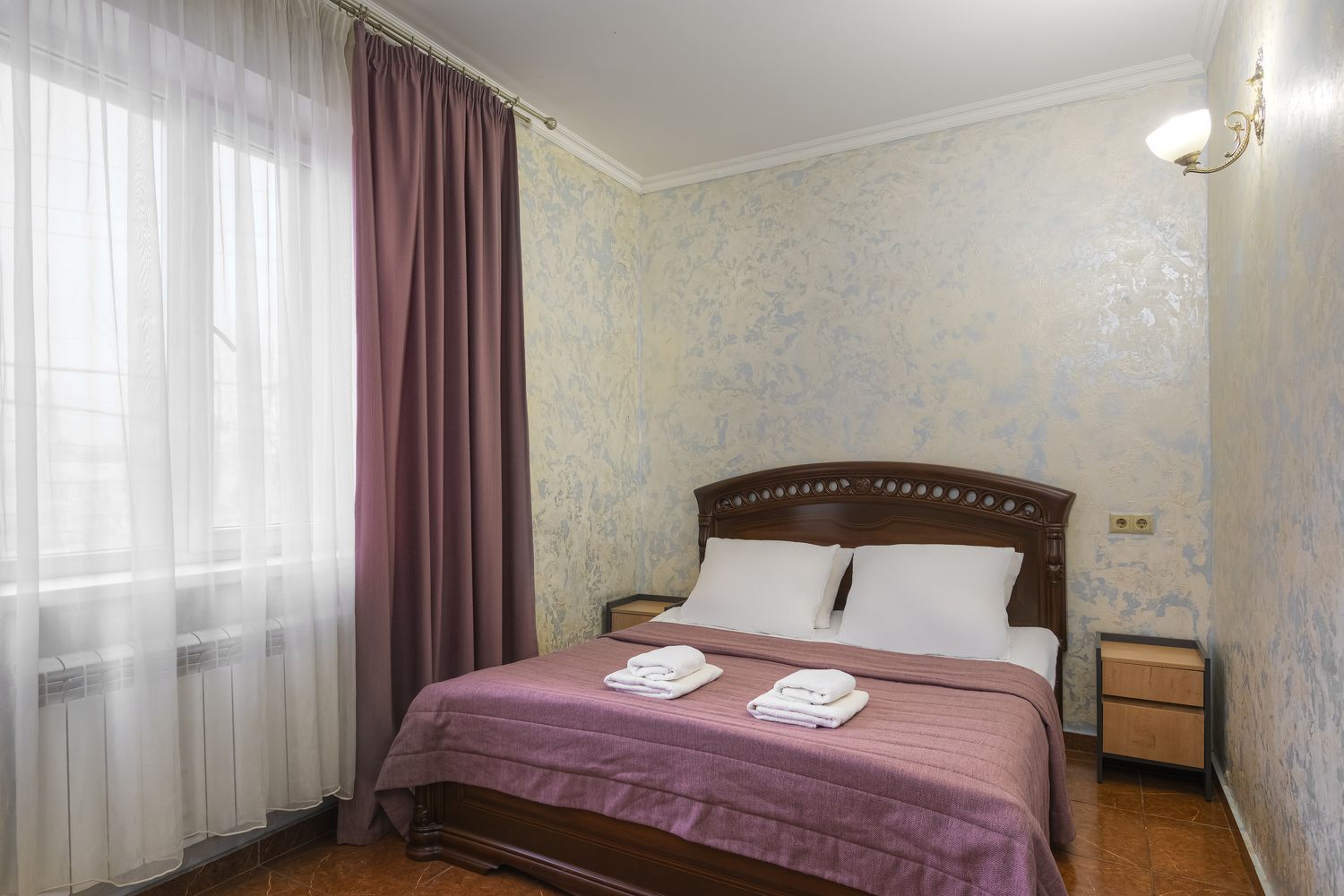 В номере: зеркало, кровать двуспальная, прикроватные тумбочки, стол, стул, шкаф, кондиционер, мини-холодильник, телевизор ЖК, электрочайник