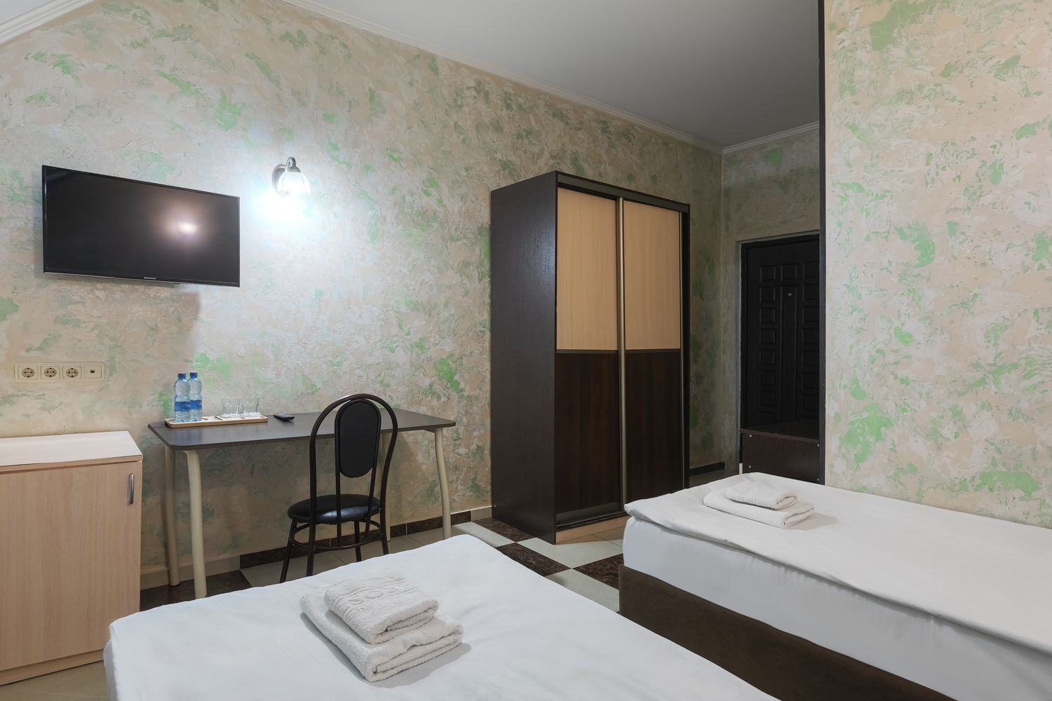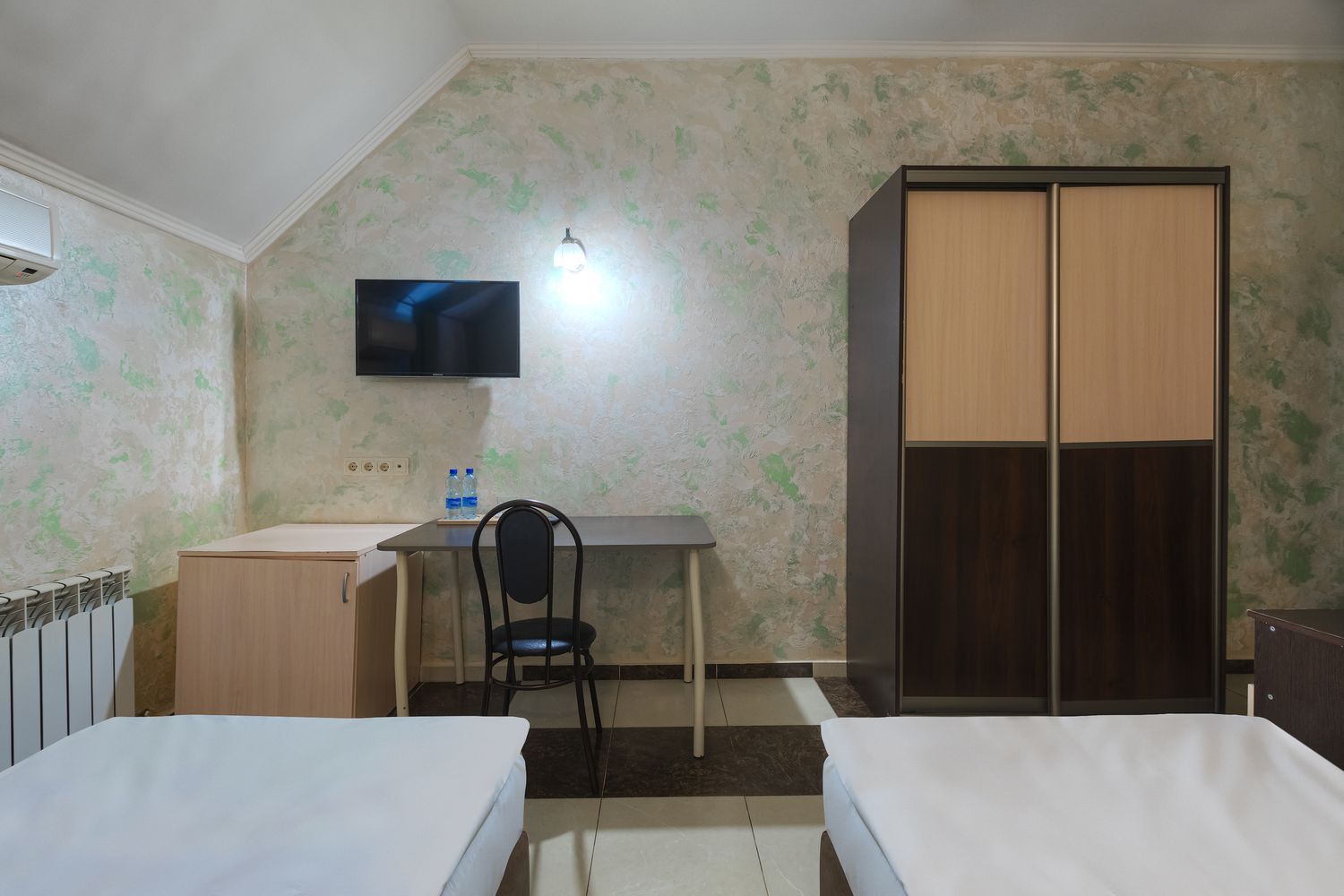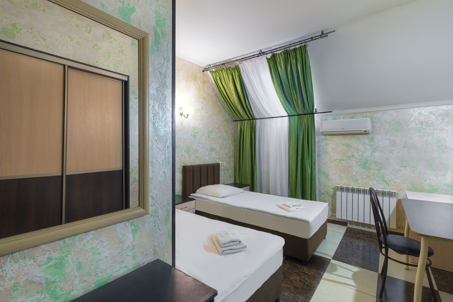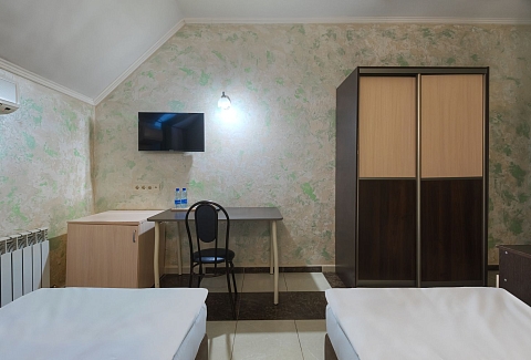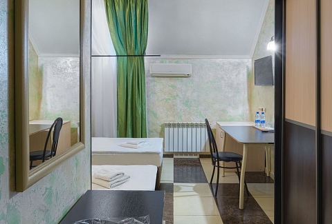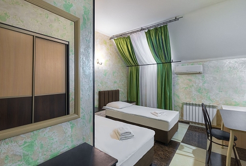 В номере: зеркало, кровати односпальные, прикроватные тумбочки, стол, стул, шкаф, кондиционер, мини-холодильник, телевизор ЖК, электрочайник