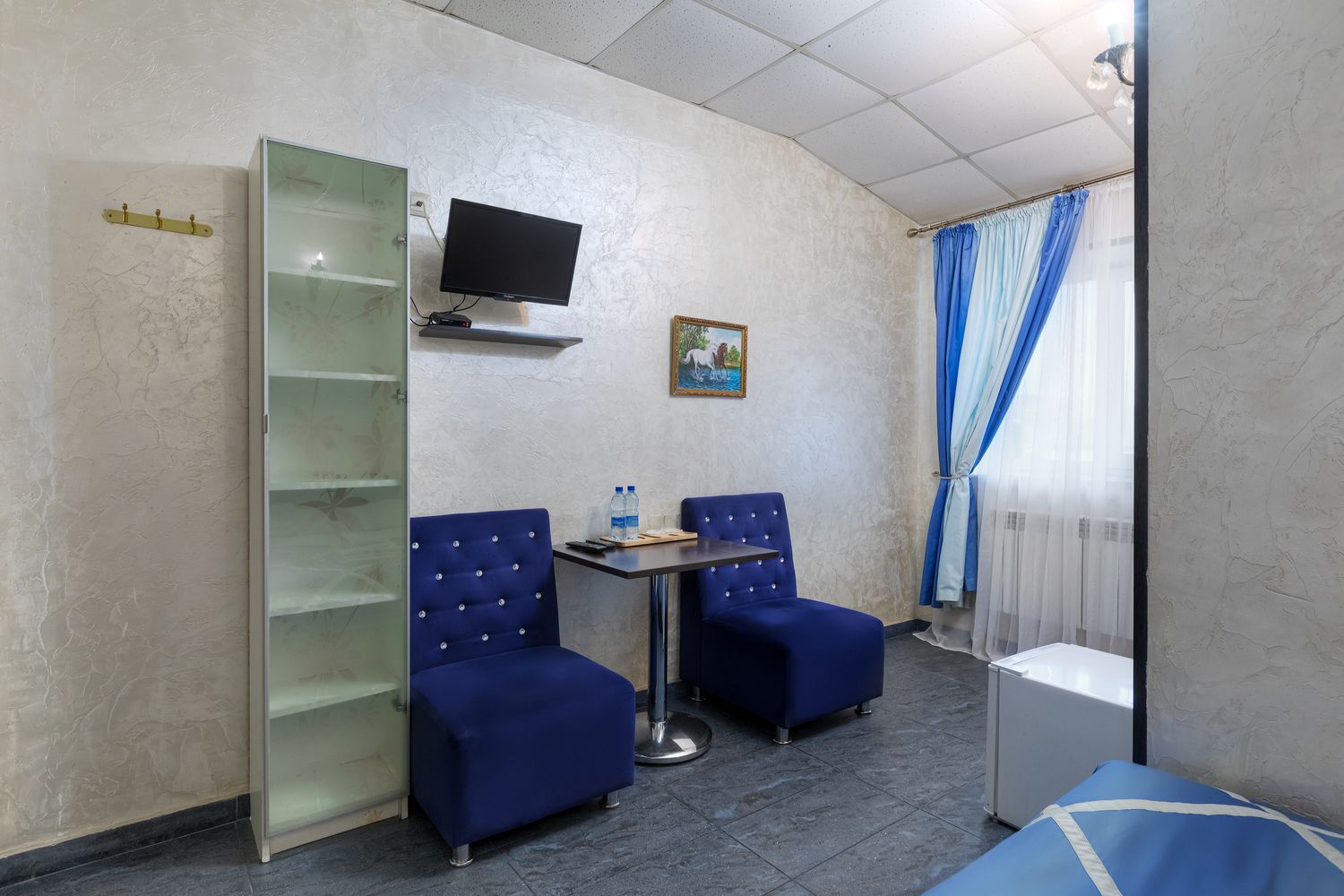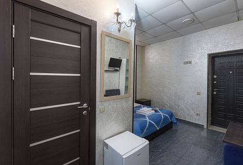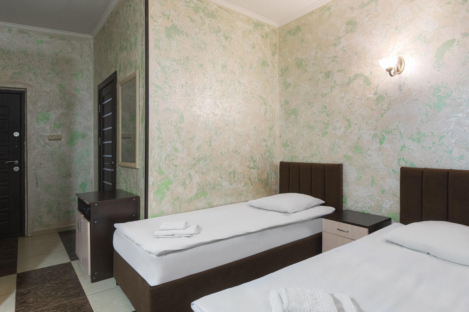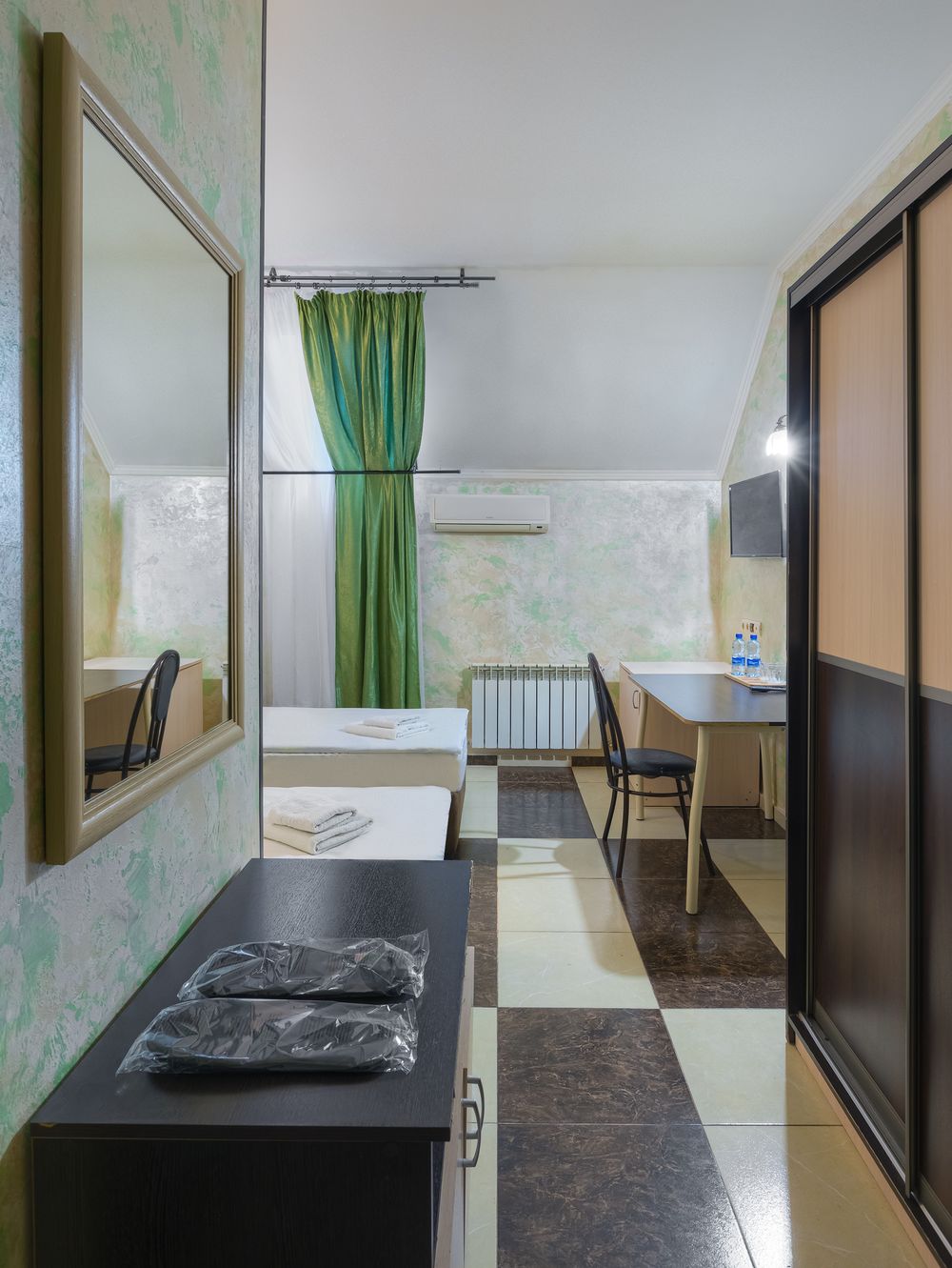 В номере: зеркало, кровати односпальные, прикроватные тумбочки, стол, стул, шкаф, кондиционер, мини-холодильник, телевизор ЖК, электрочайник
