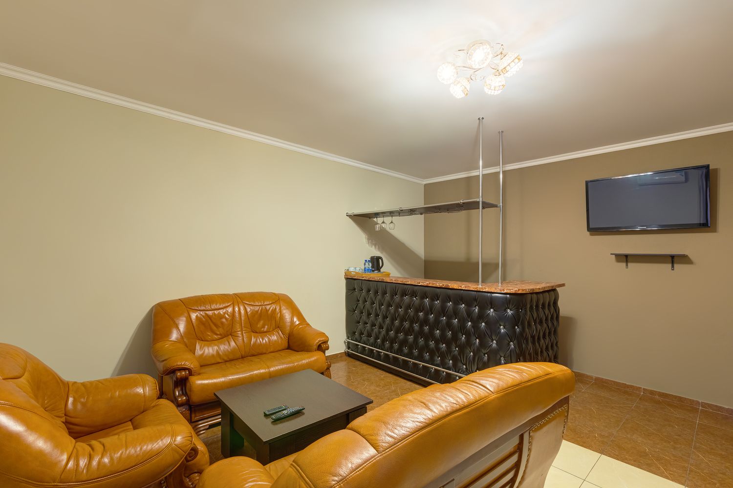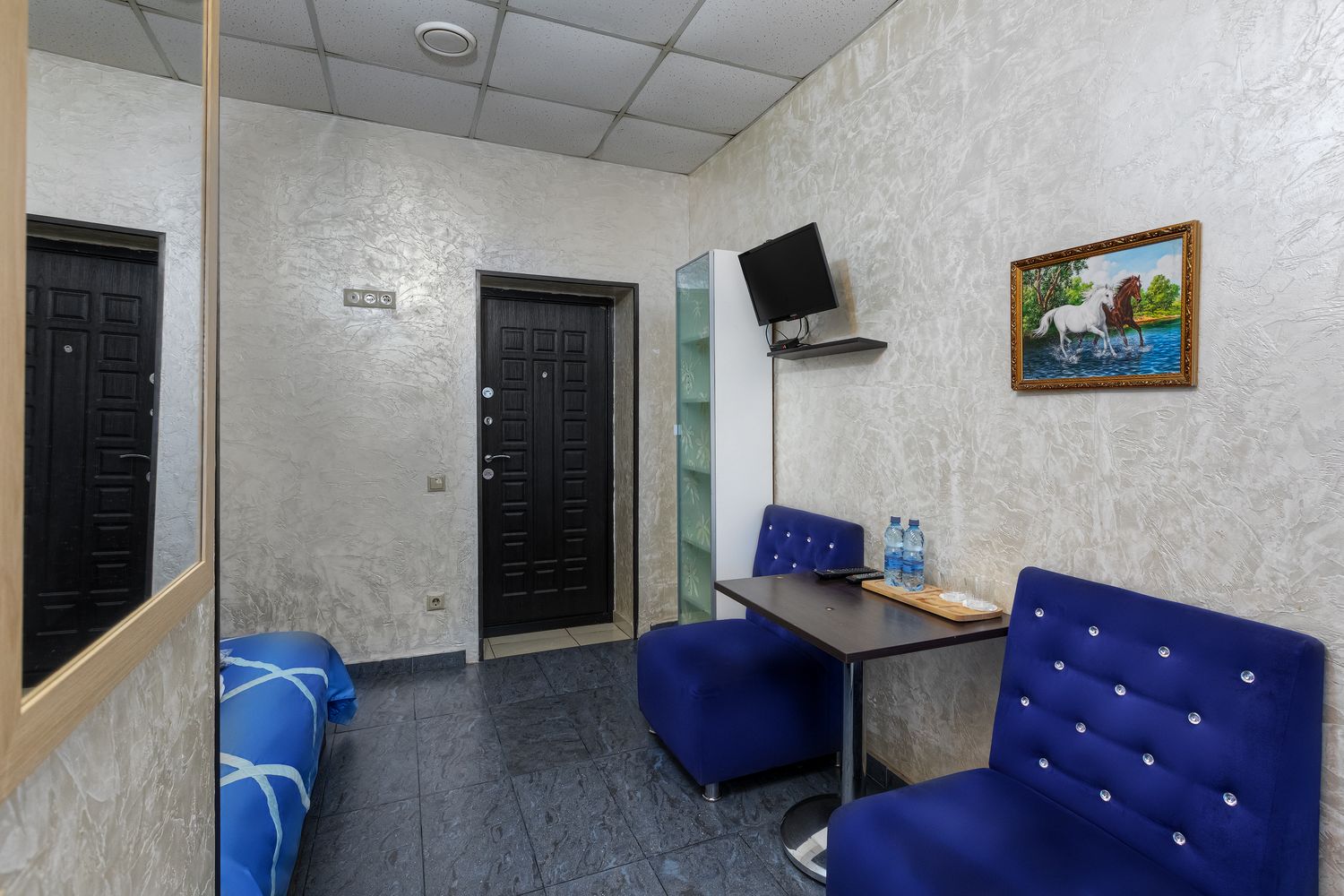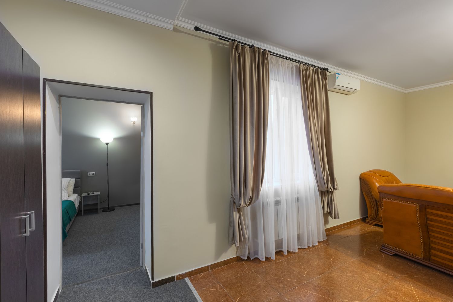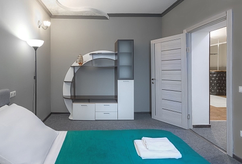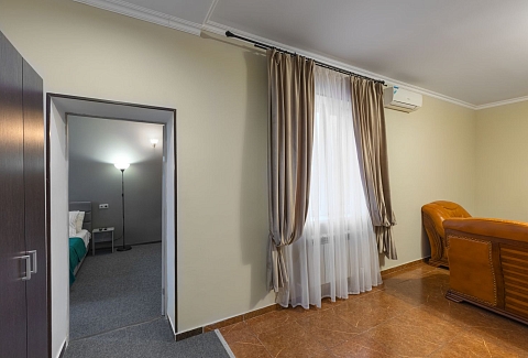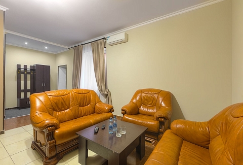 В номере: диван, зеркало, кресла, кровать двуспальная, прикроватный столик, стол, шкаф, кондиционер, мини-холодильник, телевизор ЖК, электрочайник