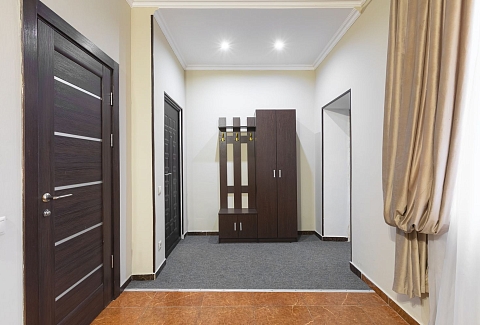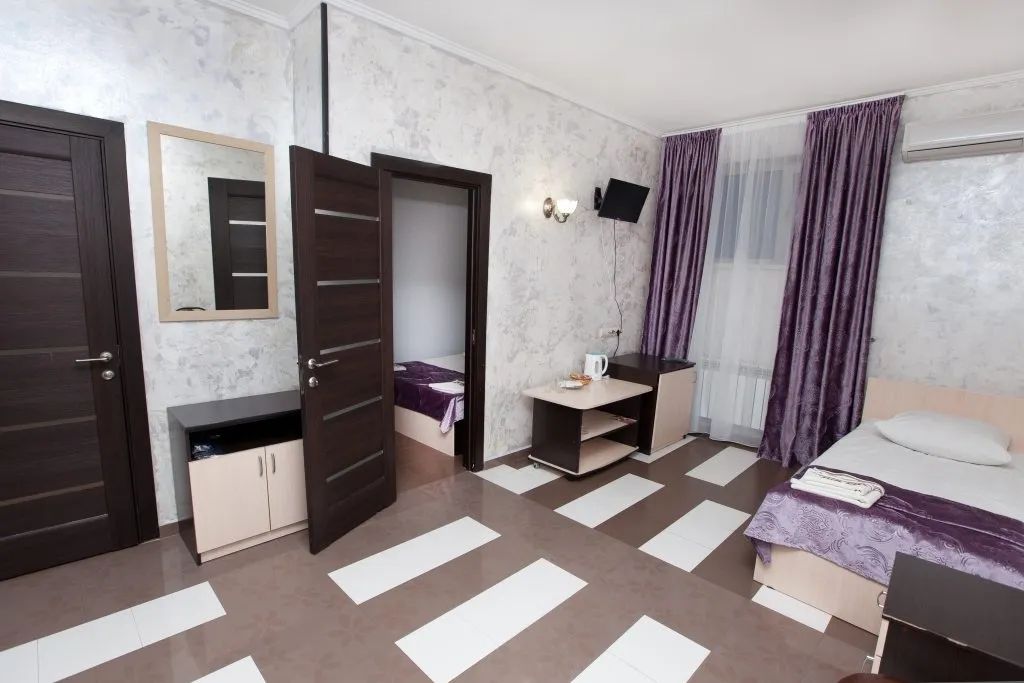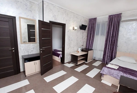 В номере: зеркало, кровать двуспальная, кровать односпальная, прикроватные тумбочки, стол, стул, шкаф, кондиционер, мини-холодильник, телевизор ЖК, электрочайник