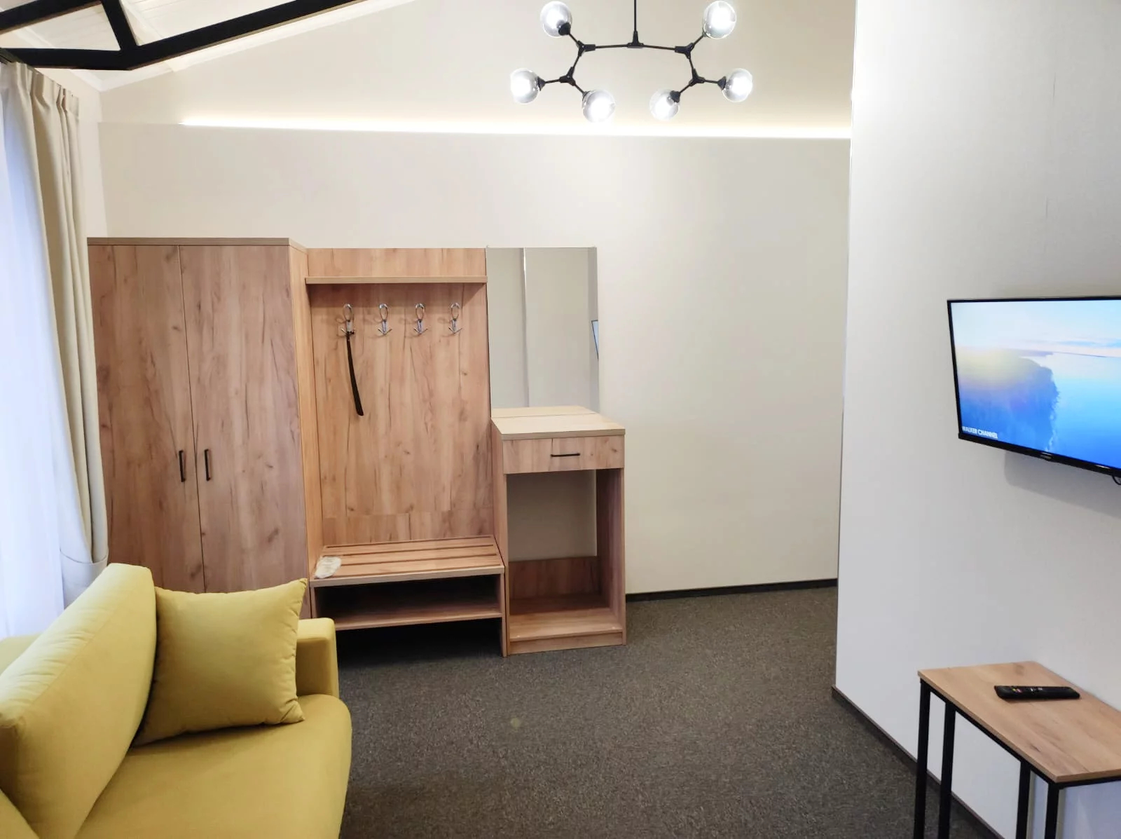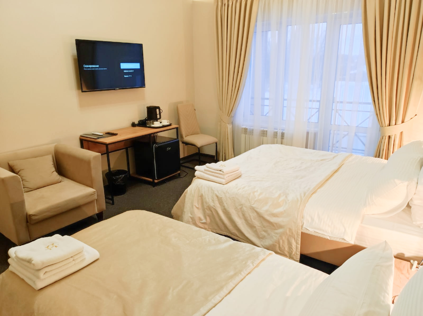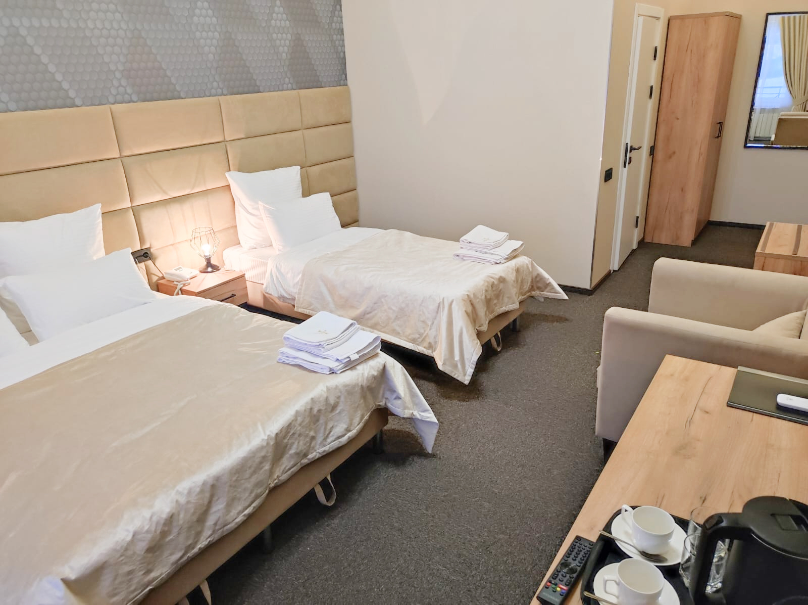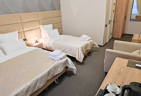 В номере: диван, зеркало, кровати односпальные /одна двуспальная кровать, прикроватные тумбочки, стол, стул, шкаф, кондиционер, мини-холодильник, телевизор ЖК, телефон, чайный набор посуды, электрочайник