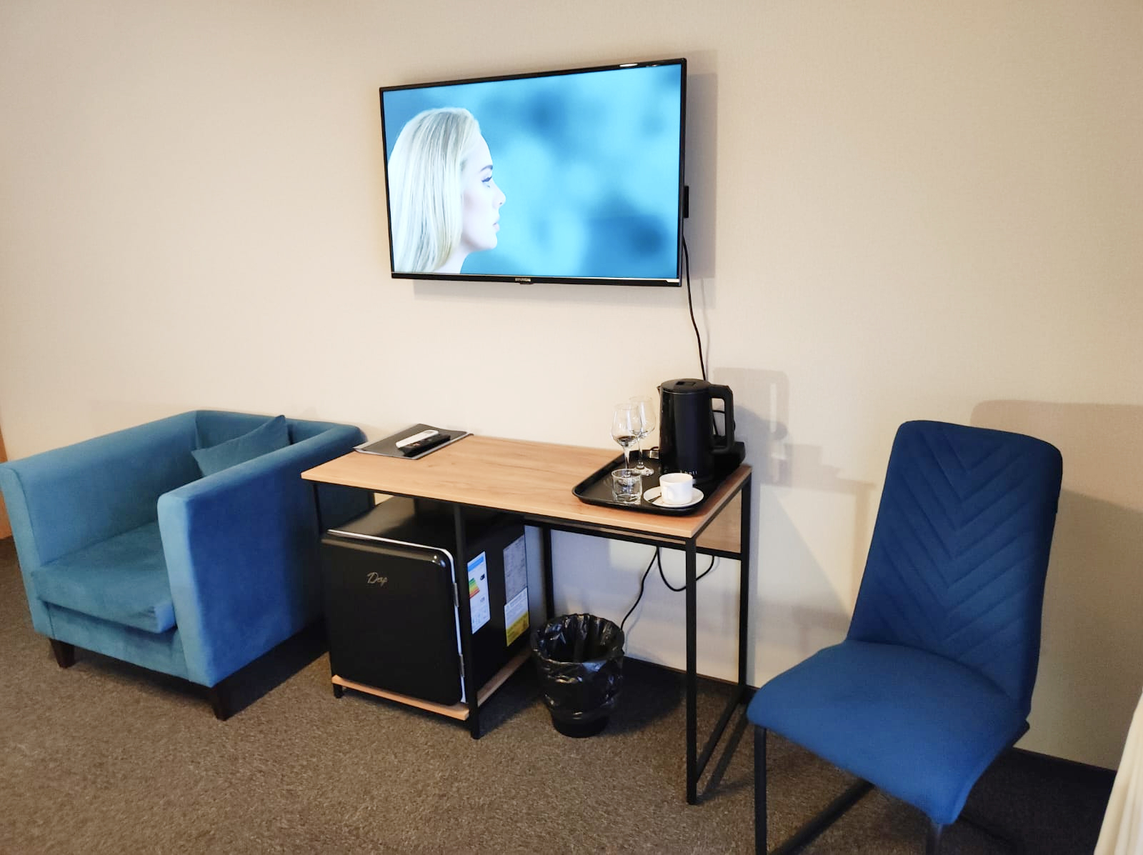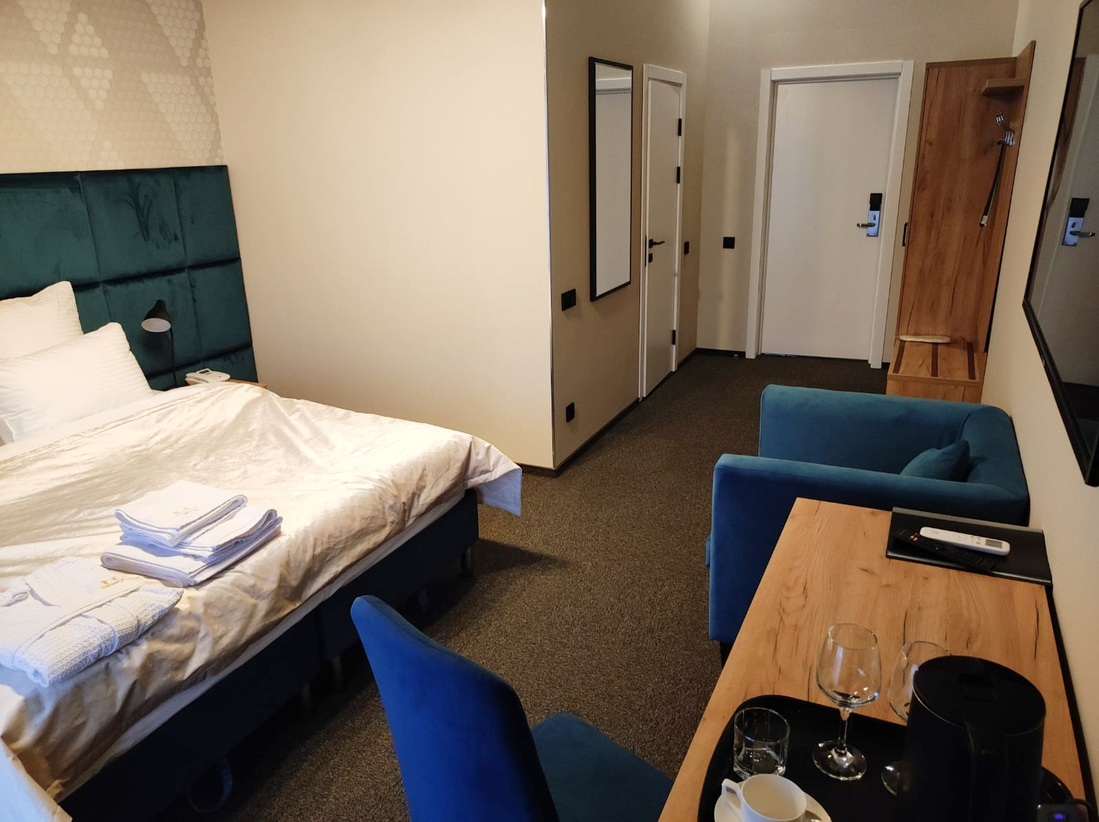 В номере: зеркало, кресло, кровати односпальные /одна двуспальная кровать, прикроватные тумбочки, стол, стул, шкаф, кондиционер, мини-холодильник, телевизор ЖК, телефон, чайный набор посуды, электрочайник