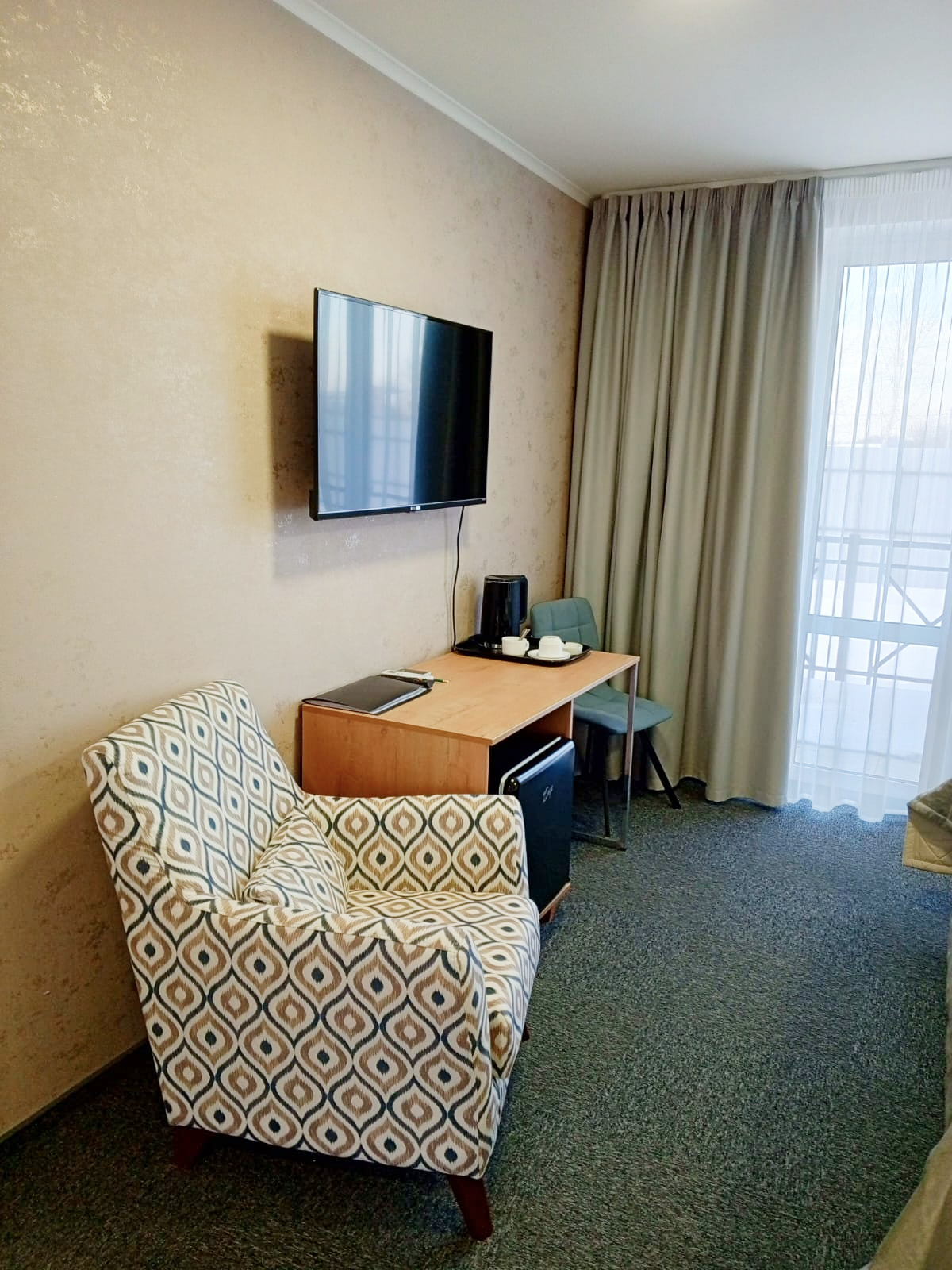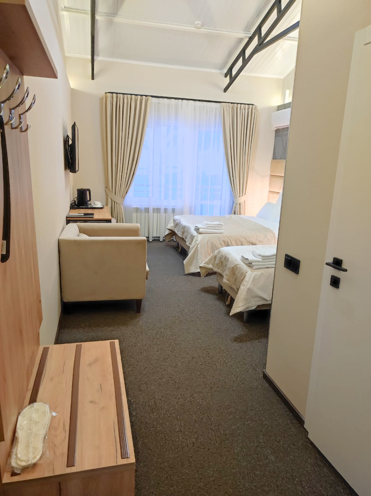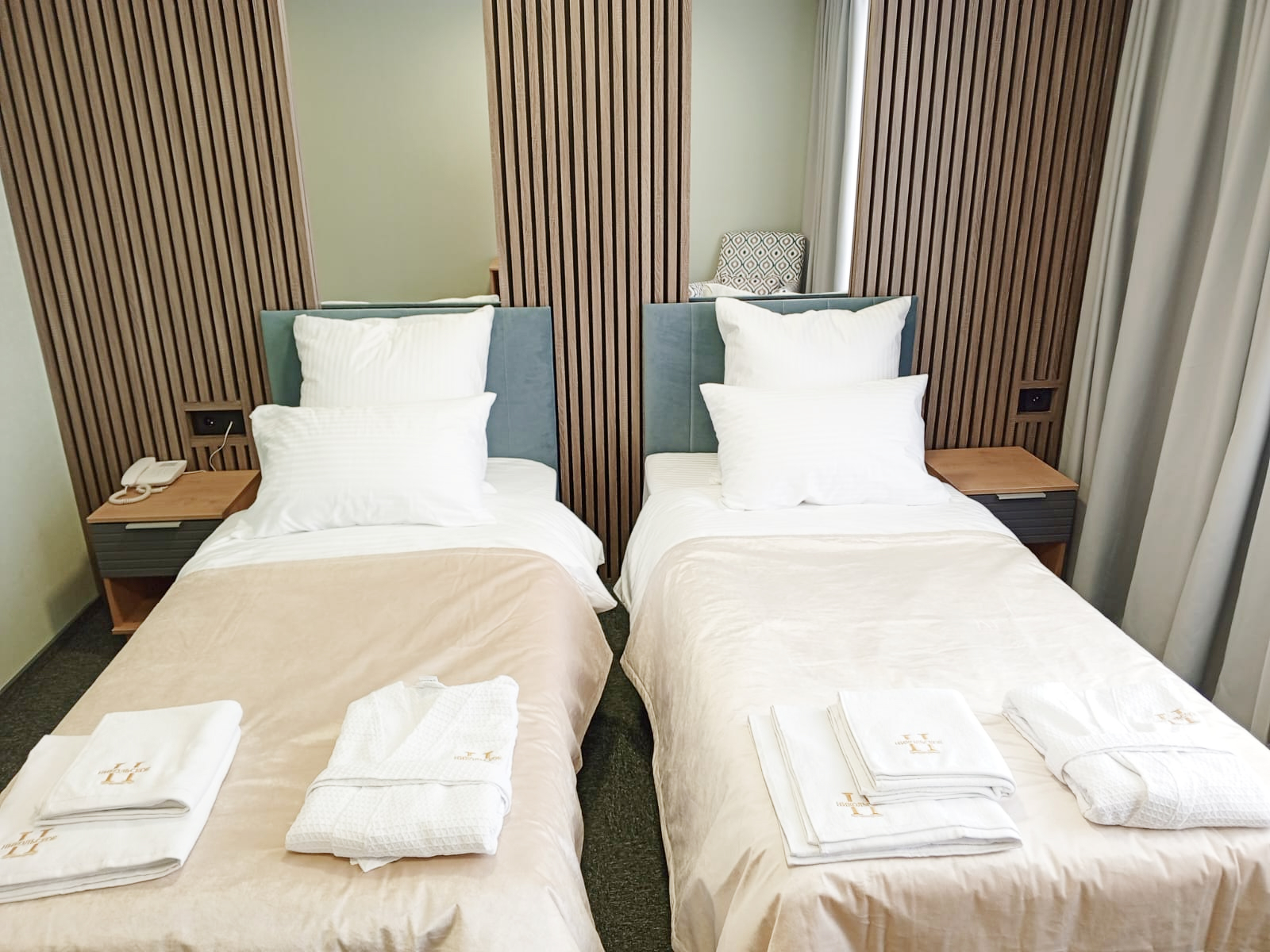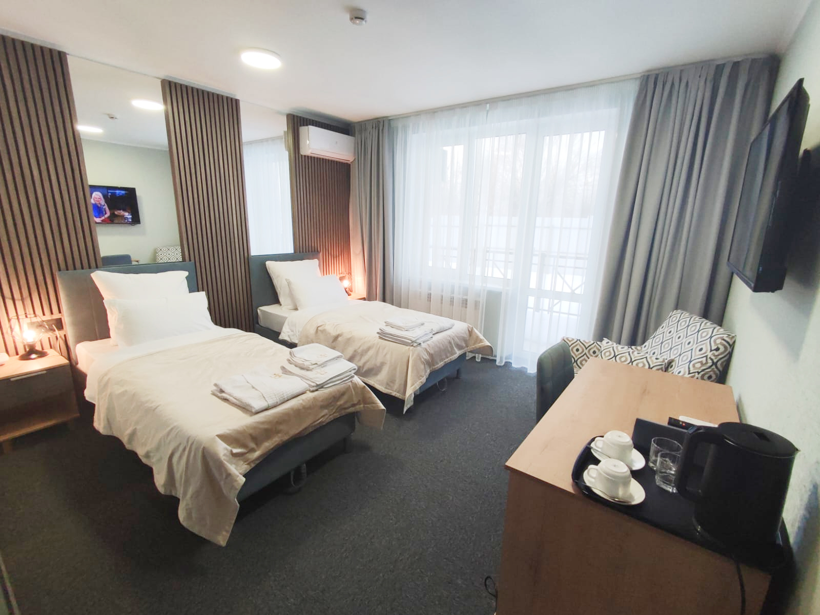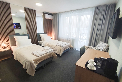 В номере: зеркало, кресло, кровати односпальные, прикроватные тумбочки, стол, стул, шкаф, кондиционер, мини-холодильник, телевизор ЖК, телефон, чайный набор посуды, электрочайник