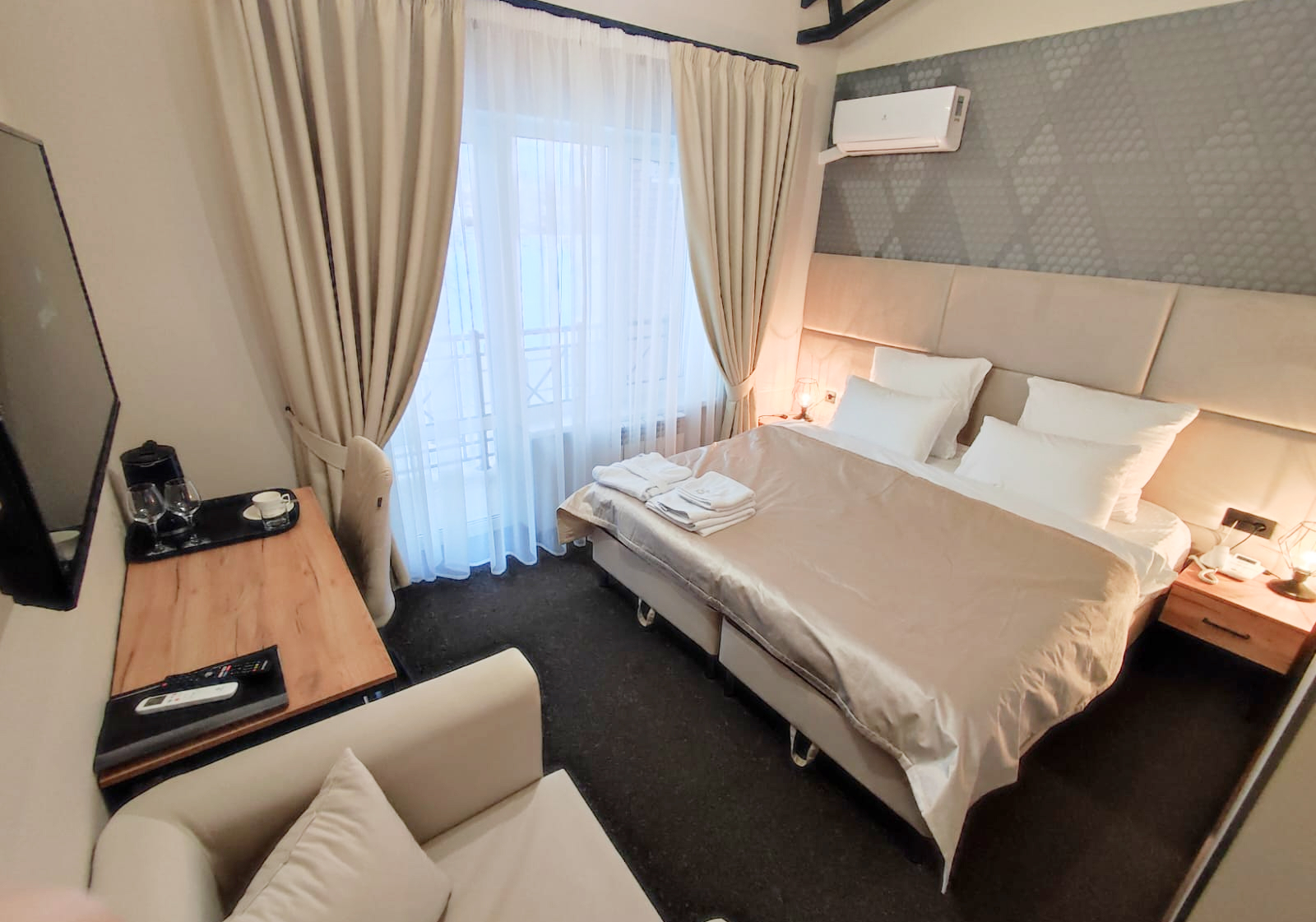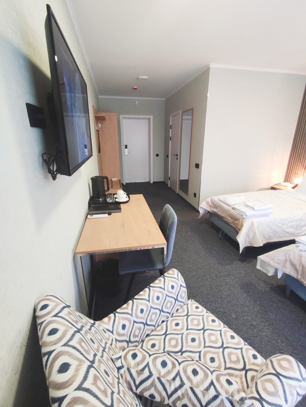 В номере: зеркало, кресло, кровати односпальные /одна двуспальная кровать, прикроватные тумбочки, стол, стул, шкаф, кондиционер, телевизор ЖК, телефон, чайный набор посуды, электрочайник