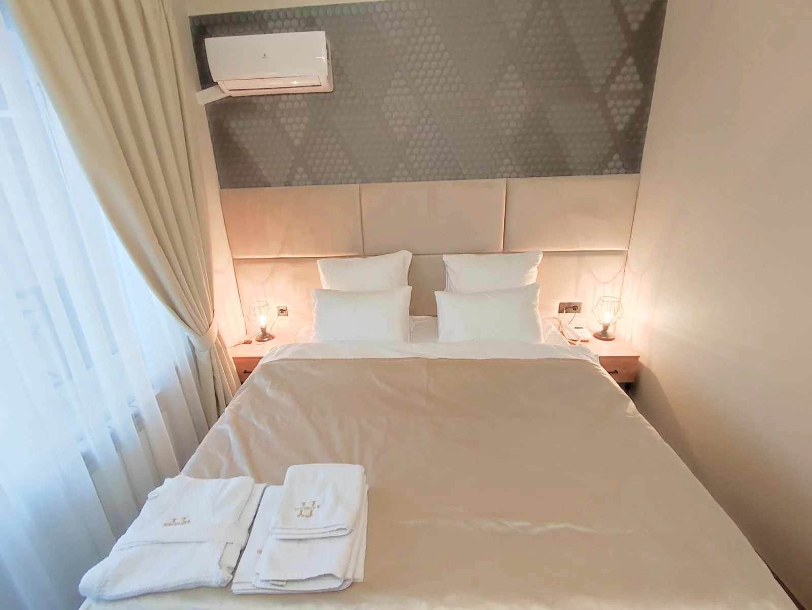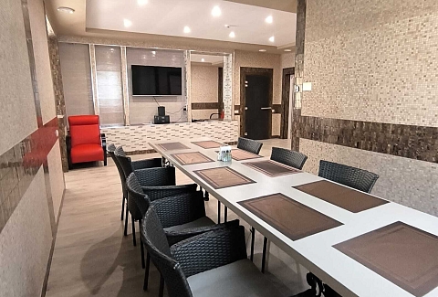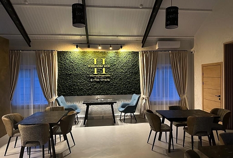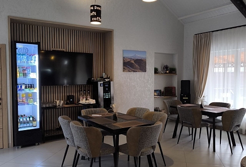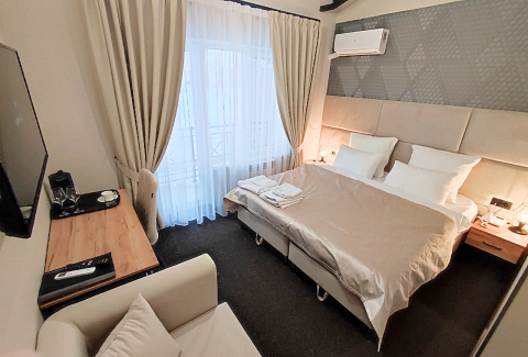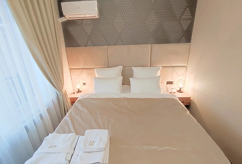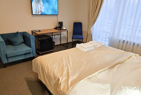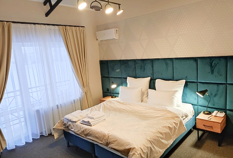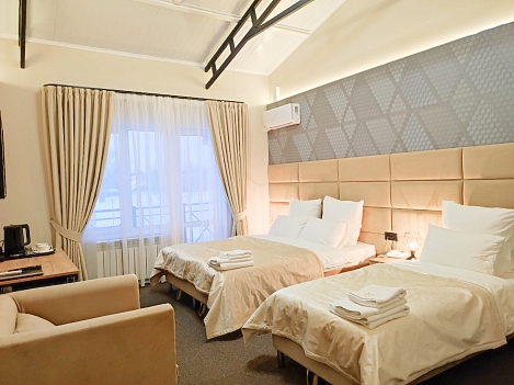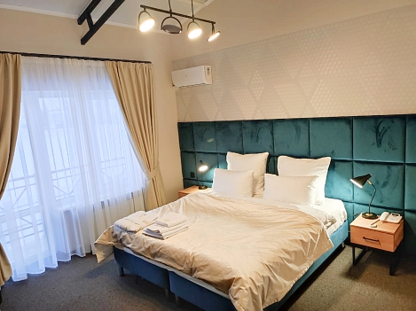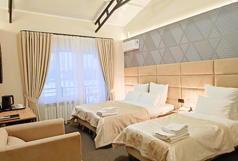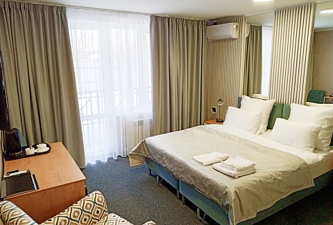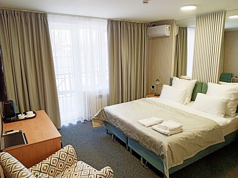 В распоряжении гостей однокомнатные и двухкомнатные номера разных категорий. В комнатах светлые интерьеры, удобная мебель, в том числе есть рабочий стол в случае, если необходимо совместить отдых с рабочими вопросами. Везде предусмотрена персональный санузел с душем, есть кондиционер, телевизор-ЖК, фен, электрочайник. При предварительном запросе возможно празднично оформить номера для молодоженов или именинника.На территории отеля работает лобби-бар и организована мангальная зона. К услугам отдыхающих банный комплекс с русской баней на дровах, хаммамом, джакузи и сауной. Среди стандартных услуг – парковка и сеть wi-fi, а гости с детьми могут арендовать кроватки-манежи для малышей.