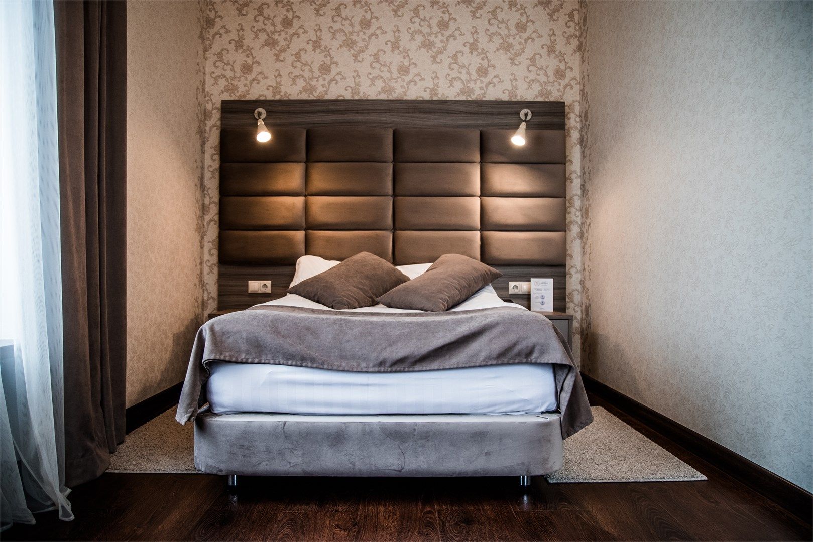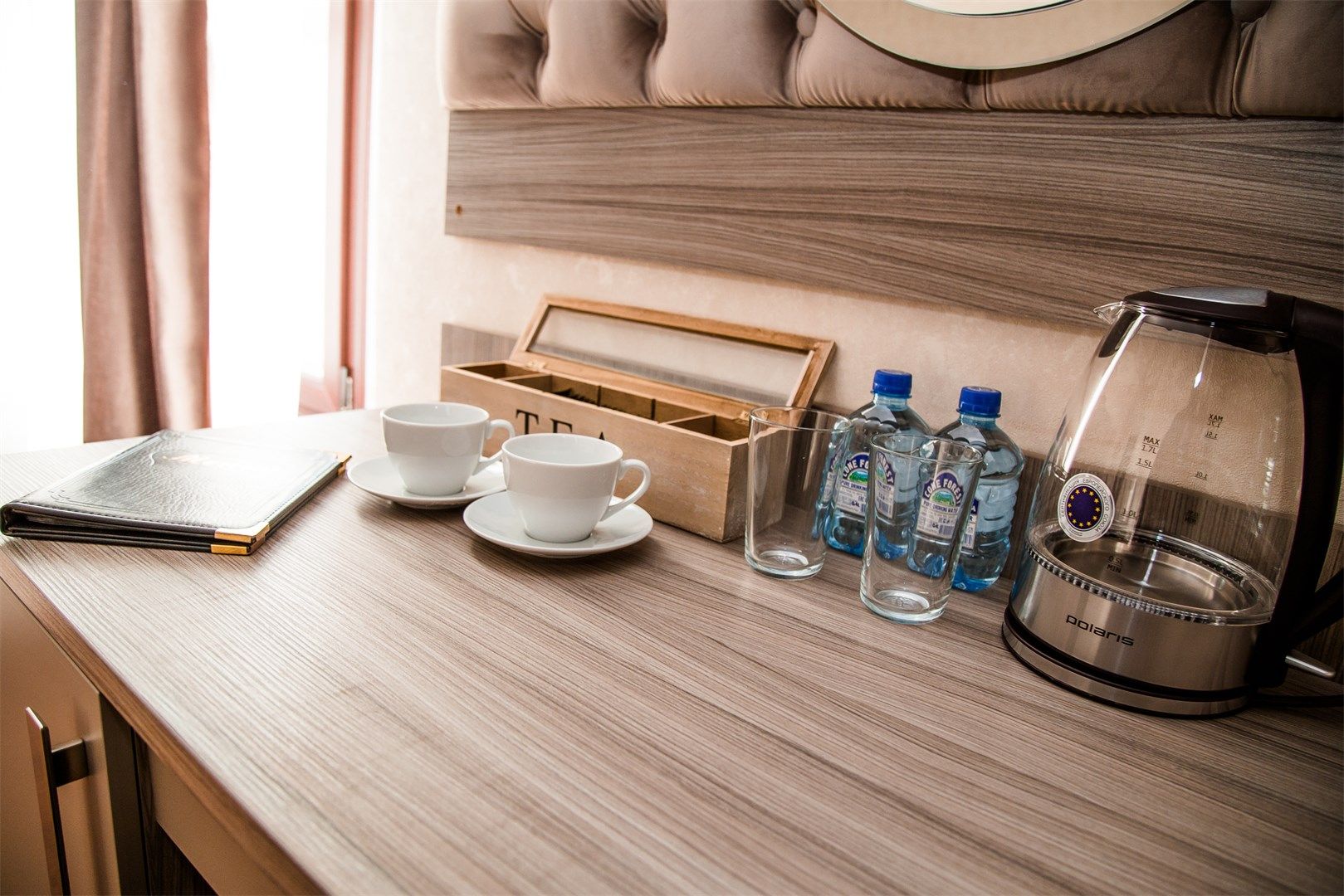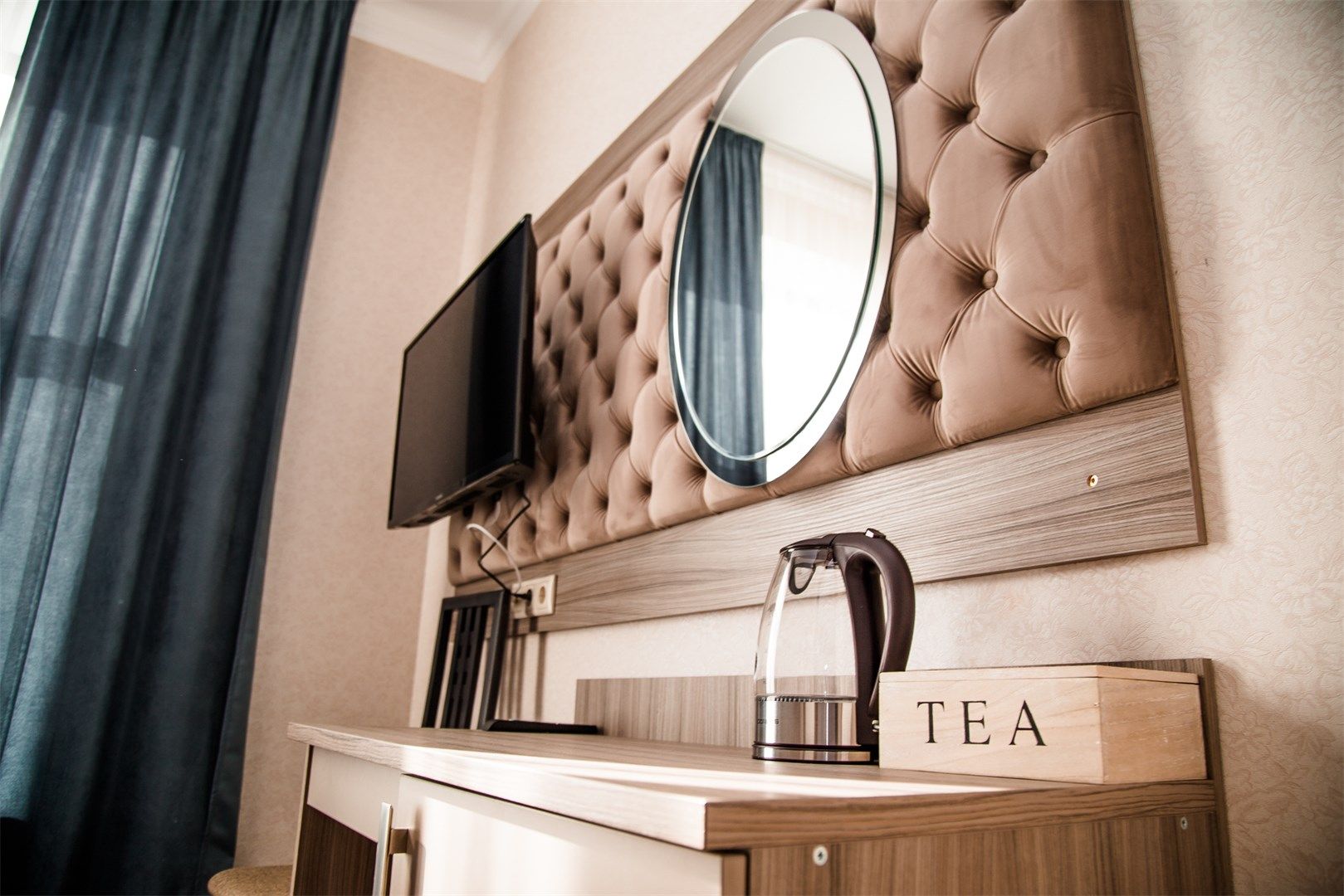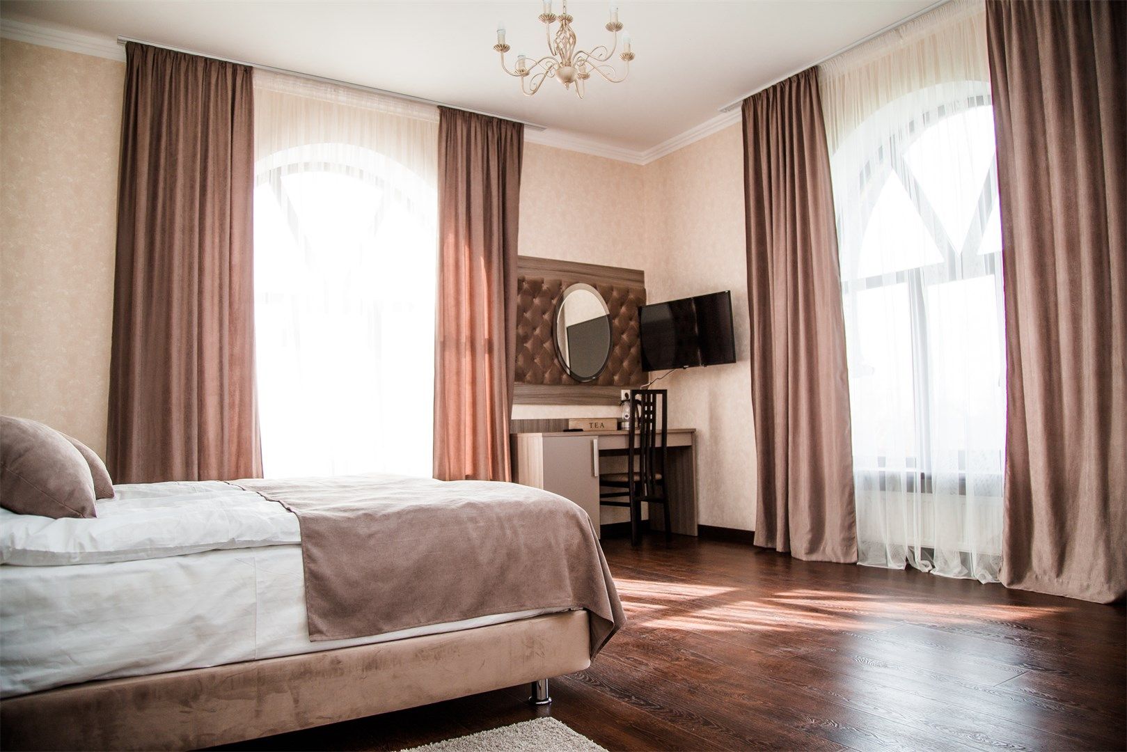 В номере: вешалка, зеркало, кровать двуспальная, прикроватные тумбочки, стол, стулья, шкаф, кондиционер, сейф, телевизор, телефон, чайный набор посуды, электрочайник