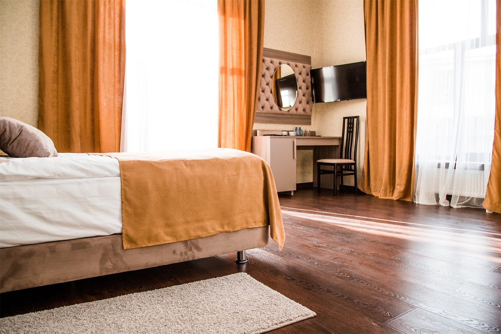 В номере: вешалка, зеркало, кровати односпальные, прикроватные тумбочки, стол, стулья, шкаф, мини-холодильник, сейф, телевизор, телефон, чайный набор посуды, электрочайник