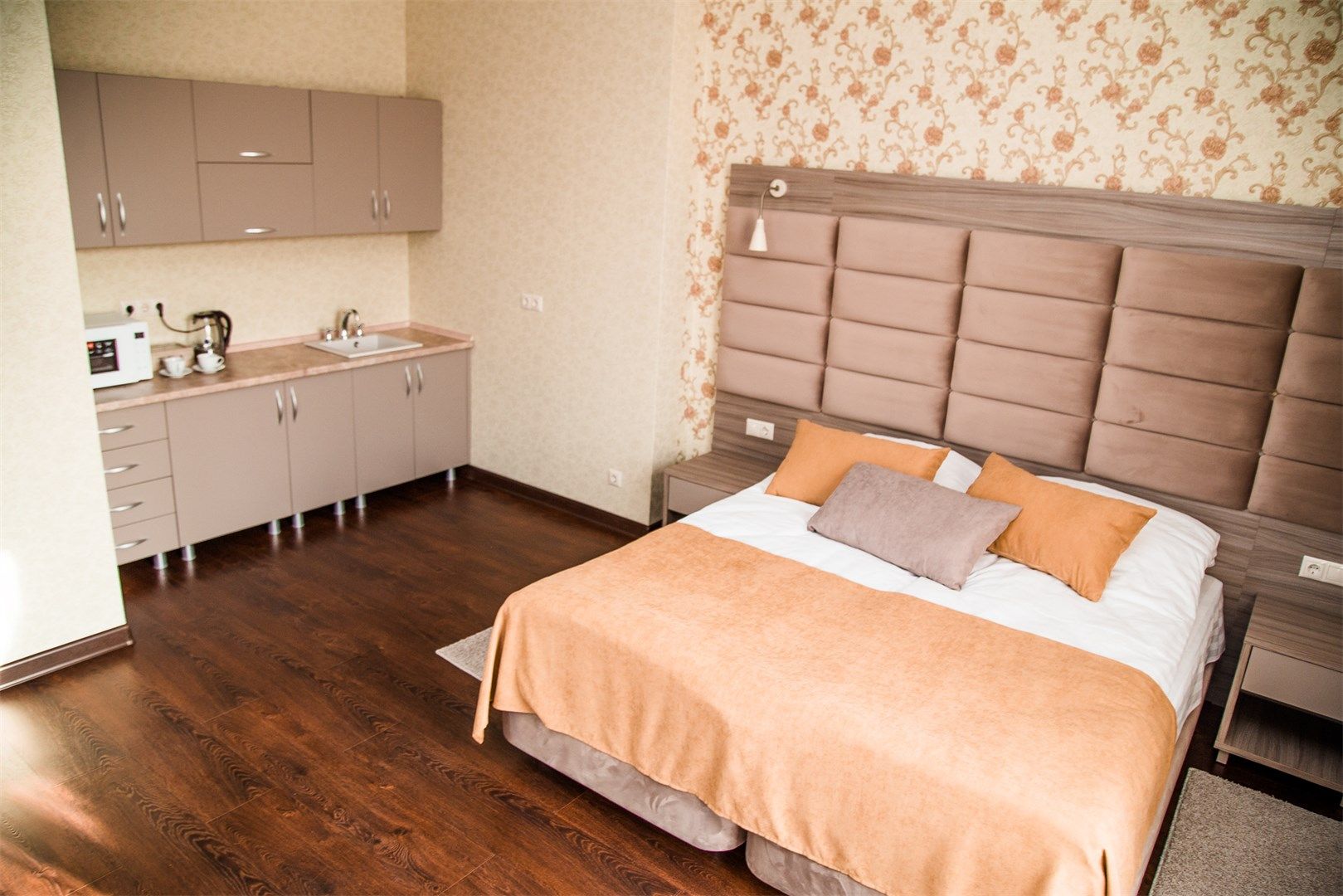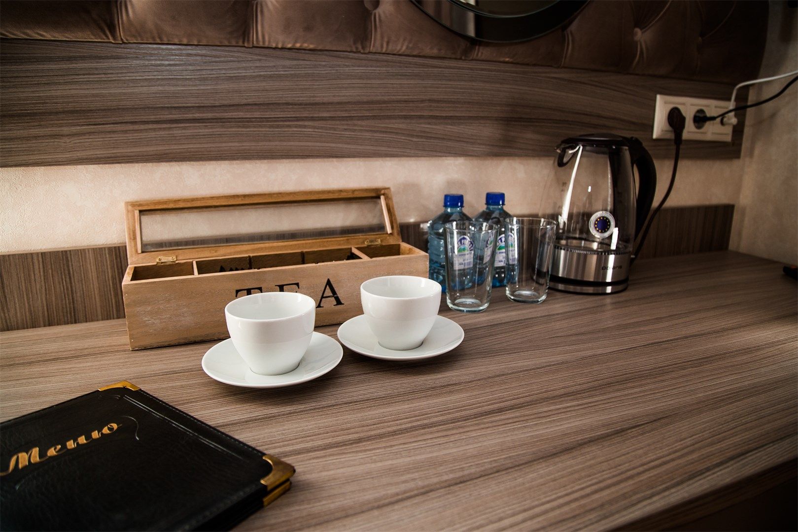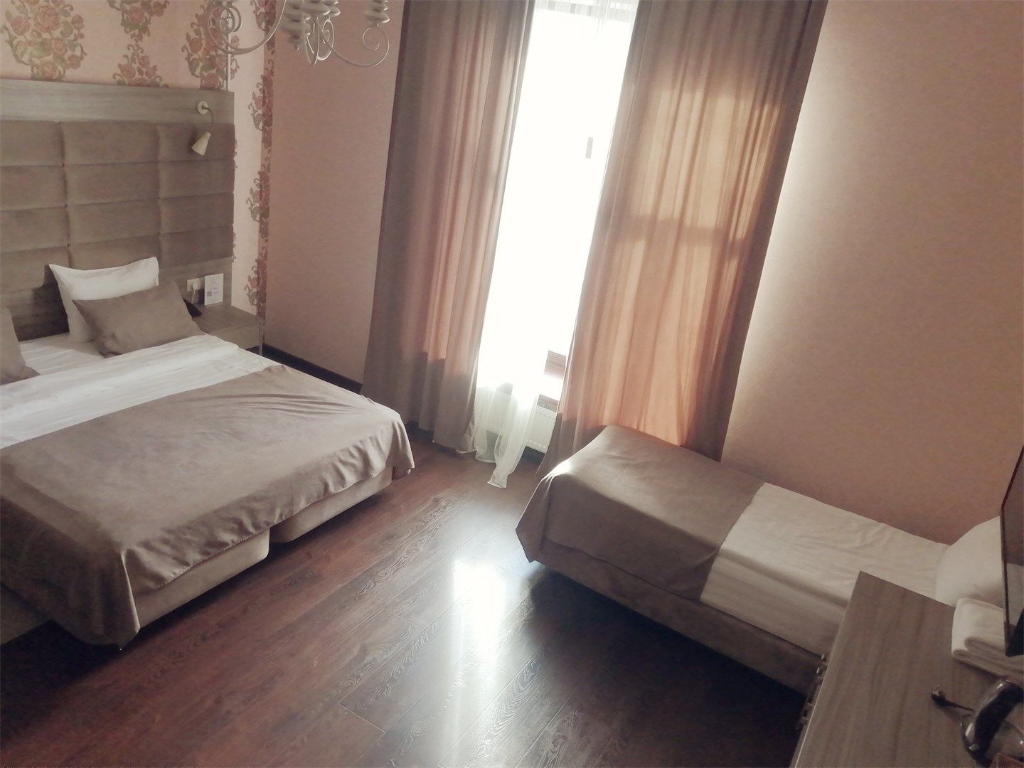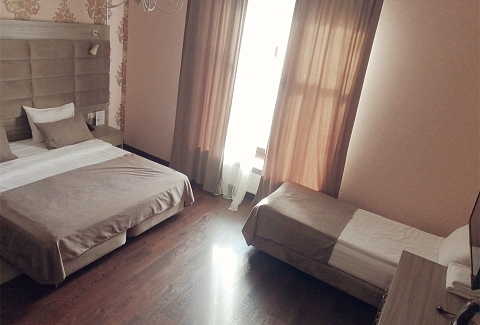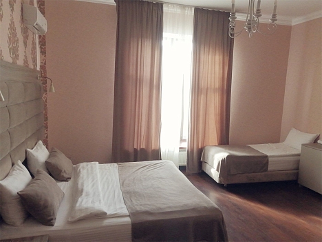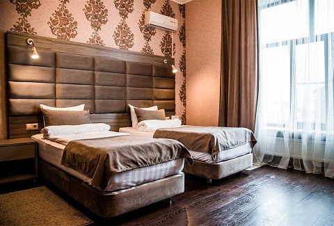 В номере: вешалка, диван, кровати односпальные, прикроватные тумбочки, стол, стулья, шкаф, кондиционер, мини-холодильник, сейф, телевизор, телефон, чайный набор посуды, электрочайник