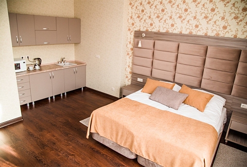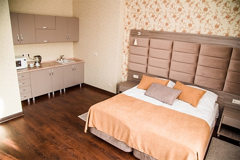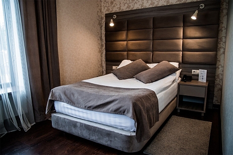 В номере: вешалка, зеркало, кровать двуспальная, прикроватные тумбочки, стол, стулья, шкаф, кондиционер, мини-холодильник, телевизор, телефон