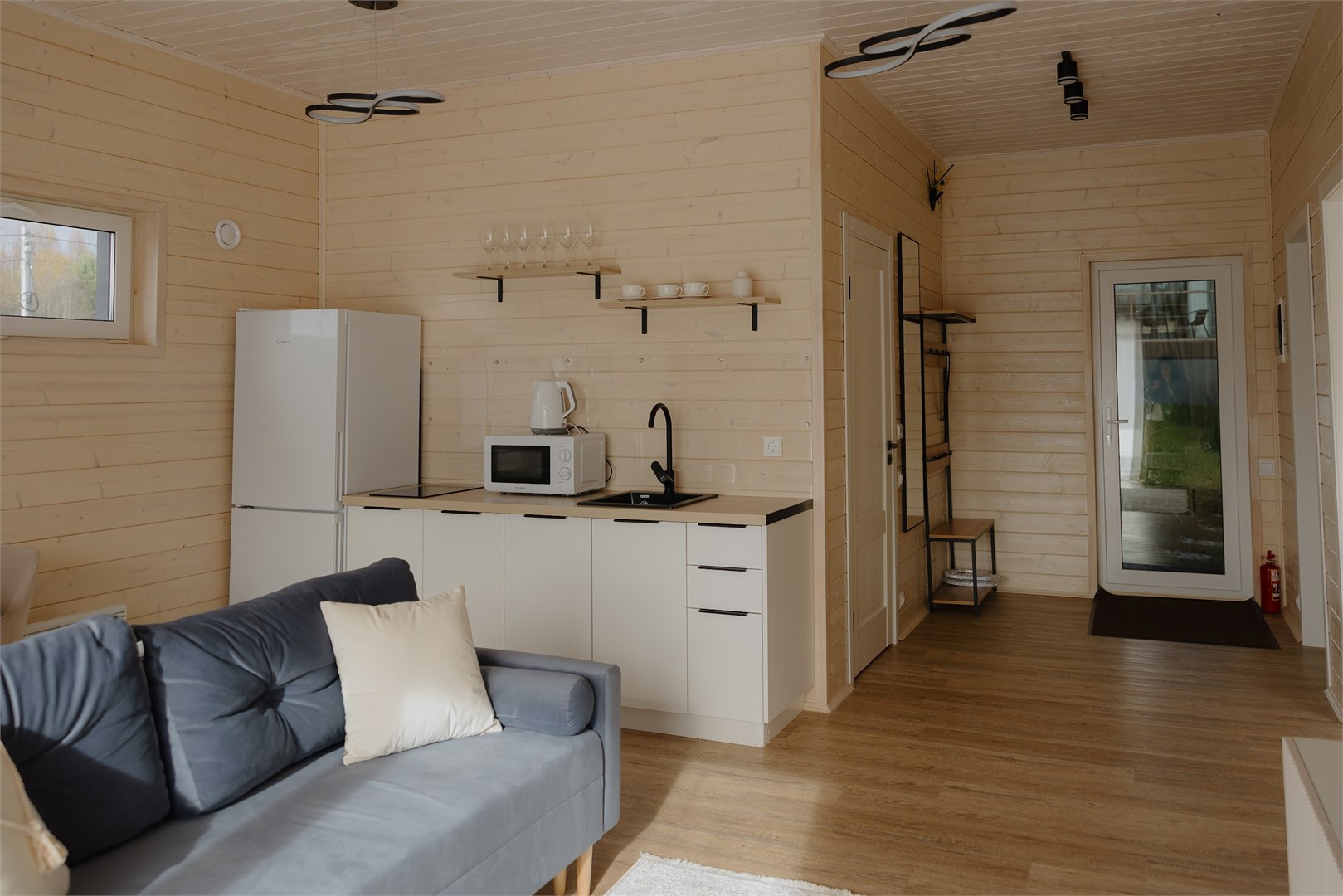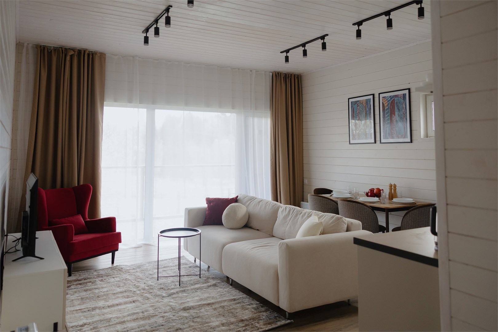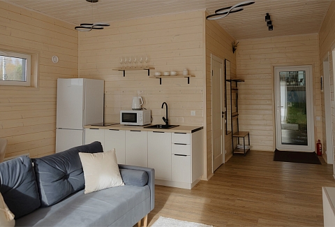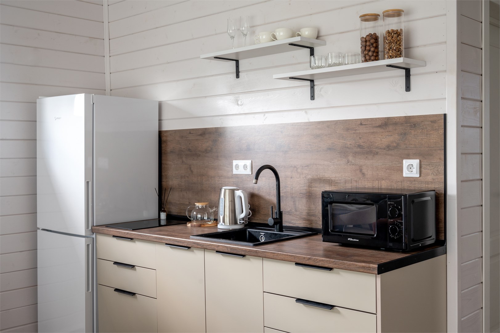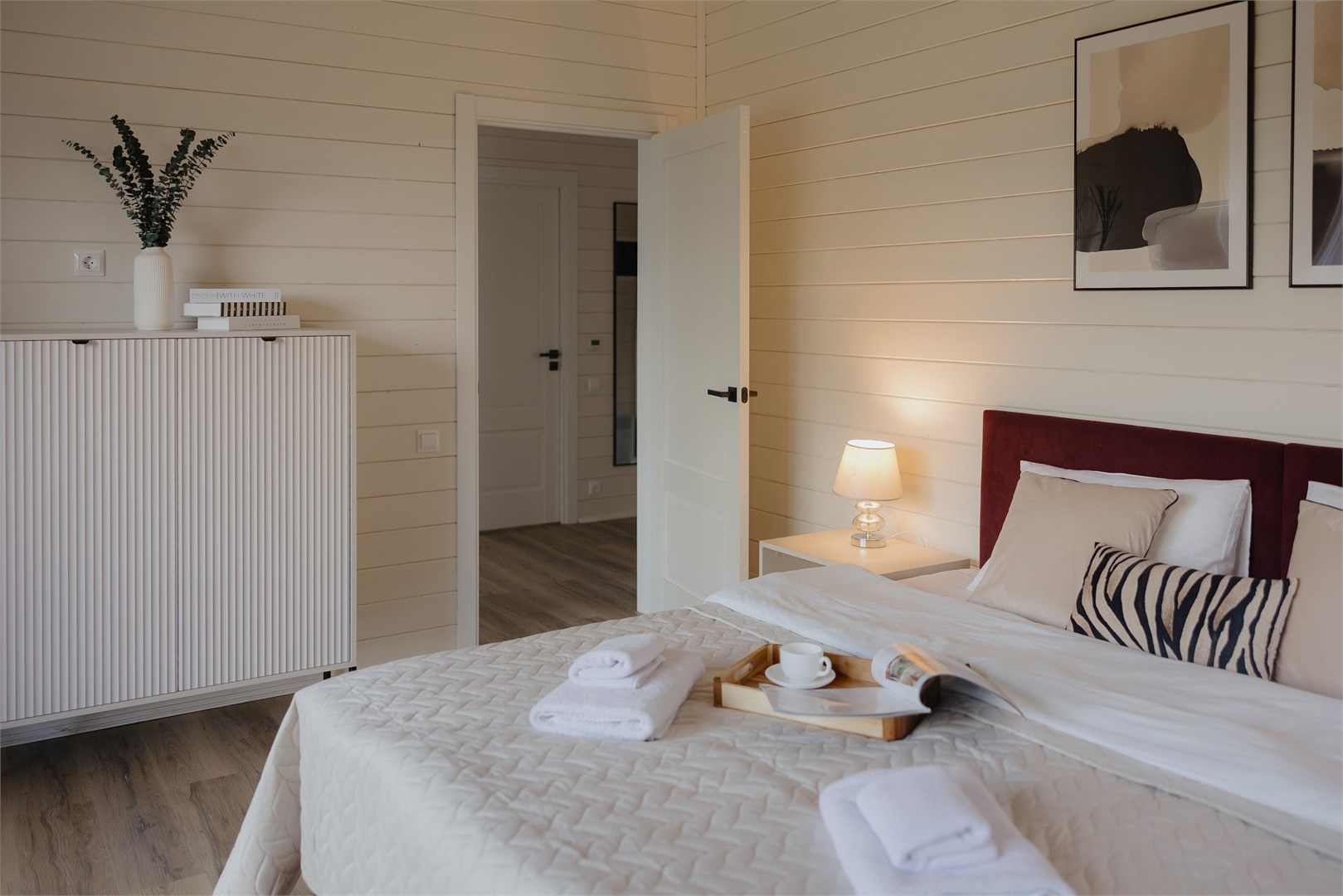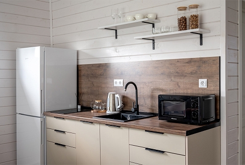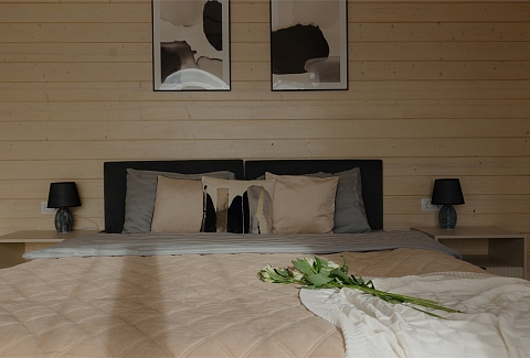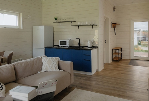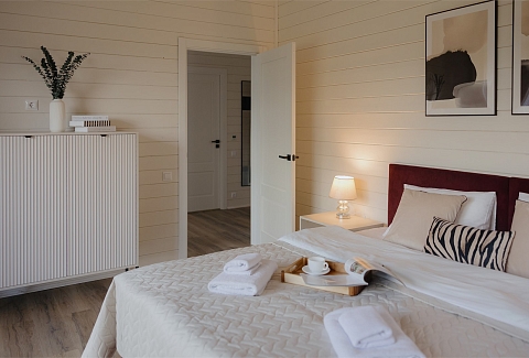 В номере: диван, зеркало, кровать двуспальная, прикроватные тумбочки, стол, стулья, шкаф, кондиционер, микроволновая печь, мини-холодильник, набор посуды, плита электрическая, телевизор ЖК, чайный набор посуды, электрочайник