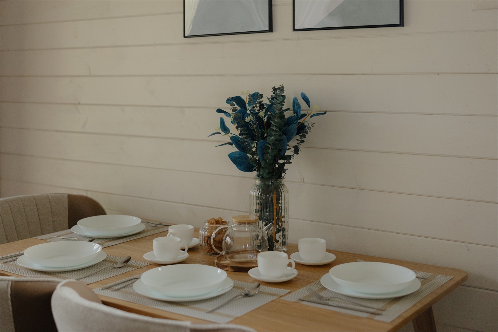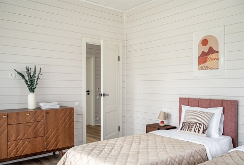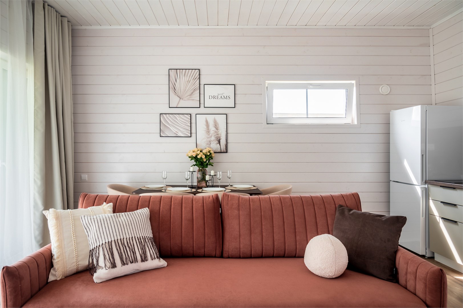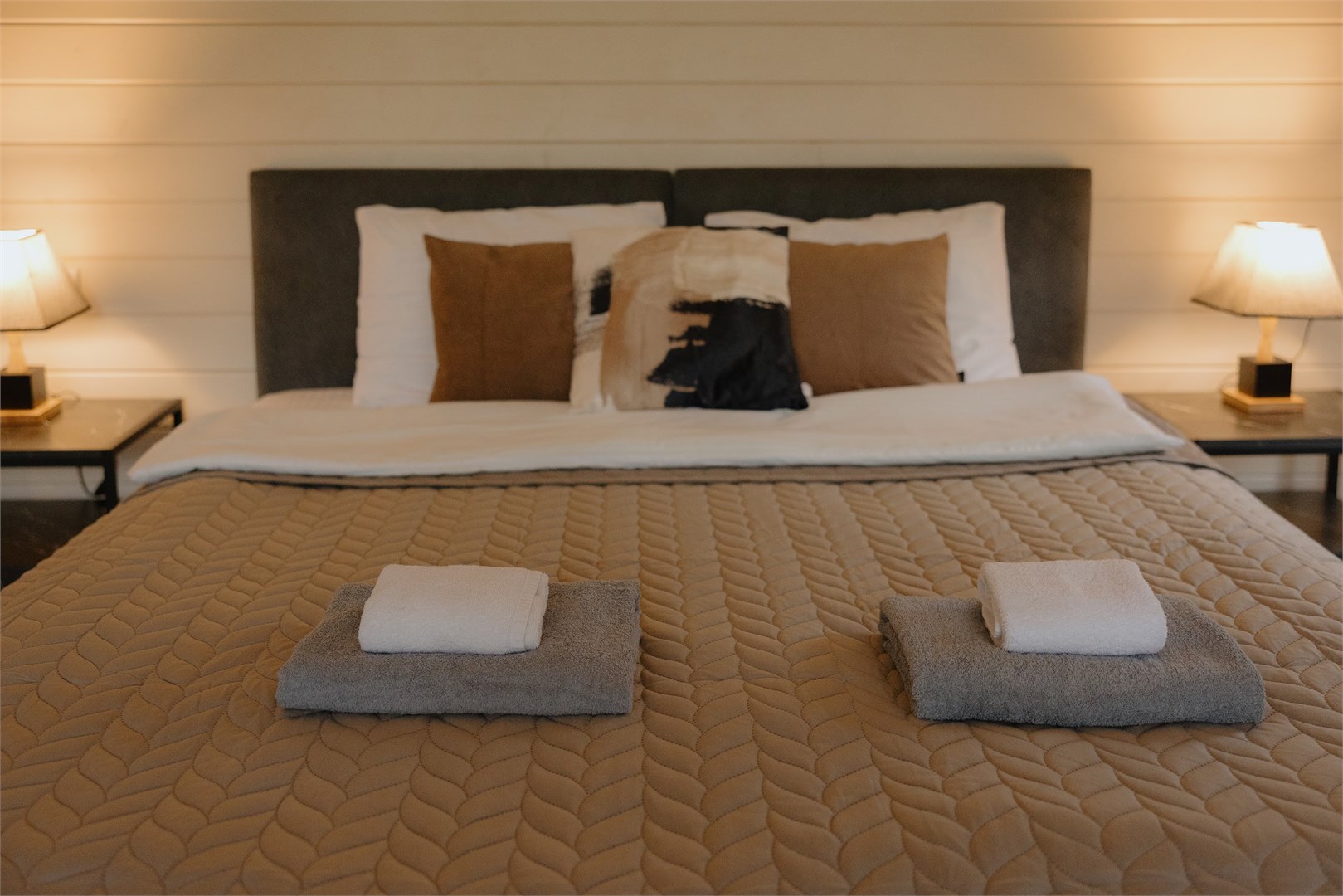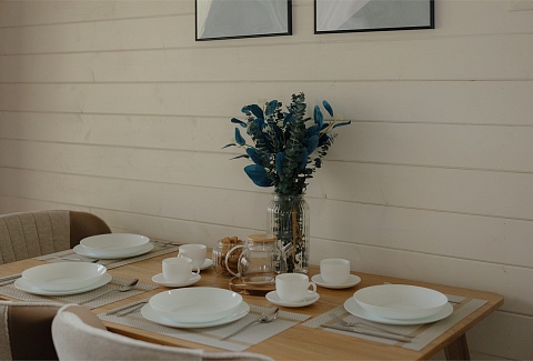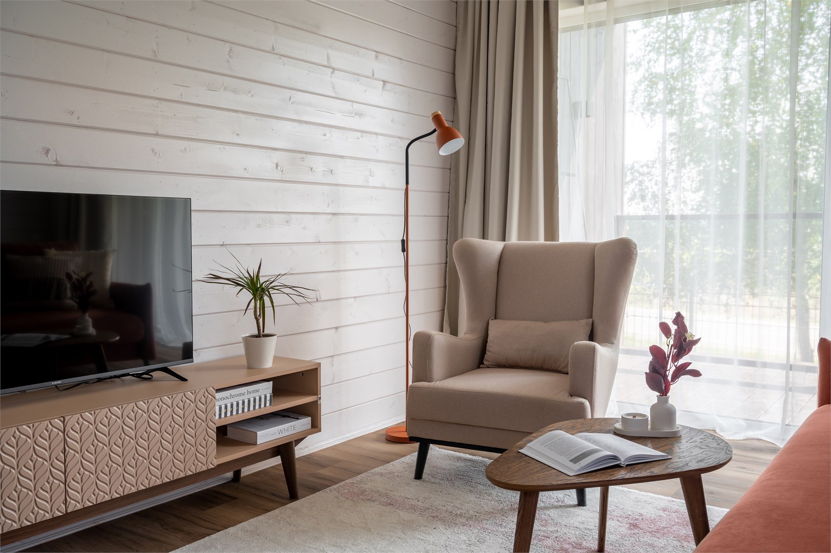 В номере: диван, зеркало, кровать двуспальная, прикроватные тумбочки, стол, стулья, шкаф, кондиционер, микроволновая печь, мини-холодильник, набор посуды, плита электрическая, телевизор ЖК, чайный набор посуды, электрочайник