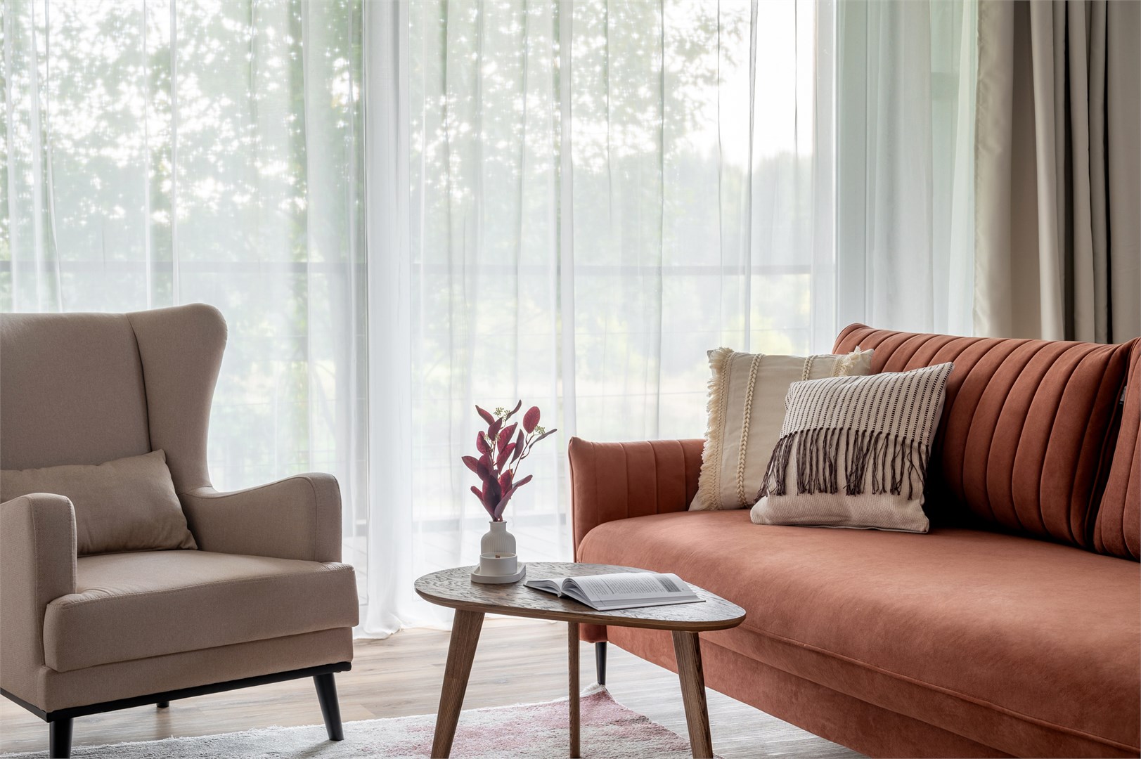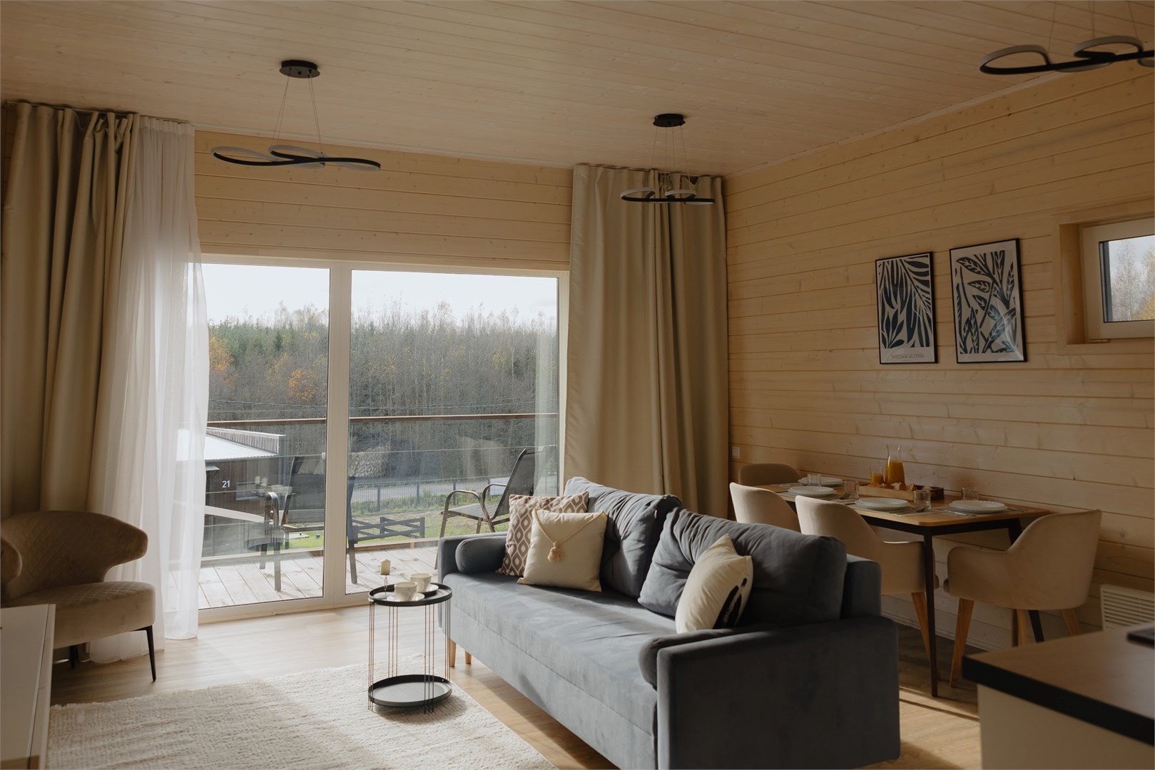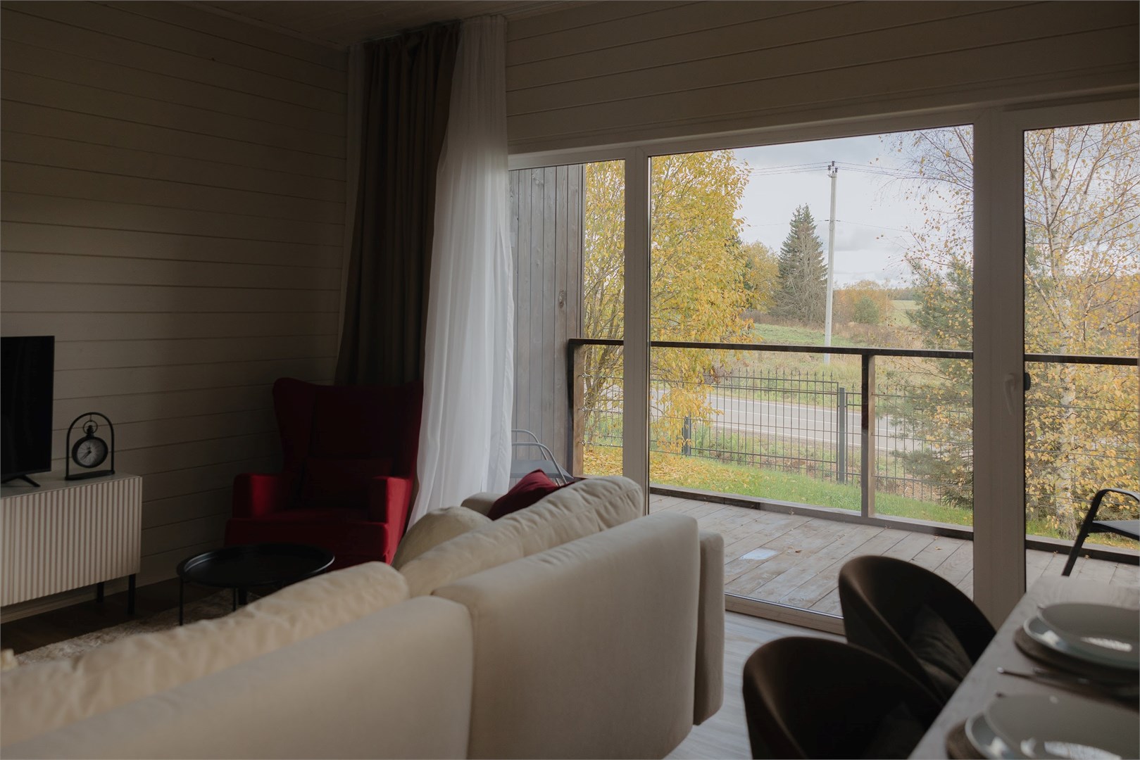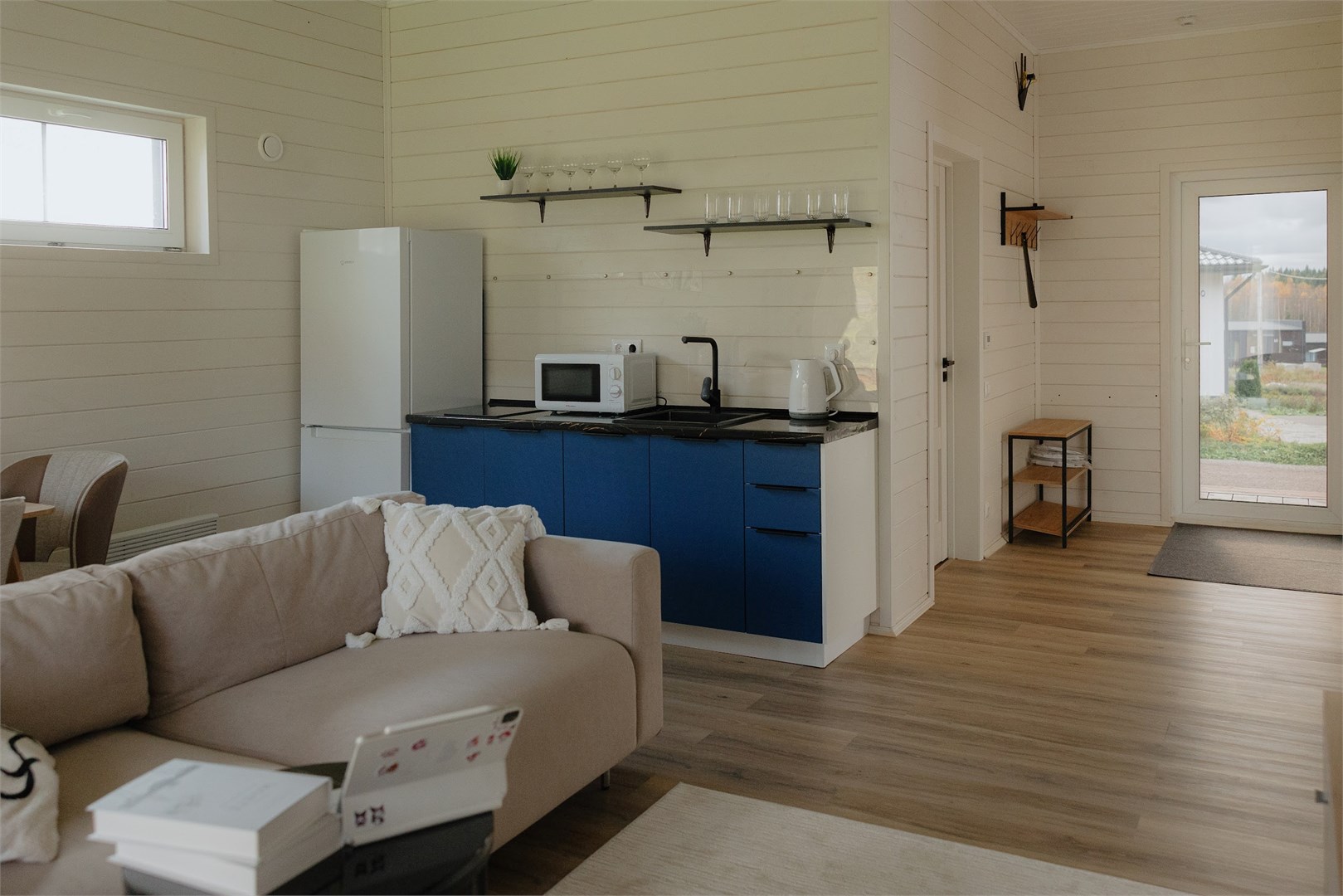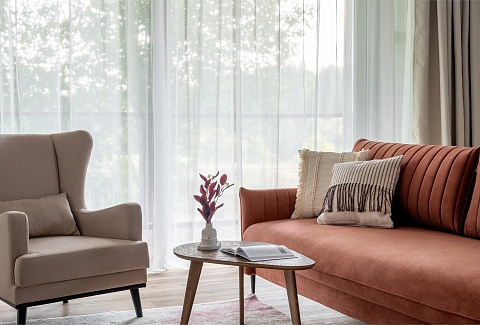 В номере: диван, зеркало, кровать двуспальная, прикроватные тумбочки, стол, стулья, шкаф, кондиционер, микроволновая печь, мини-холодильник, набор посуды, плита электрическая, телевизор ЖК, чайный набор посуды, электрочайник