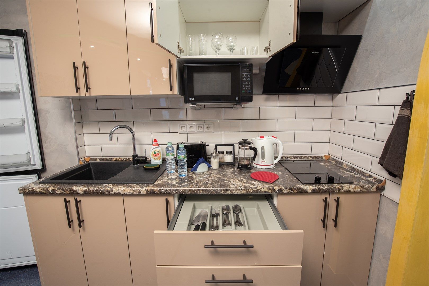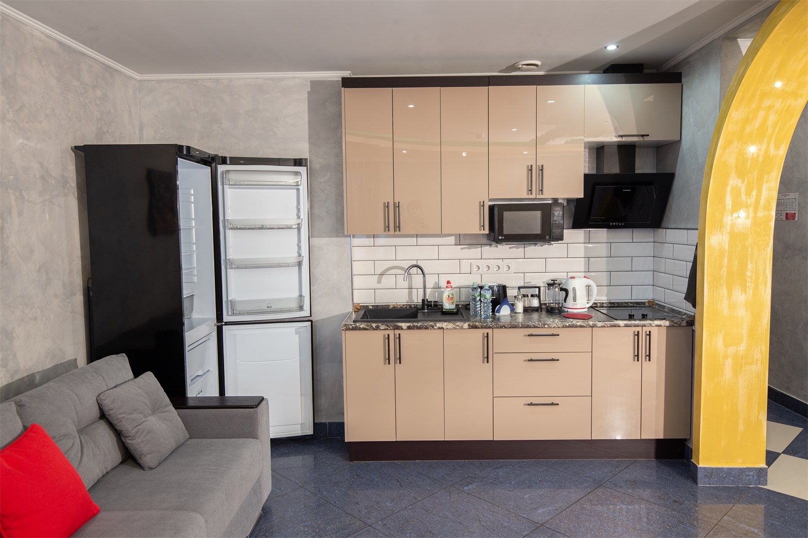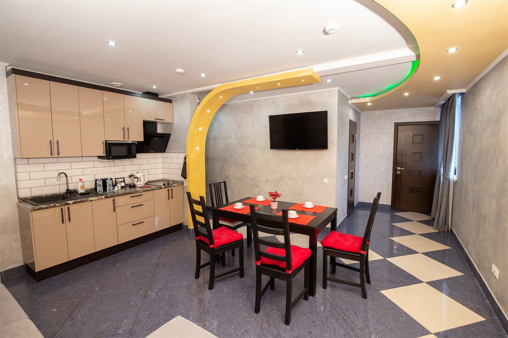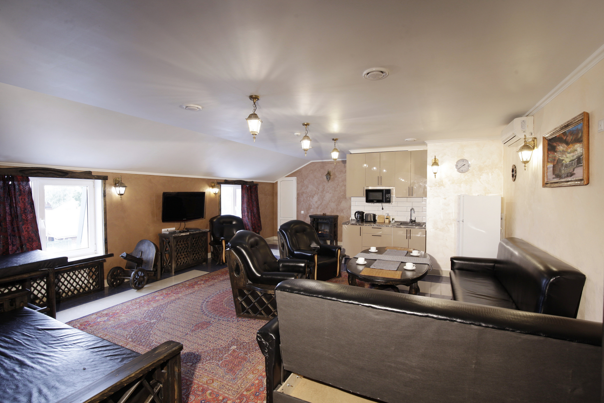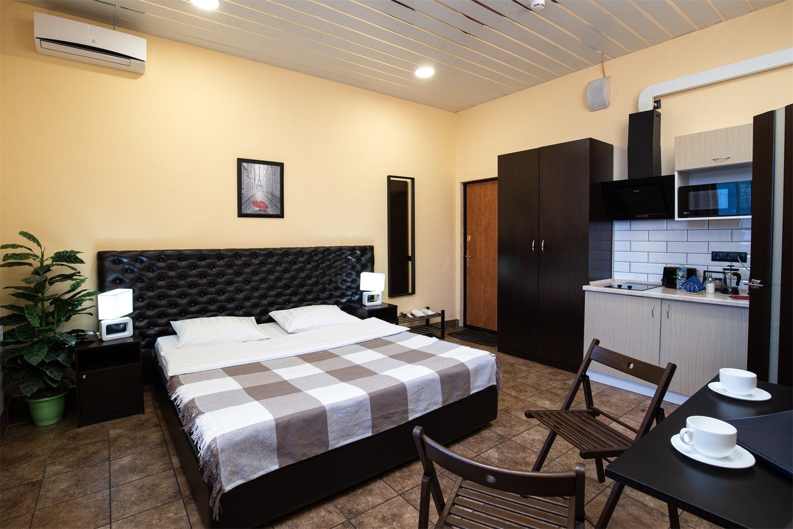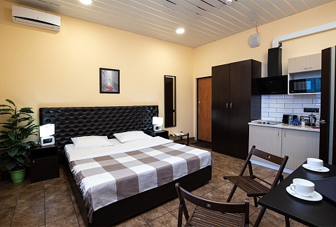 В номере: вешалка, зеркало, кровать двуспальная, прикроватные тумбочки, стол, стулья, шкаф, кондиционер, микроволновая печь, плита электрическая, телевизор, чайный набор посуды, электрочайник