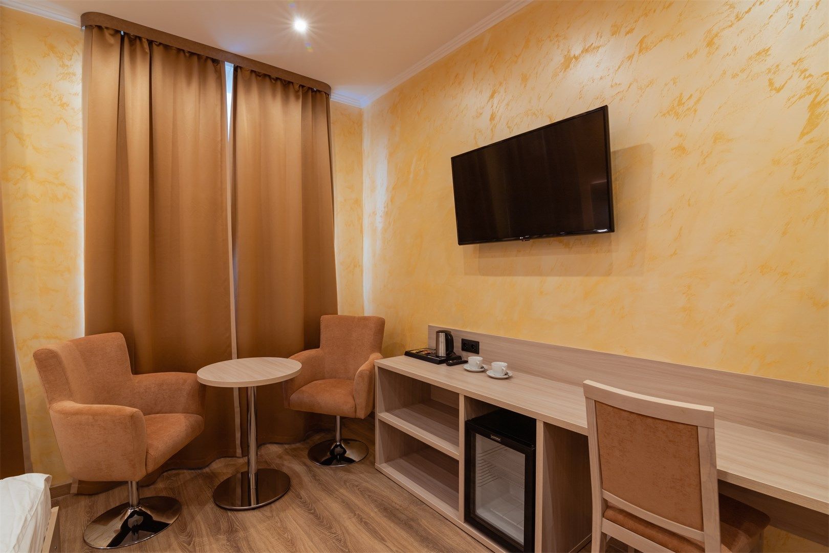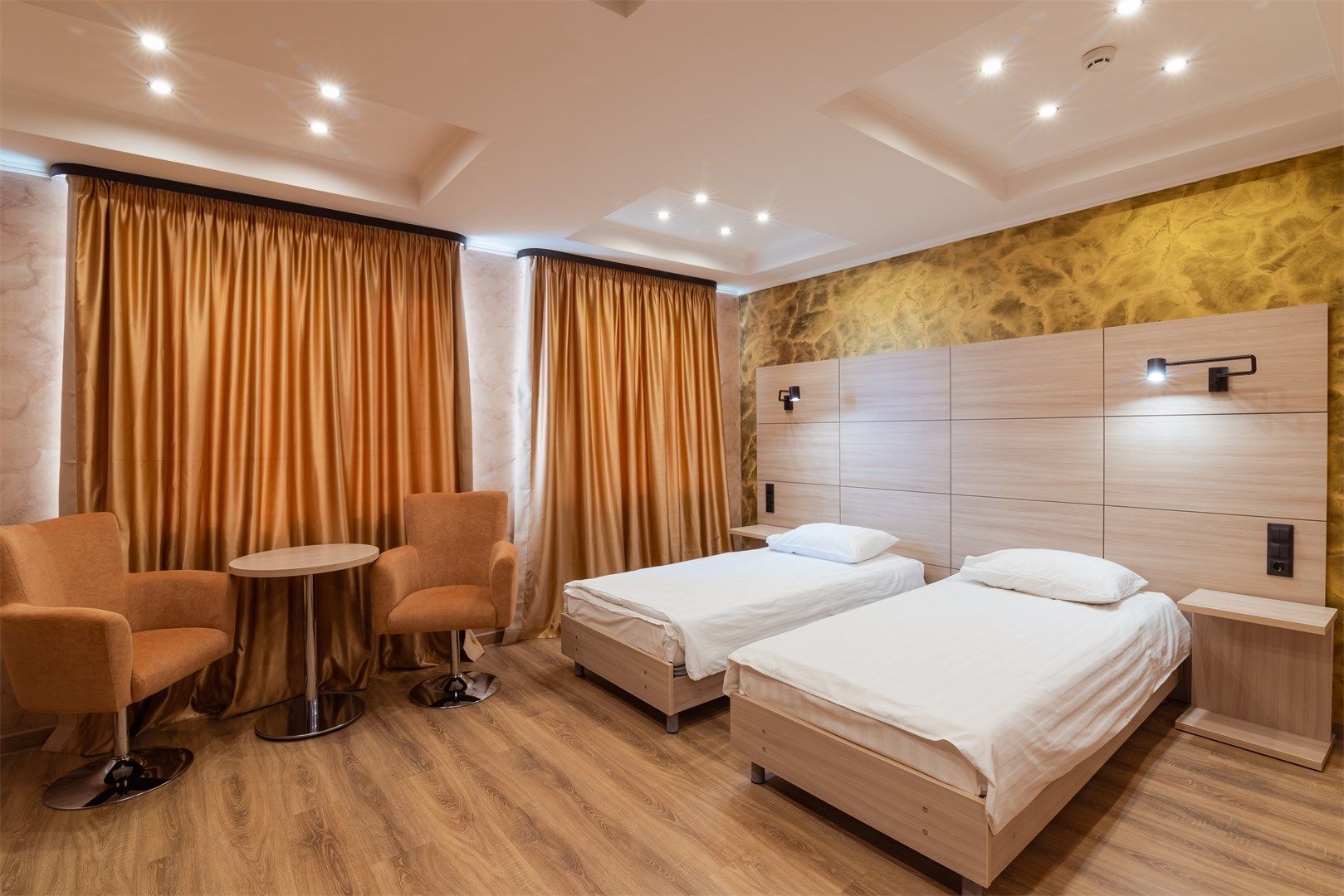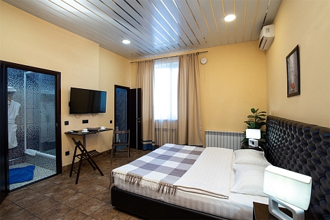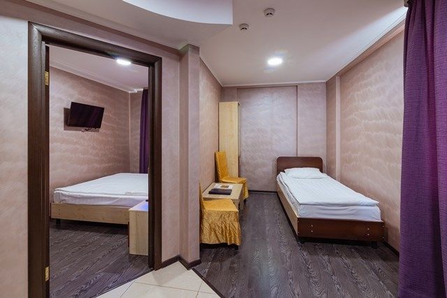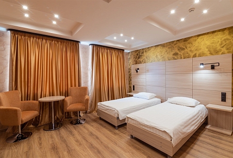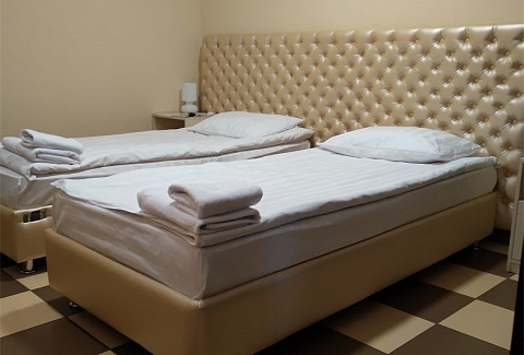 В номере: вешалка, зеркало, кровати односпальные /одна двуспальная кровать, прикроватные тумбочки, стол, стулья, шкаф, кондиционер, телевизор, холодильник, чайный набор посуды, электрочайник