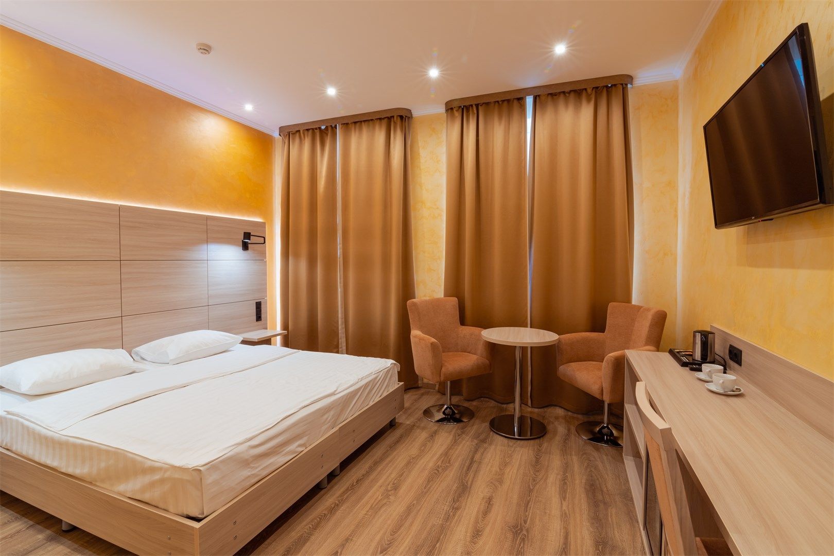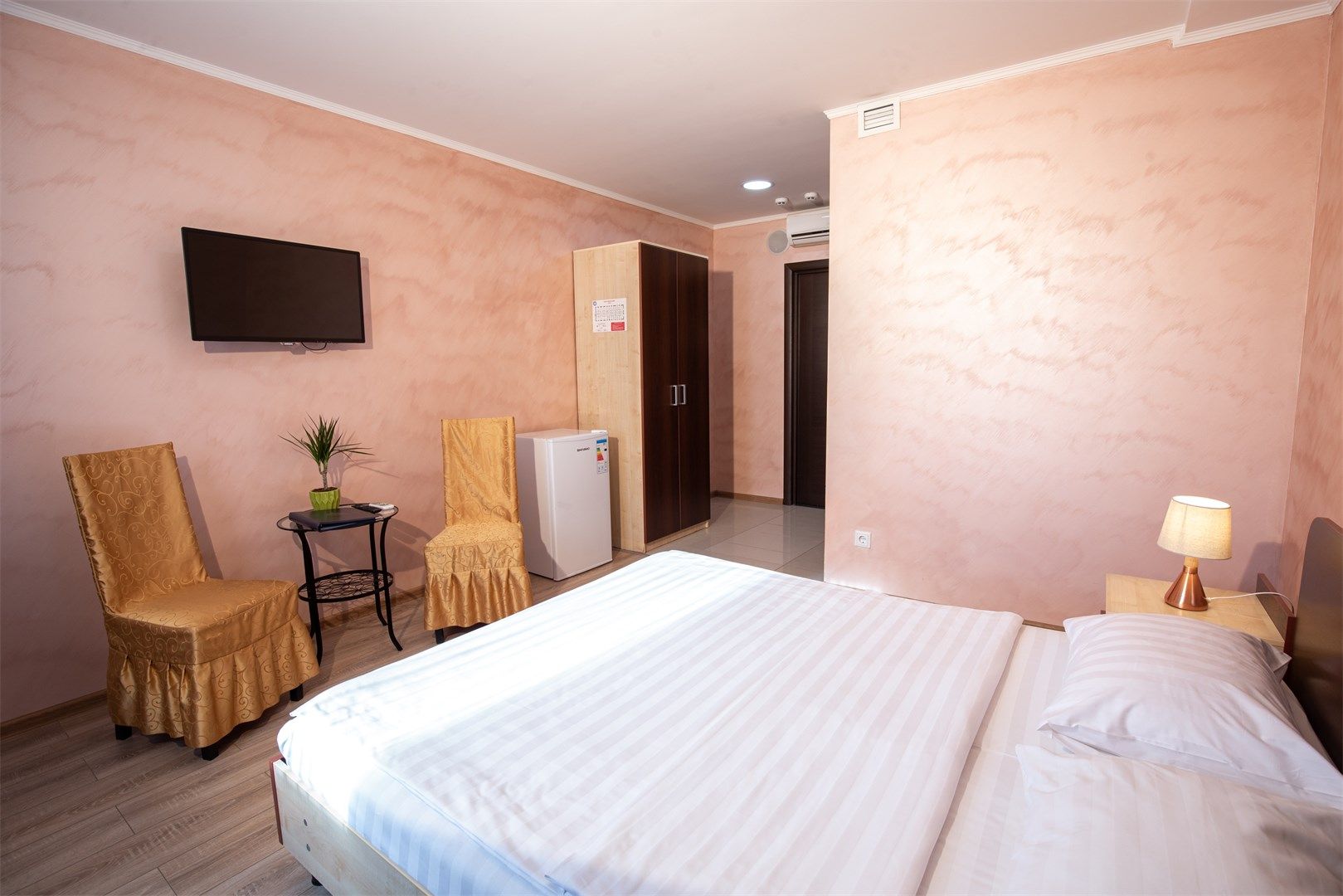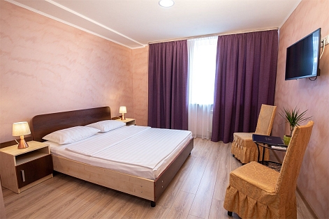 В номере: вешалка, кровать двуспальная, прикроватные тумбочки, стол, стулья, шкаф, кондиционер, телевизор