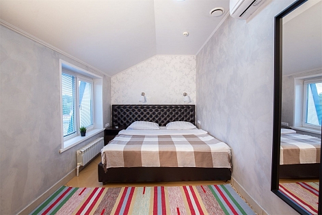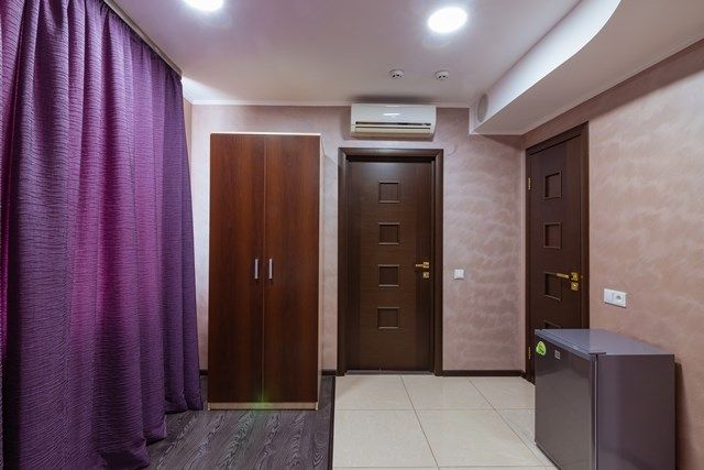 В номере: вешалка, зеркало, кровать двуспальная, кровать односпальная, прикроватные тумбочки, стол, стулья, шкаф, кондиционер, телевизор, холодильник
