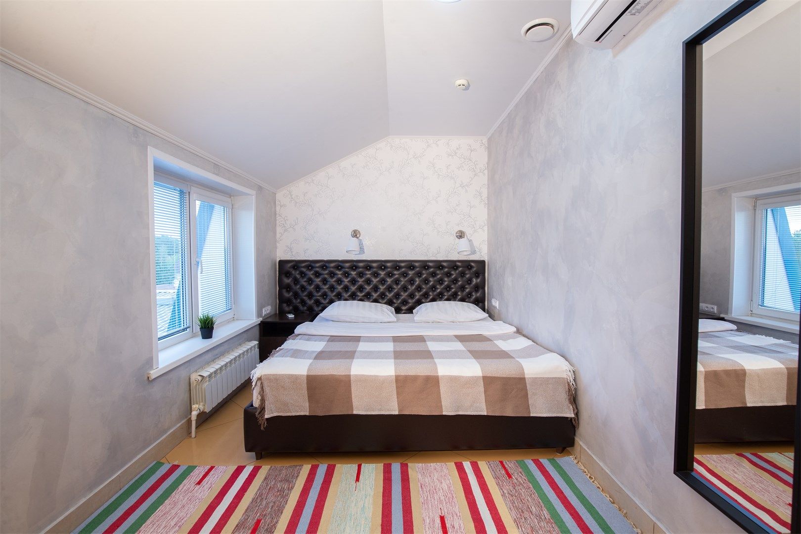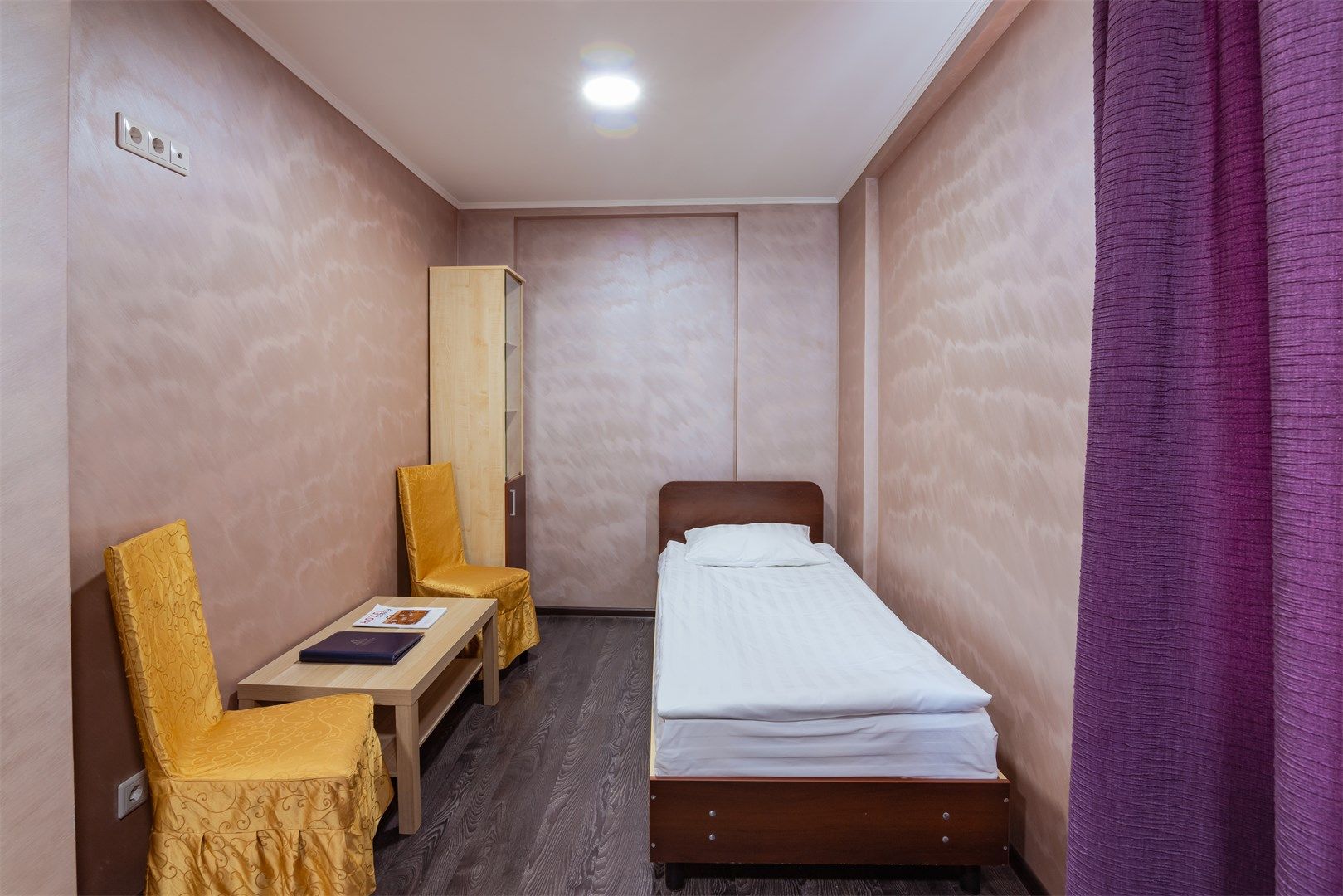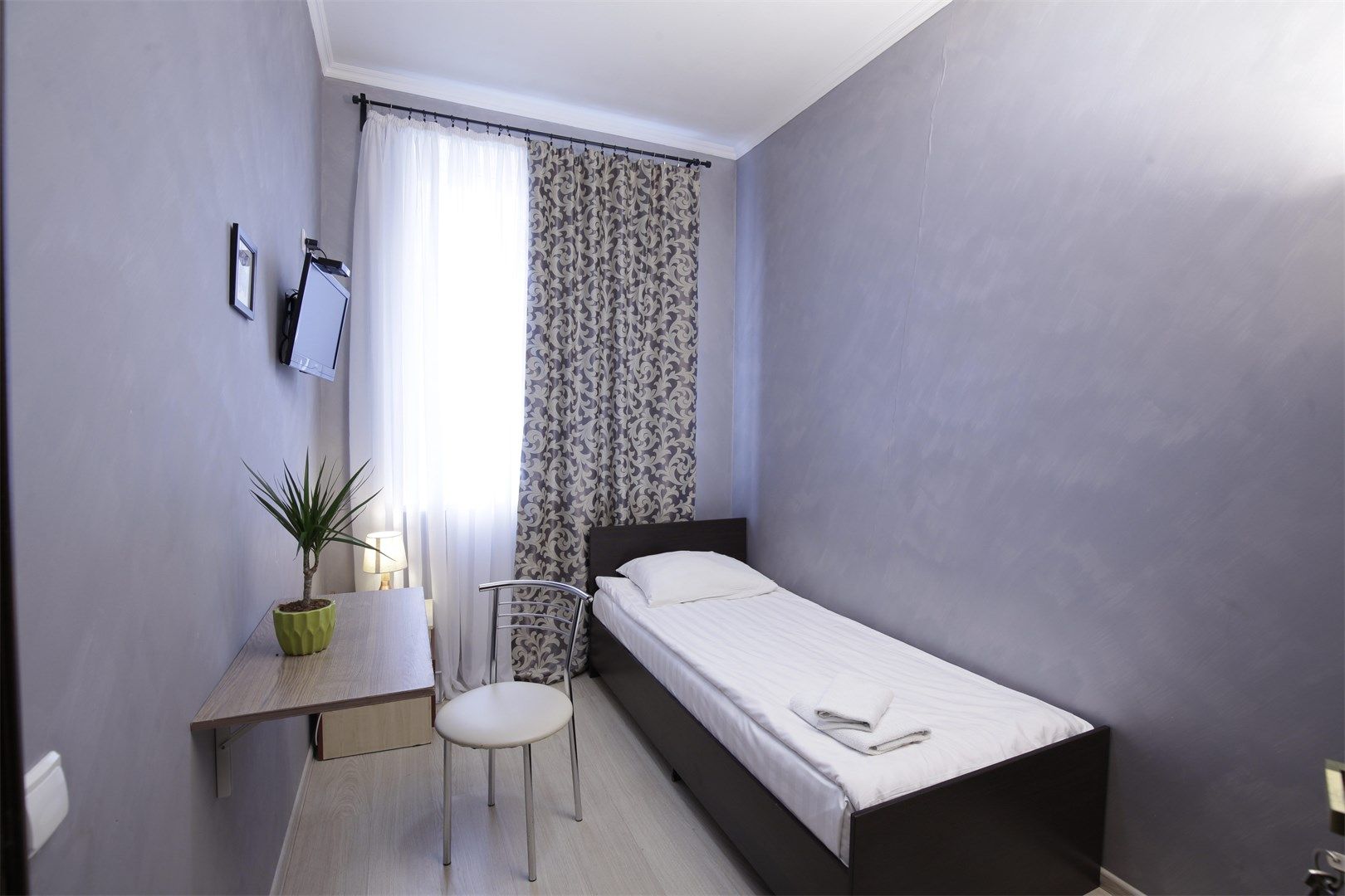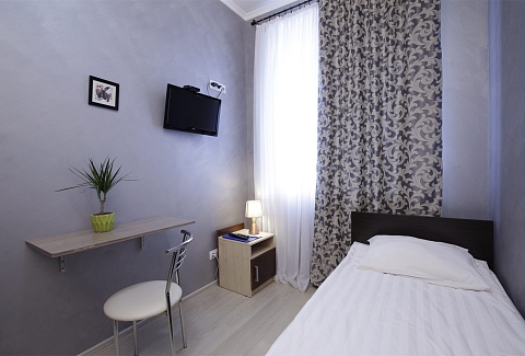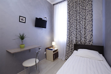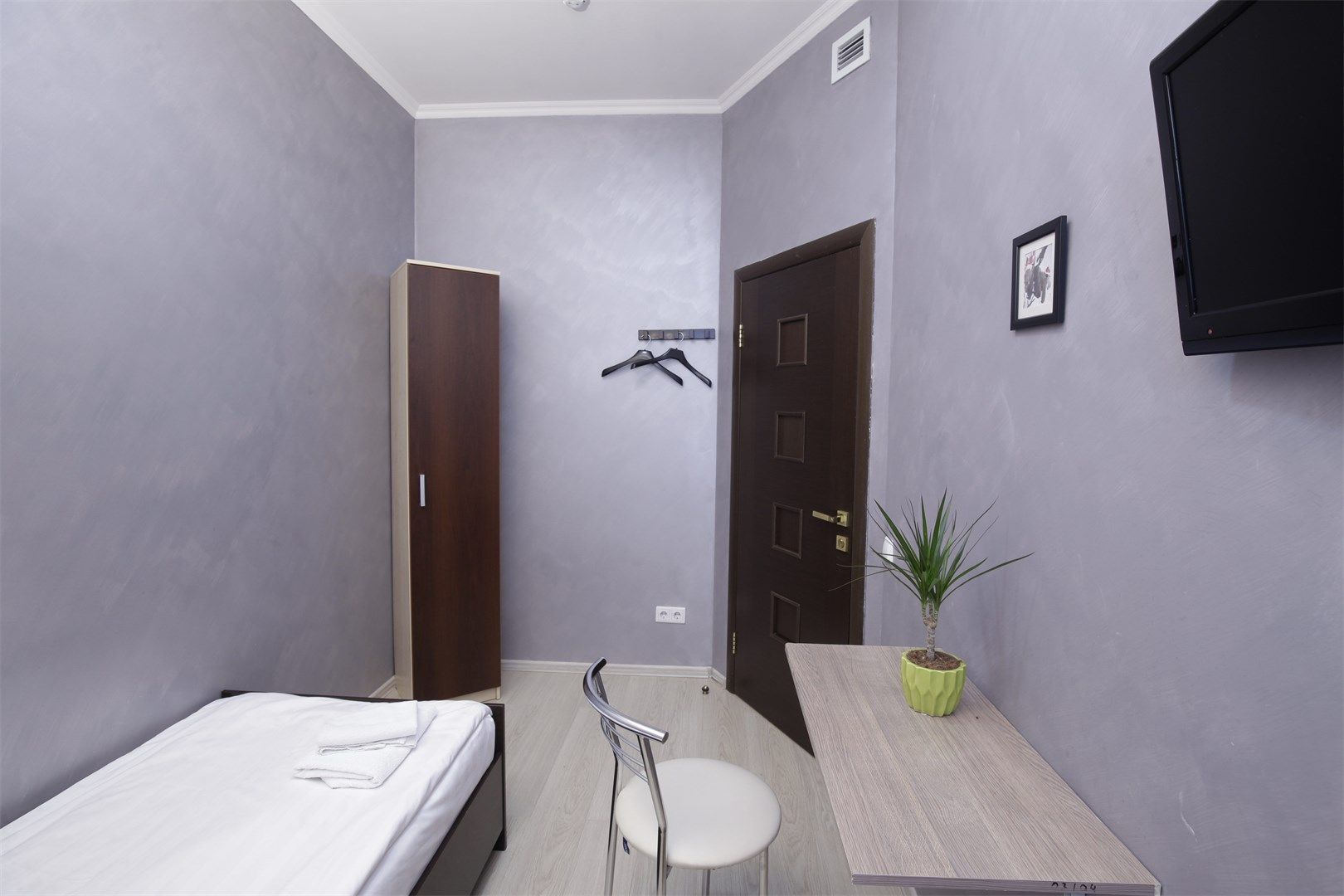 В номере: вешалка, зеркало, кровать односпальная, прикроватная тумбочка, шкаф, кондиционер, телевизор