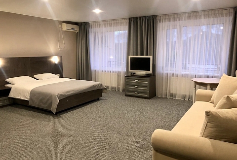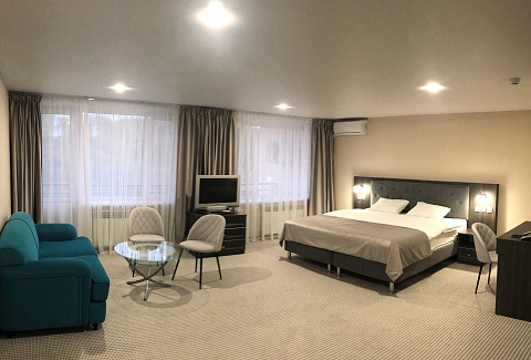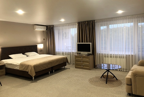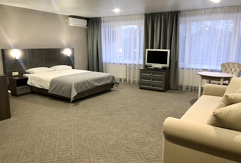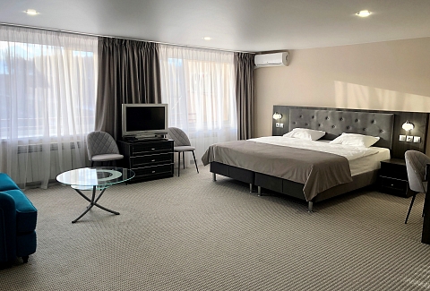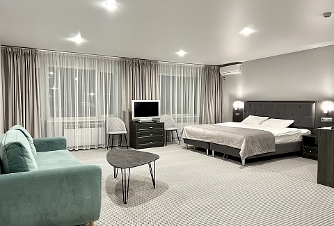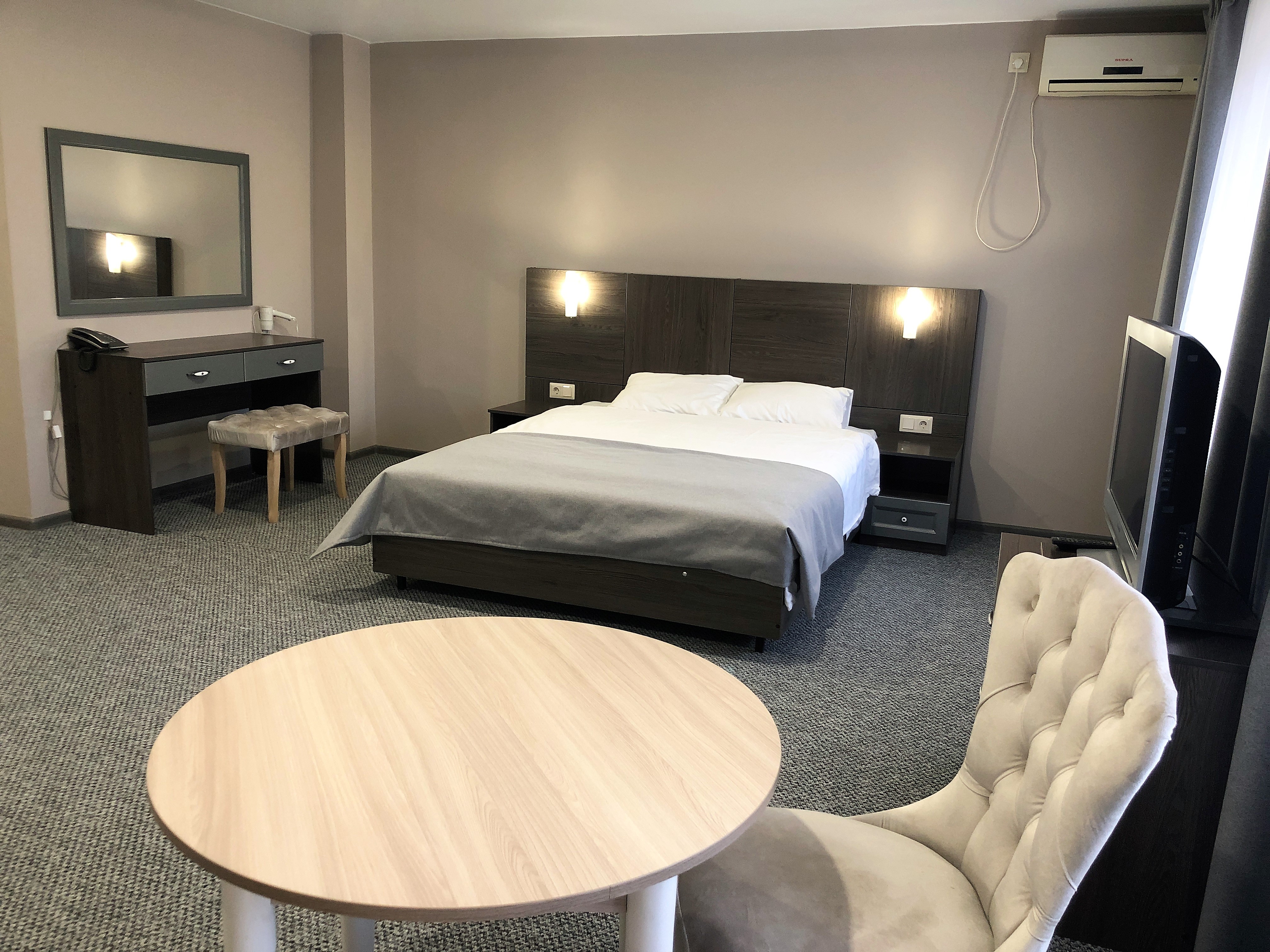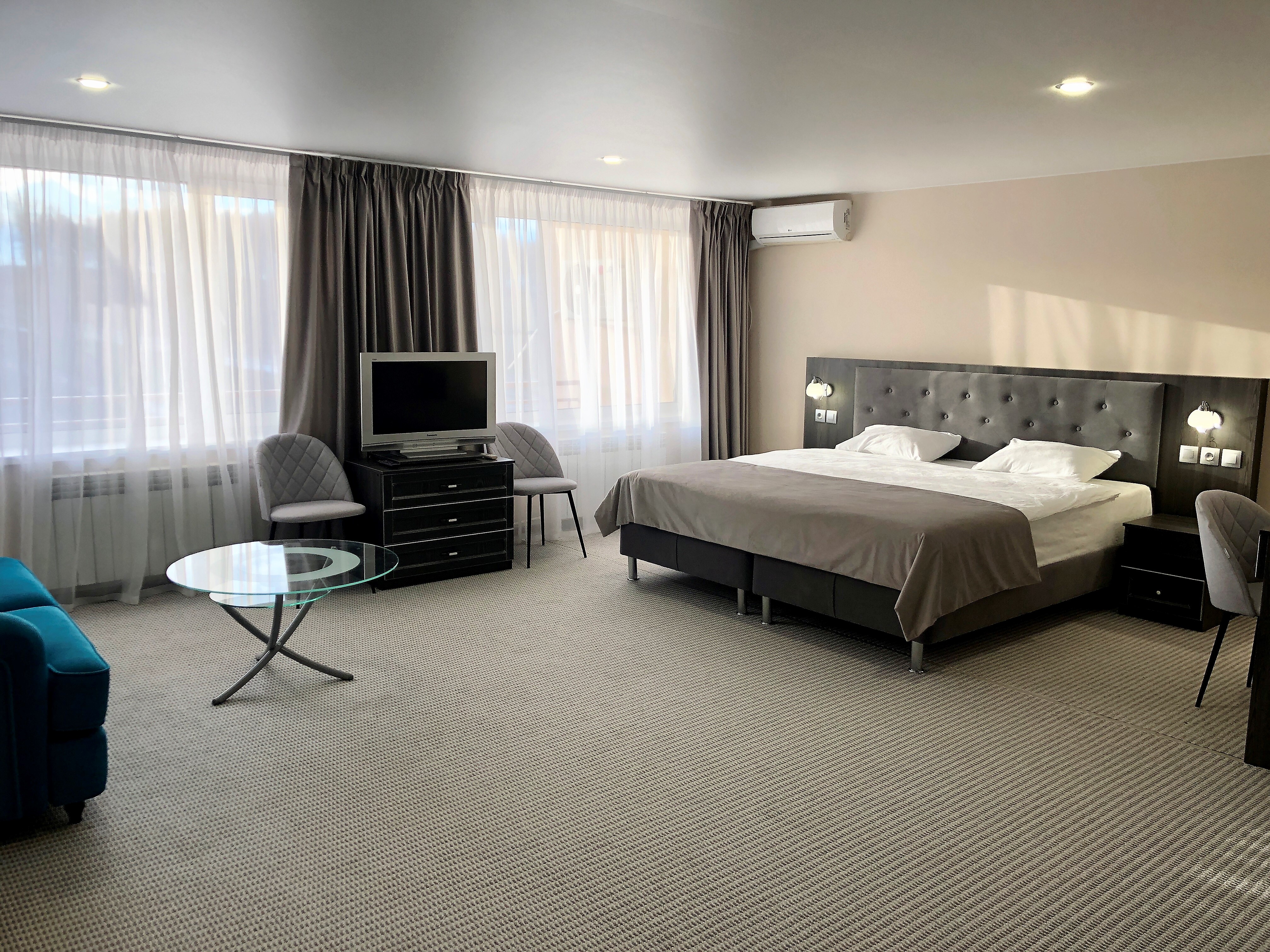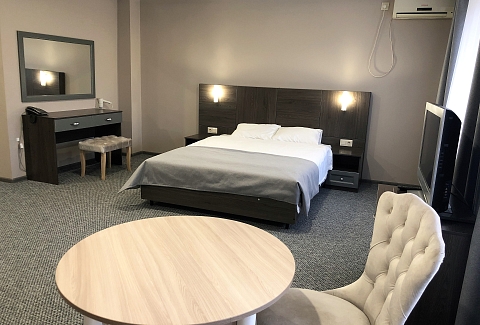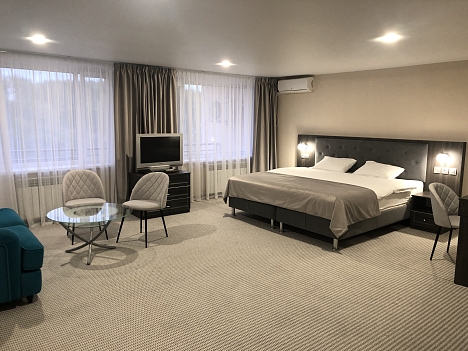В номере: вешалка, диван раскладной, зеркало, кровать двуспальная, прикроватные тумбочки, столик журнальный, стул, шкаф, кондиционер, набор посуды, телевизор, телефон, холодильник, электрочайник