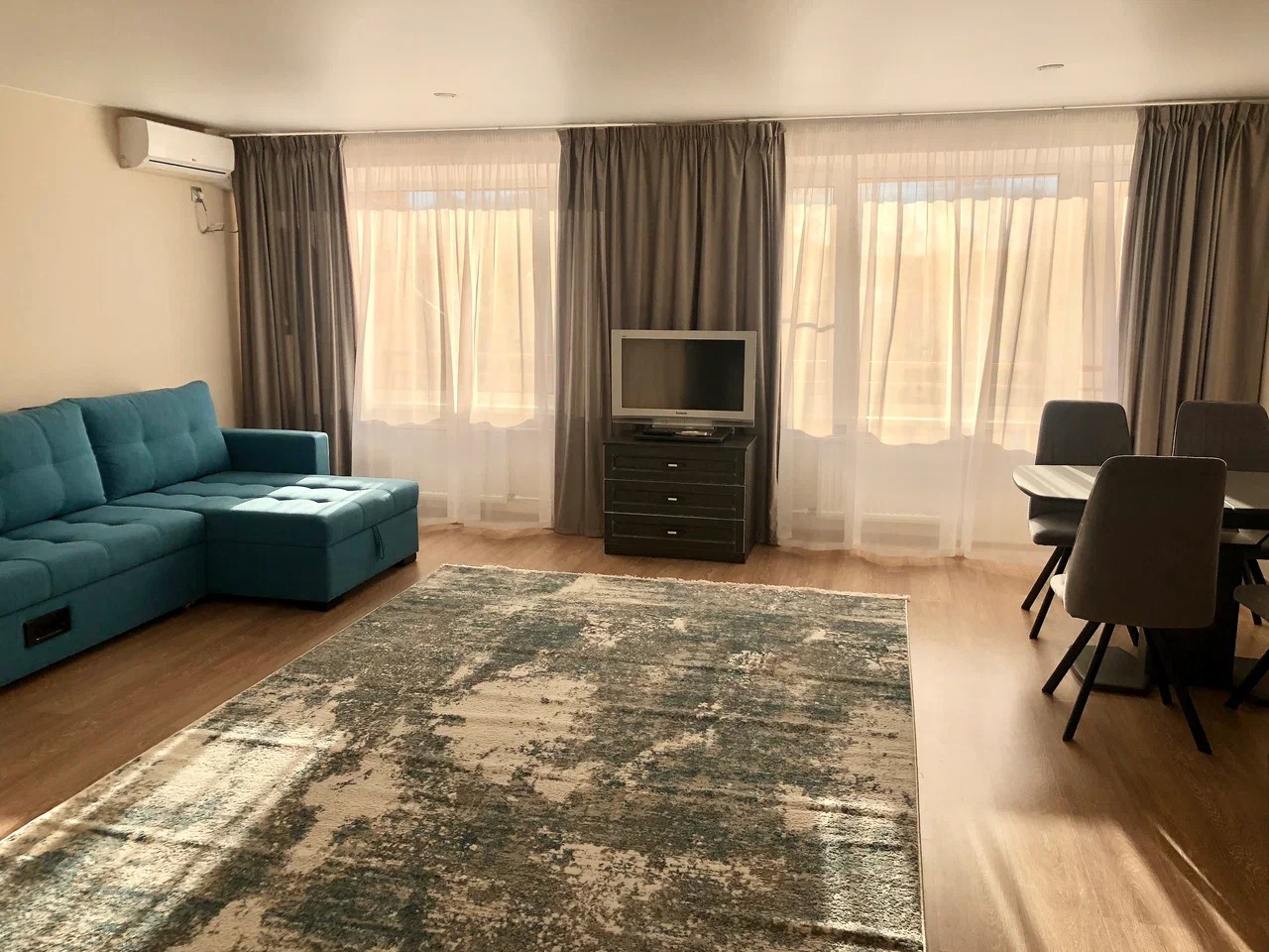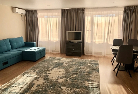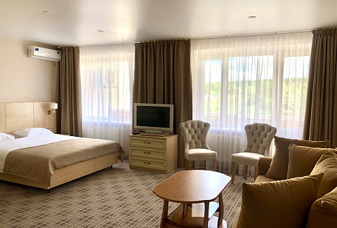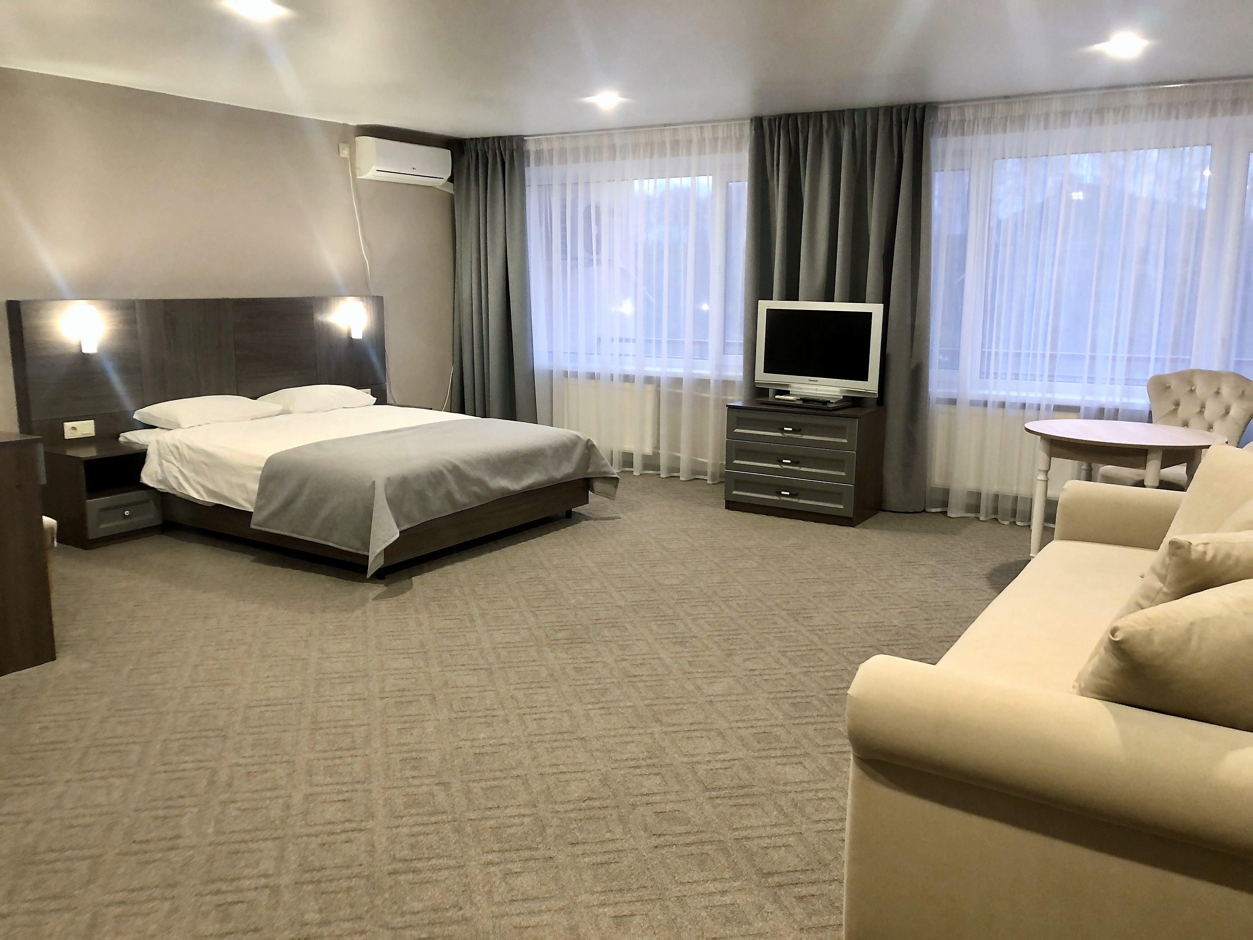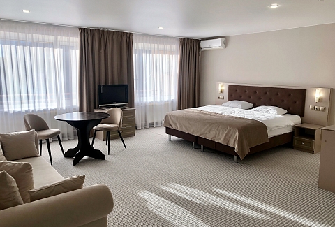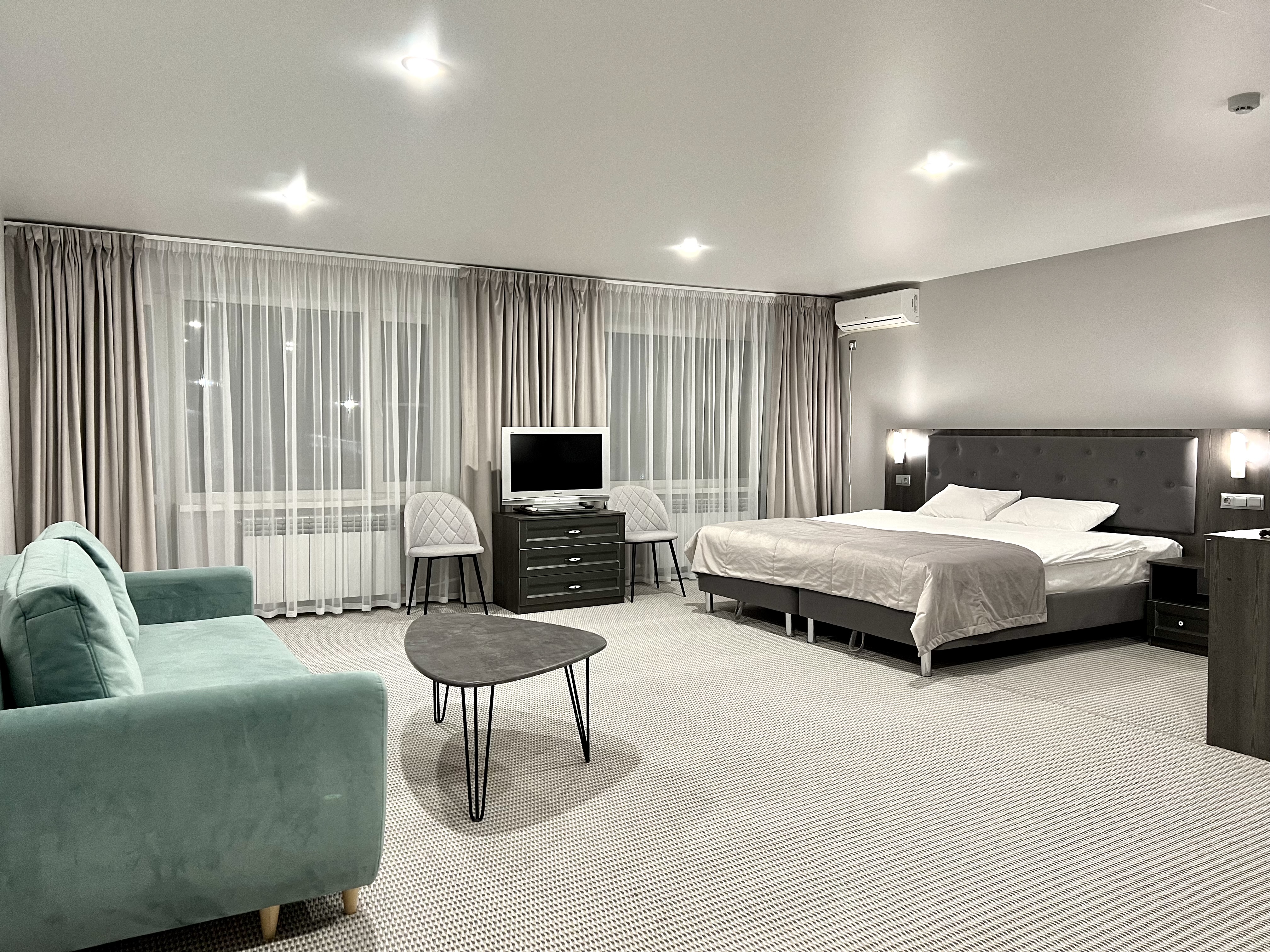В номере: вешалка, диван раскладной, зеркало, кровать двуспальная, прикроватные тумбочки, столик журнальный, стул, шкаф, кондиционер, набор посуды, телевизор, телефон, холодильник, электрочайник